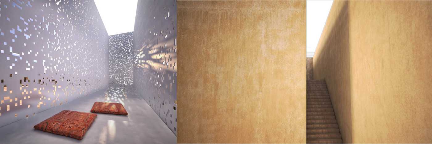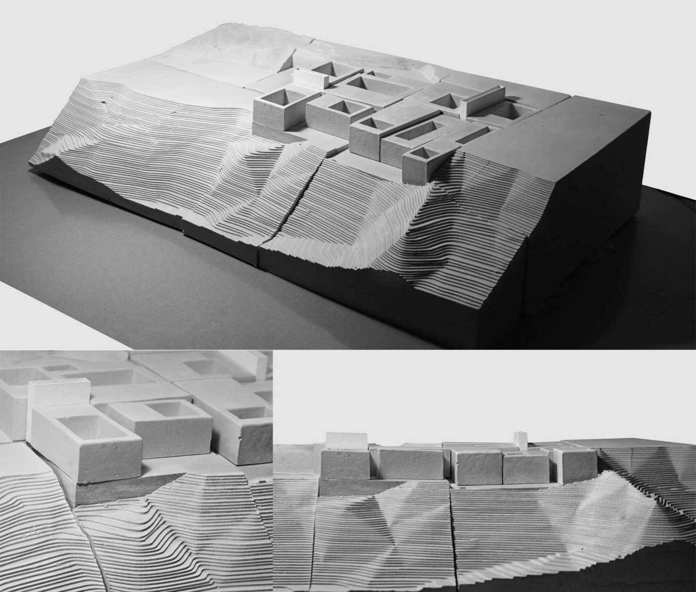 THE ROOF AND COURTYARDS | With its roof on the level of the ground and exposed to the Sun, the building acts as a continuation of the surrounding landscape, with its ups and downs, slopes, stairs and ramps. It forms a large amphitheatre under the open sky over viewing the cliffs. The only elements that rise above the terrain level and are perceived from the distance are two white meditation towers inserted amidst the houses, symbolizing peace and purity, new knowledge and referring to the two destroyed Buddha statues on the cliffs facing them. They are positioned to mark two entrances - one form the main plateau to the lobby and tea-house, and the other from the parking area in the backside of the building to the roof. As in the traditional houses, the courtyards bellow the terrain level act as an extension of the interior spaces, blurring the boundary between inside and out, and opening every room towards its own piece of the sky. On the other side, every garden is like a small stage, opened to the audience gathered on the roof.