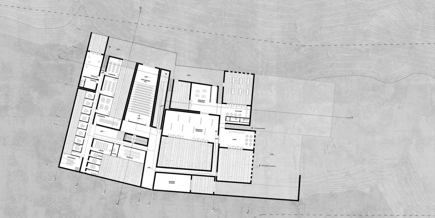 PROGRAM | Every segment houses one of the main amenities of the centre: entrance lobby, two exhibition spaces , tea-house, artwork storage, research facilities, workshop for artists, classrooms, administration offices and performance hall. The main public facilities are positioned to overview the valley (tea-house, temporary exhibition, performance hall, classroom and artists workshops), whereas the private areas (administration and research spaces along with the artworks storage) are secluded on the other side enclosed with the hill. There is a variety of combinations to walk through the building, either circulating around the exhibition rooms, strolling from the main entrance, through the exhibitions, up the staircase and towards the roof, or even directly accessing the performance hall down the ramp from the roof. The main entrance is located on the lower level of the site, and the building itself serves as its connection to the upper areas of the hill.