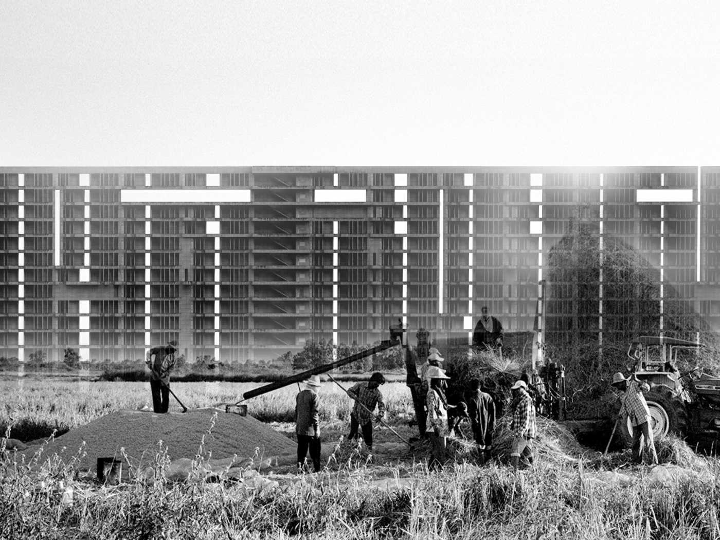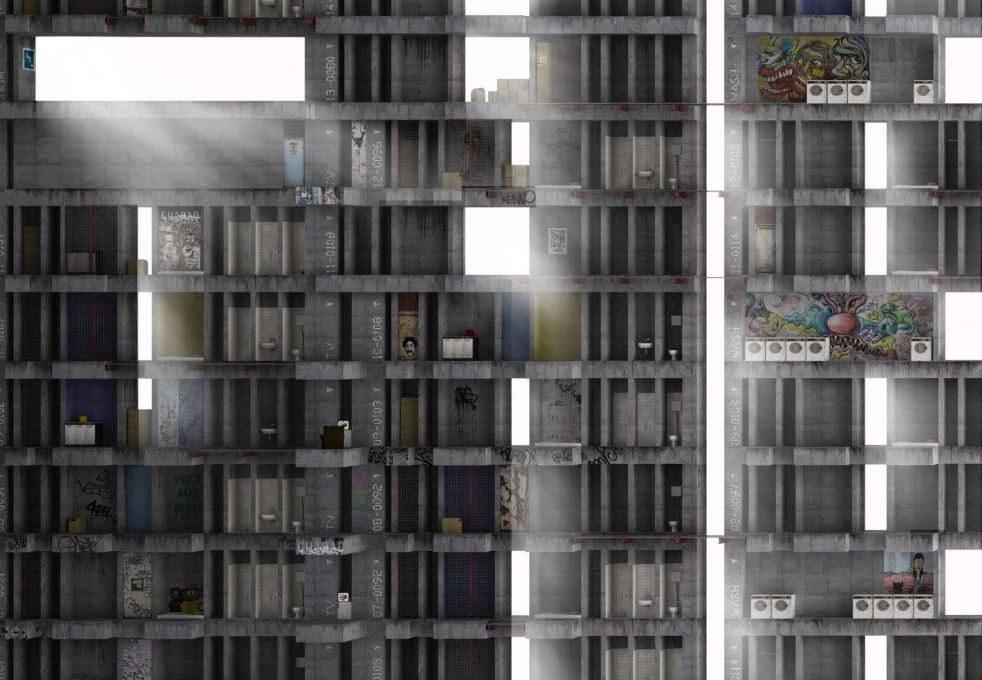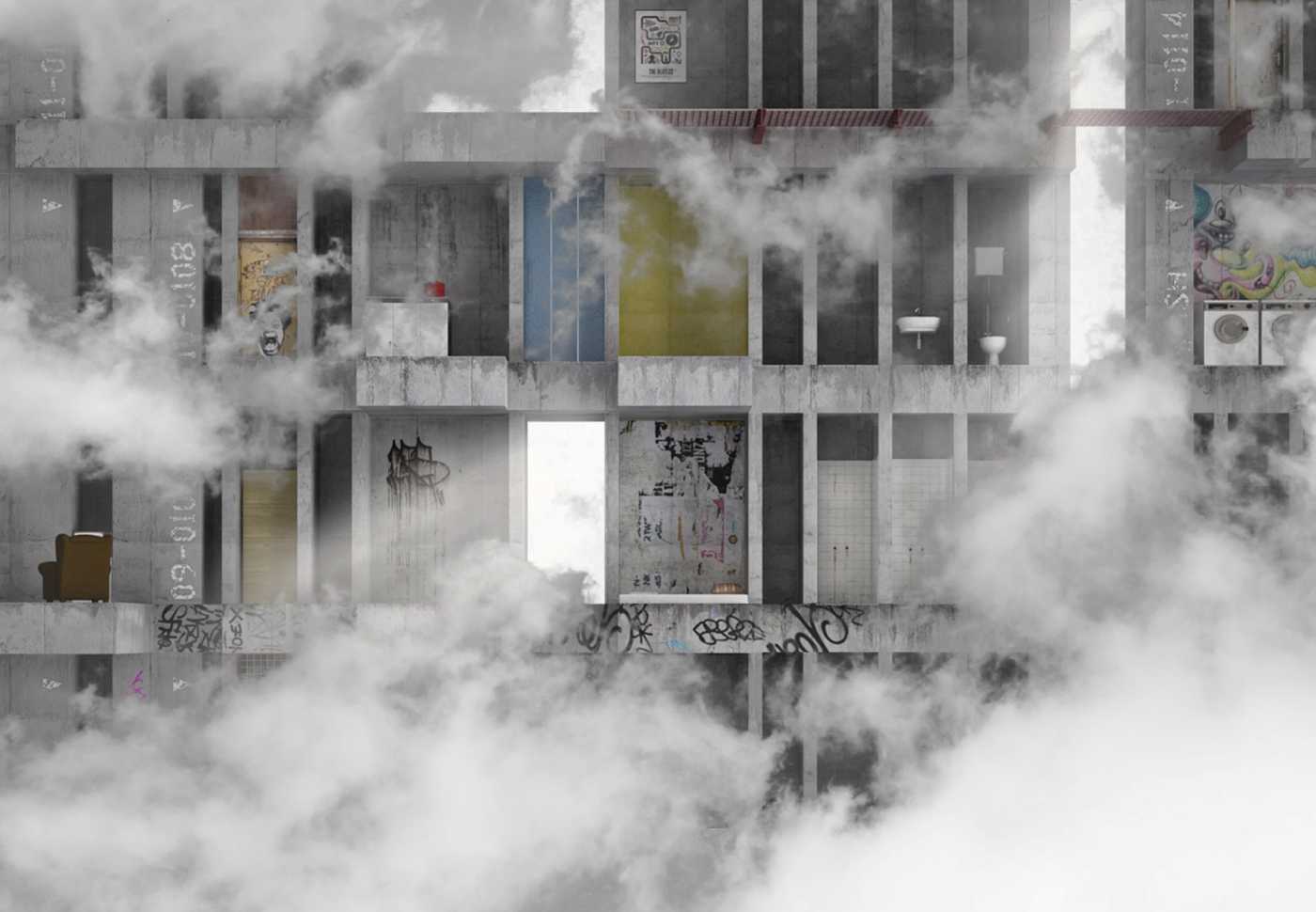Power, wealth and progress of one Nation is promoted by resolving one of the major problems it has caused to the Society. To give part of the sky to the poor. By diminishing its own flaws, the city becomes even stronger. Instead of trying to reach the highest point on the sky, the cities will compete in areas of their sky they are willing to give up in order to improve their society. This wall would become a new indicator of a city’s power. Every city gets a certain length of the wall. The longer the wall, the greater the city. The structure occupies minimum amount of the expensive land, but a significant percentage of our sky. It is a wall of infrastructure, a vertical field of voids, offering numerous places to sleep, maintain hygiene, cook and store food, store belongings, and to get one’s own permanent location on the world map. Plus endless empty space around it, the priceless sky, which paradoxically turns it into one of the most luxurious living spaces in the world. It is dimensioned and occupied according to its genetic code. Once the occupant has become independent to join the Society, he leaves. When there are no more occupants left, it is either to be torn down, reconnecting the humankind to the sky, or to remain indefinitely, and with its monumentality pose as a daily reminder to the ignorant society of the problem it actually resolves.