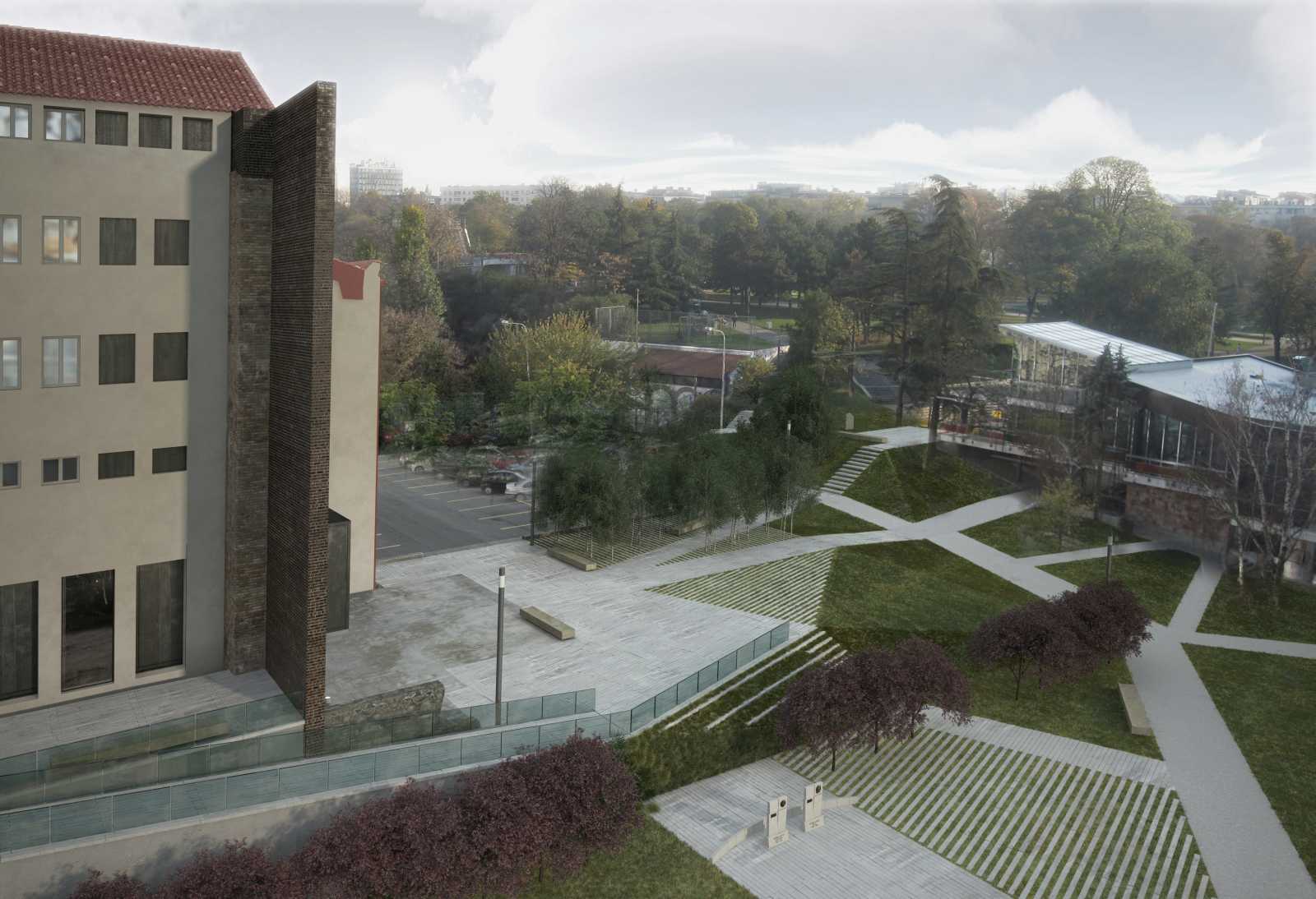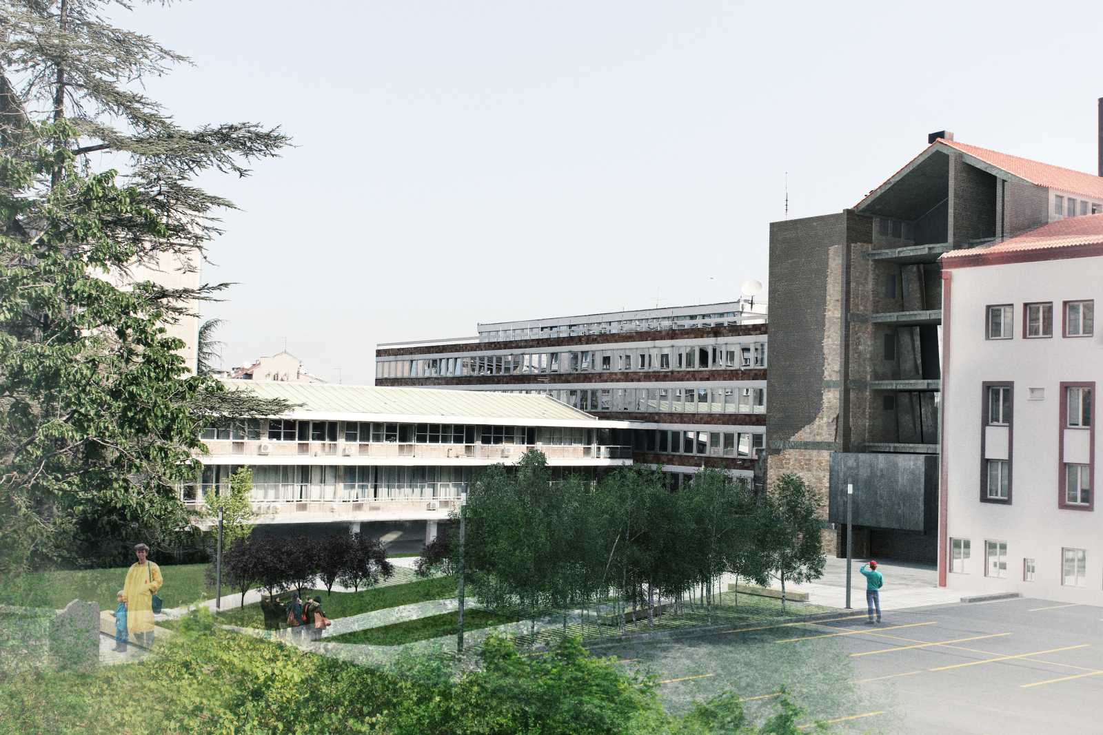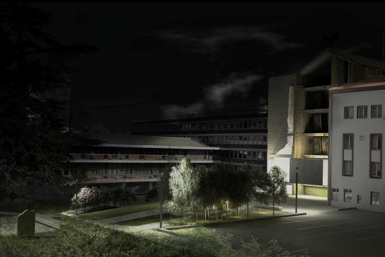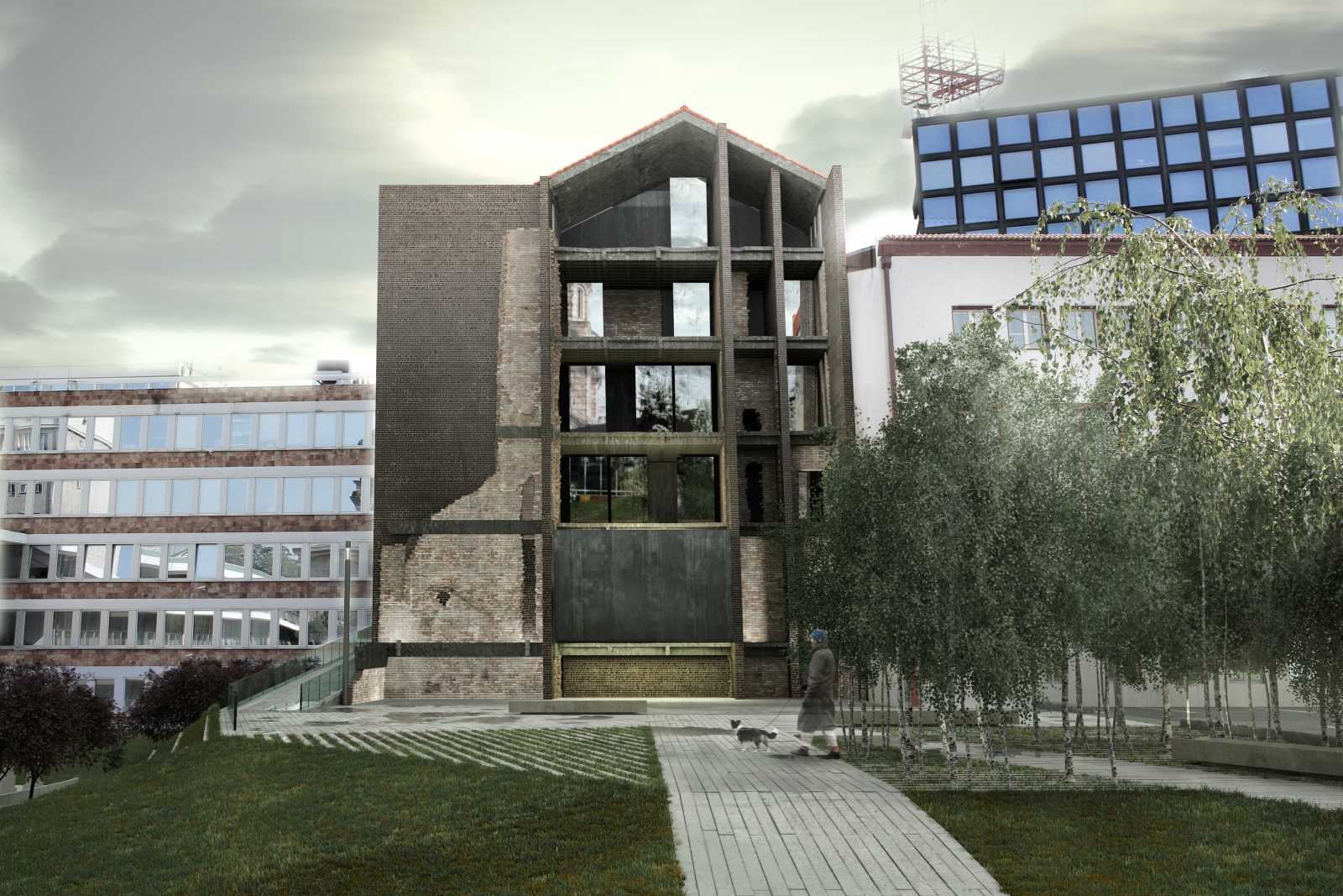 CONCEPT | This project aims to materialize the connection between two points in time: the moment of the NATO bombing of the Serbian Radio and Television Broadcasting building (RTS) in 1999 and the present time. One enclosed volume is inserted into the void at ground floor level of the ruin. It holds the exhibition to commemorate the 16 employees who tragically died during the bombing. As an attempt to capture the irreversible past, it seems entirely closed while approaching the building, but can be entered when bypassing the memorial front side. The remains of the bombed building are to be preserved and exposed to the city. The addition of the brown brick walls emphasize the bearing structure and turn the very building into both a monument and a historical document of the past events. The ruin forms a part of the present, reflecting the transience of everyday life in the mirrors placed on its upper floors. The hole in the ground left after the bombing is patched with concrete and engraved with the names of the victims. It continues into the geometrically shaped topography - an artificial extension of the Tašmajdan park towards the memorial space. Unifying the two existing monuments on this site from previous years this project completes the whole of the Memorial that keeps the memory of this tragic event and its victims.
