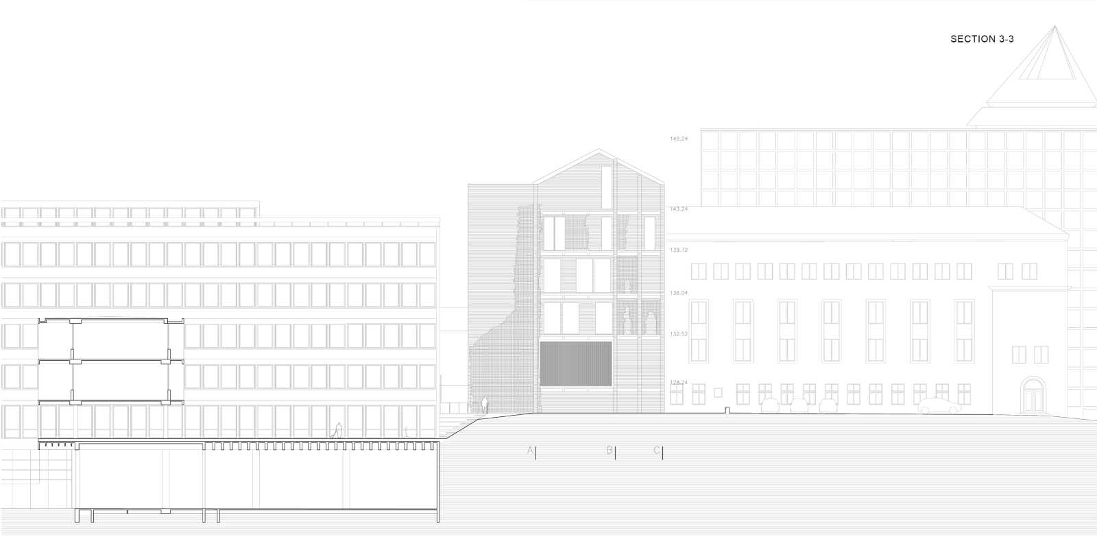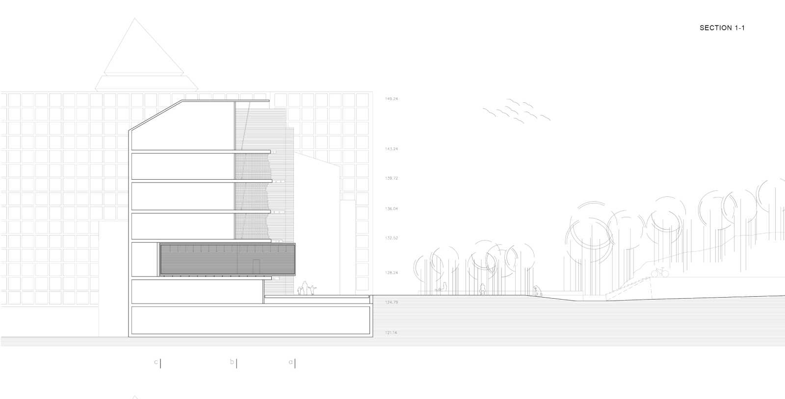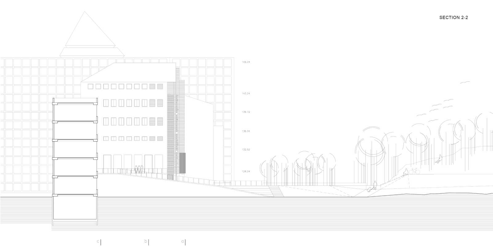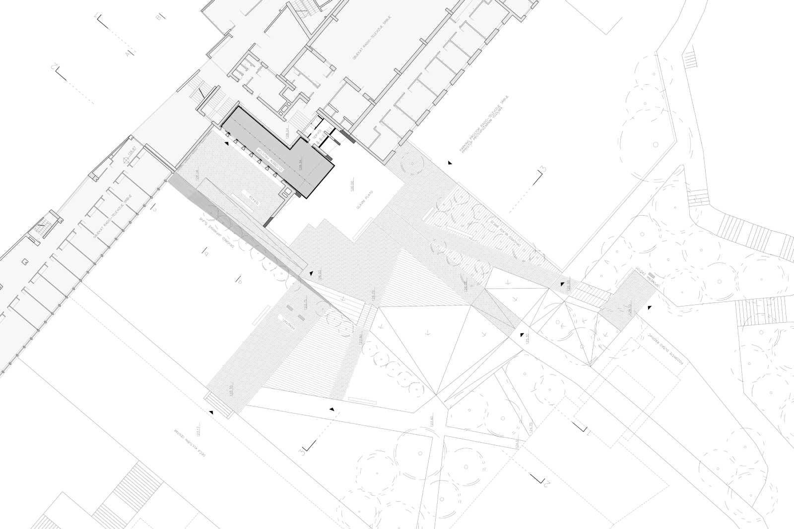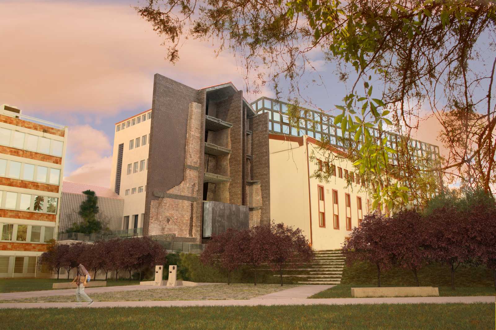 CONCEPT | This project aims to materialize the connection between two points in time: the moment of the NATO bombing of the Serbian Radio and Television Broadcasting building (RTS) in 1999 and the present time. One enclosed volume is inserted into the void at ground floor level of the ruin. It holds the exhibition to commemorate the 16 employees who tragically died during the bombing. As an attempt to capture the irreversible past, it seems entirely closed while approaching the building, but can be entered when bypassing the memorial front side. The remains of the bombed building are to be preserved and exposed to the city. The addition of the brown brick walls emphasize the bearing structure and turn the very building into both a monument and a historical document of the past events. The ruin forms a part of the present, reflecting the transience of everyday life in the mirrors placed on its upper floors. The hole in the ground left after the bombing is patched with concrete and engraved with the names of the victims. It continues into the geometrically shaped topography - an artificial extension of the Tašmajdan park towards the memorial space. Unifying the two existing monuments on this site from previous years this project completes the whole of the Memorial that keeps the memory of this tragic event and its victims.