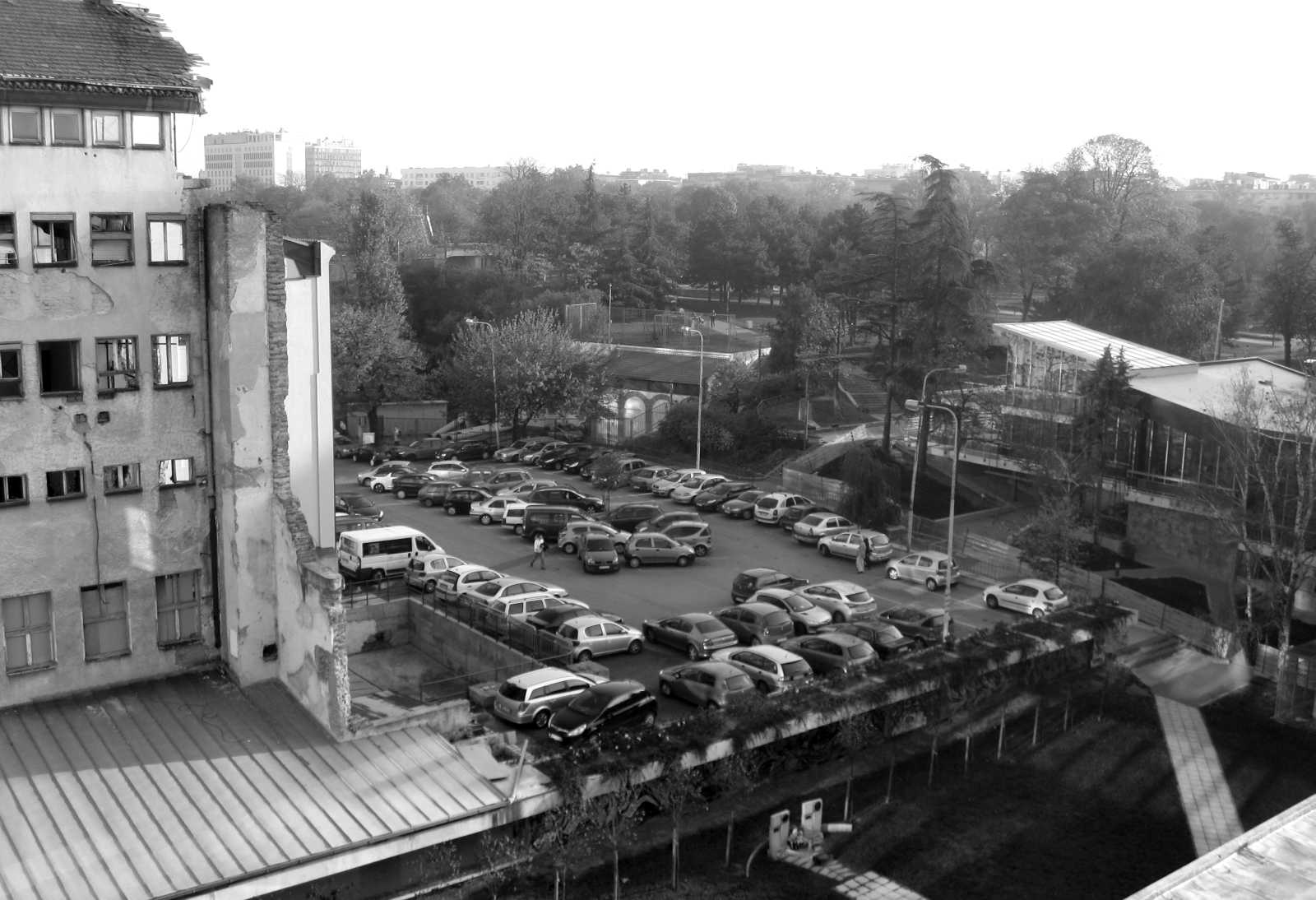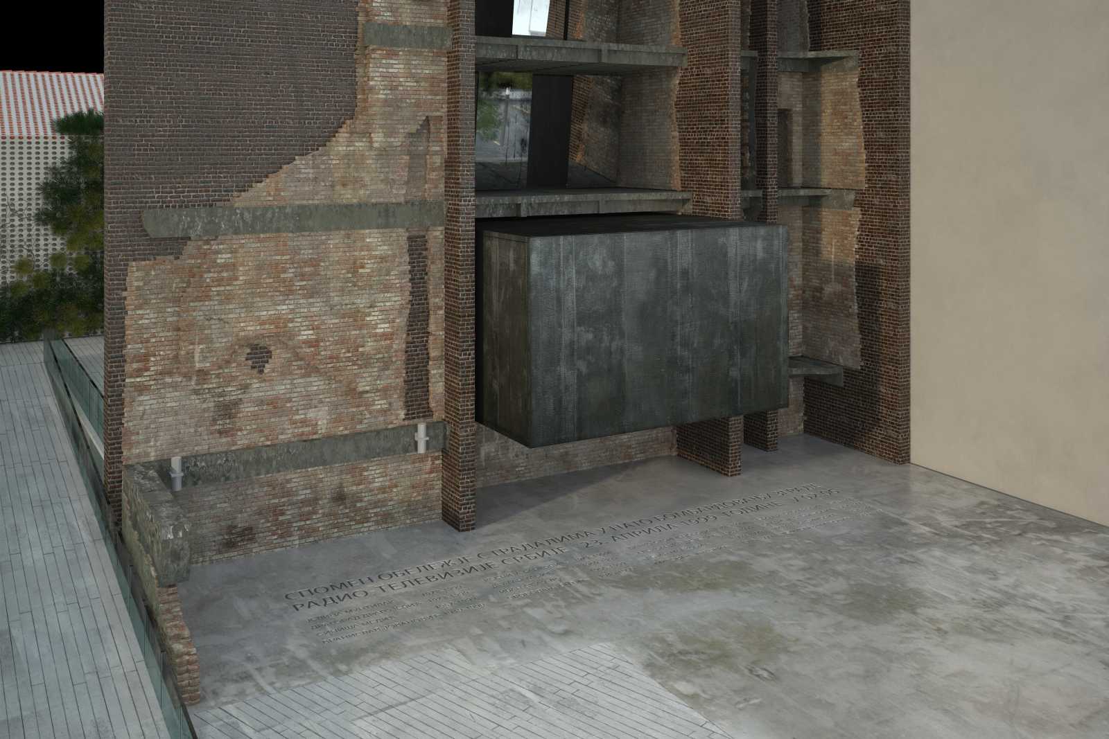 OPIS PROJEKTA | Porušeni deo objekta predviden je da se konzervira u stanju u kojem se trenutno nalazi i da se zidovi upravni na plato dozidaju kako bi se sprecilo njihovo dalje odronjavanje i naglasila njihova vertikalnost i pozicija u odnosu na originalno stanje zgrade pre rušenja. Na ovaj nacin sama ruševina postaje u isto vreme i dokument o tragicnom dogadaju i spomenik posvecen njemu. Na nekadašnjoj prizemnoj etaži objekta se nalazi jedini zatvoreni prostor memorijala, jedna soba koja je umetnuta u ruševinu i minimalno ometa njeno postojece stanje. Sve etaže iznad su fizicki nepristupacne posmatracu i na svakoj od njih su postavljeni reflektujuci paneli, ogledala u kojima se mestimicno nazire Tašmajdanski park i Crkva Svetog Marka. Cilj ogledala je da vizuelno omekšaju strašnu sliku ruševine i u nju uvedu neprestanu promenljivost sadašnjeg trenutka. Direktno eksponirani zidovi predstavljaju mesto na kojem posetioci mogu odati poštu stradalima, dodirnuti ruševinu i hodati po tlu na kojem se stradanje desilo. Plato ispred nje ostavlja prostora njenom nesmetanom sagledavanju, i stavlja je u poziciju muzejskog eksponata grada. Zatvoreni prostor memorijala je jedna soba namenjena izlaganju dokumenata o tragicnom dogadaju. Nepristupacna i potpuno zatvorena sa pristupne strane spomen-obeležja, deo je prostora koji je nekada tu postojao, i predstavlja pokušaj da se secanje sacuva u fizickom prostoru. Istovremeno, ona je podsetnik na vreme koje ne možemo vratiti i dogadaje koje ne možemo u potpunosti razumeti. Prilaz je predviden sa bocne strane objekta, pešackom rampom sa glavnog platoa iza ruševine. Na istoj etaži planiran je i manji servisni prostor - garderoba i toalet, kojima se pristupa direktno iz zatvorenog prostora memorijala.