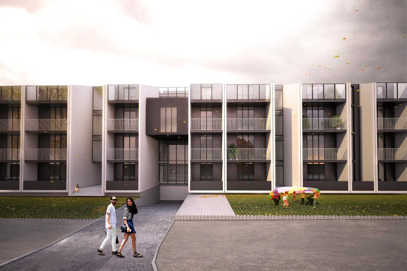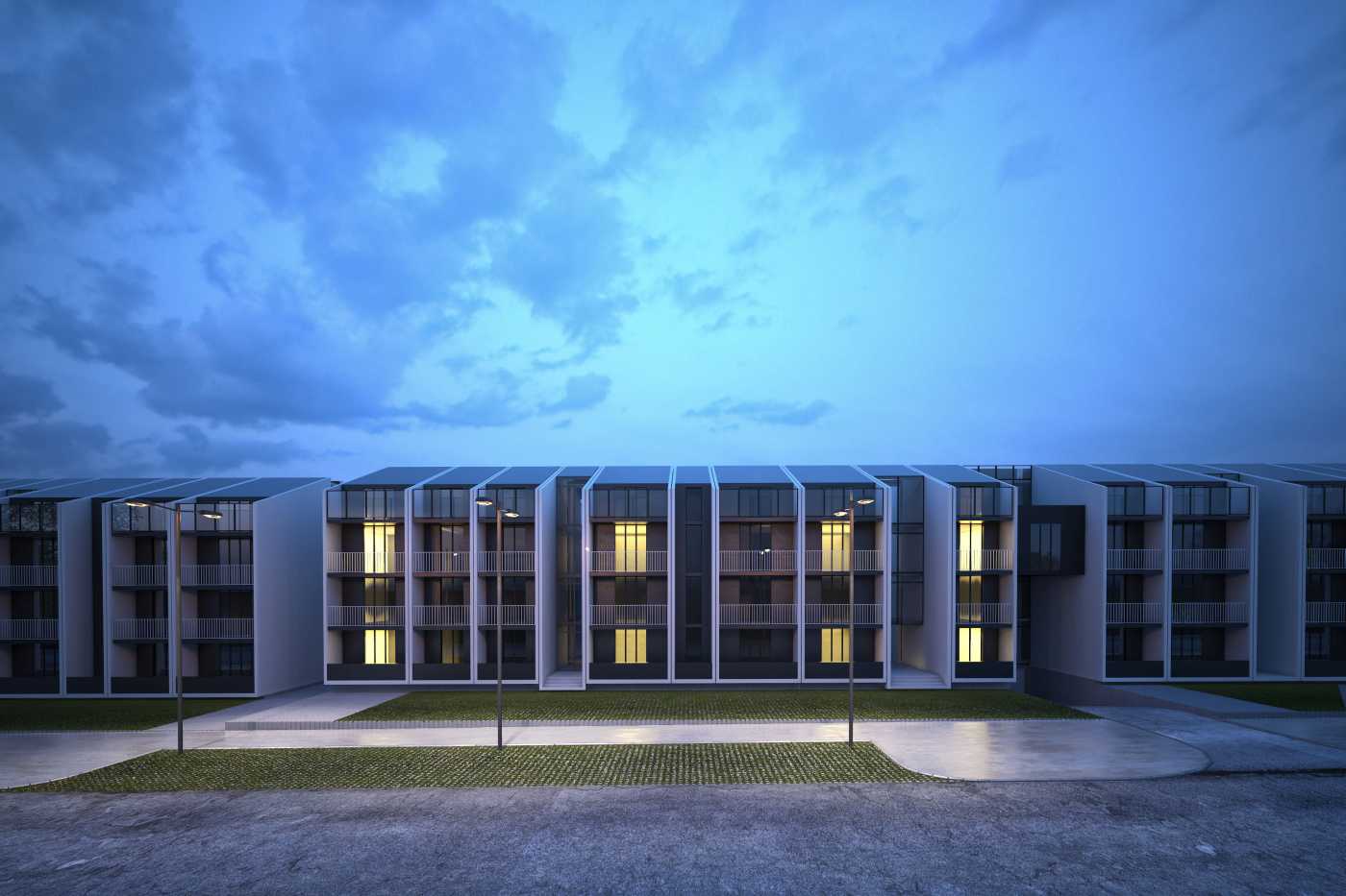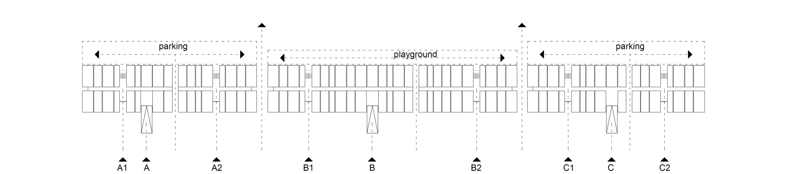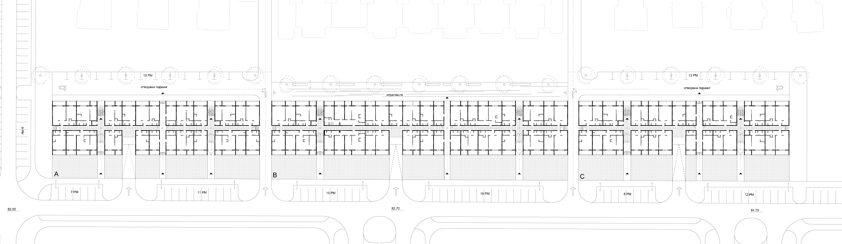 URBANISTIČKO REŠENJE | Lokacija objekta je upravna na pravac puteva koji povezuju dva načina dolaska iz centralne zone Beograda, sa jugozapadne strane vozom, a sa severoistočne automobilom ili javnim prevozom, autoputem i Batajničkim drumom. Na samoj parceli su jasno vidljive pešačke staze koje je presecaju povezujući dve ''polovine'' naselja - železnicku stanicu i Zemun polje sa jedne strane, sa drumskim prilazom i naseljom Kamendin sa druge. Propustljivost novog objekta ima za cilj da podrži kretanje pešaka izmedu ove dve celine, te su zato elementi koji čine njegovu strukturu postavljeni paralelno sa ovim pravcem. Na ovaj način sve jedinice su upravne na osnovnu pristupnu Ulicu Akrobate Aleksića, a njihovim razmicanjem se ostvaruju poprečne veze sa zadnjim dvorištem - u kojem je smešten parking na otvorenom, sa leve i desne strane, i centralno podužno dečije igralište u samoj sredini bloka, ušuškano objektom, visokim zelenilom i baštama susednih parcela. Sa prednje strane objekta je otvoreno pristupno dvorište jedinicama, koje služi kao vazdušna pauza između stanova, i ulice i uličnog parkinga. Kako je nagib Ulice Akrobate Aleksica od jednog do drugog kraja parcele 2.7m, pristupno dvorište i sami objekti su visinski pozicionirani kaskadno - u tri celine, odnosno lamele A, B i C, svaka sa svojom pripadajućom garažom. Kota prizemlja svake lamele je na najnižoj koti ulice na visini od 1.2m od terena - gde i dostiže maksimalnu dozvoljenu visinu venca 11.5m, dok je na najnižoj u visini sa terenom, što sa te starne omogućava nesmetani pristup objektu licima sa posebnim potrebama. Svaka lamela ima (1) dva ulaza, levi na višoj koti sa stepenišnim pristupom, i desni, na koti terena sa minimalnom rampom; (2) pešački prolaz ka zadnjem dvorištu u prizemlju; (3) pristup garaži sa Ulice Akrobate Aleksića. Između lamela su kolski pristupi otvorenom parkingu iza objekata, koji su pozicionirani tako da se nastavljaju na dve postojece, sada slepe ulice, iz pravca Ulice Tomice Popovica.