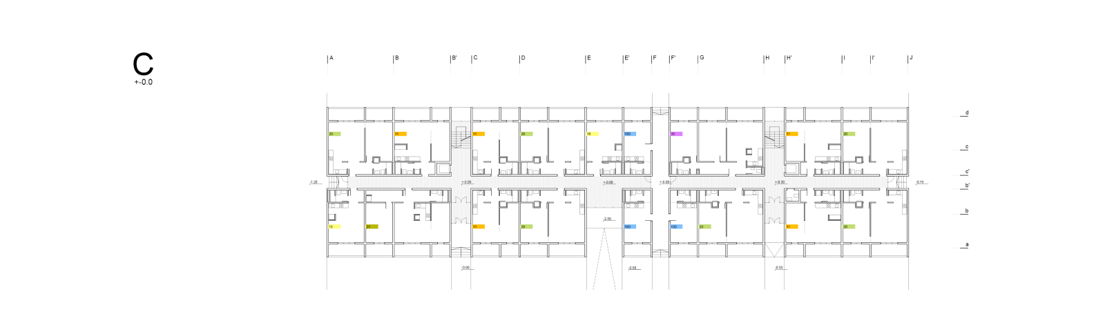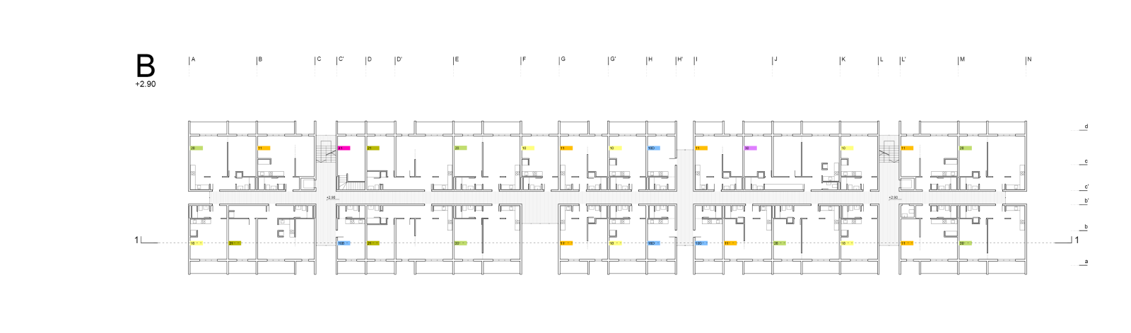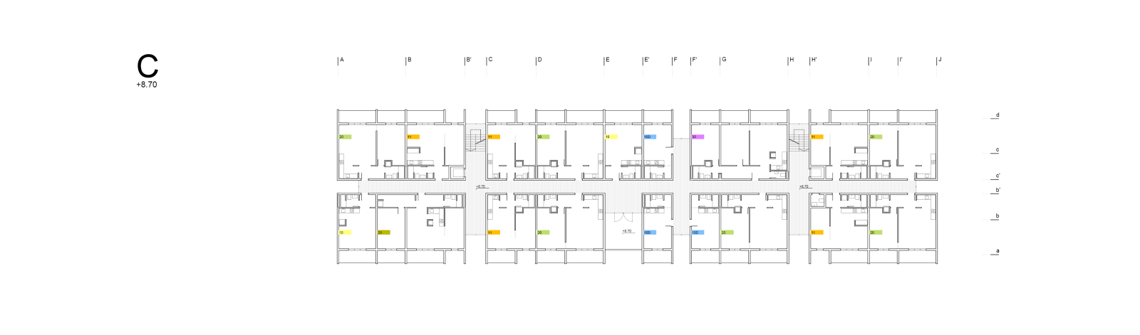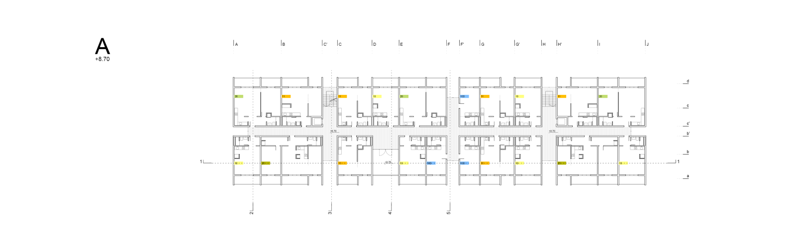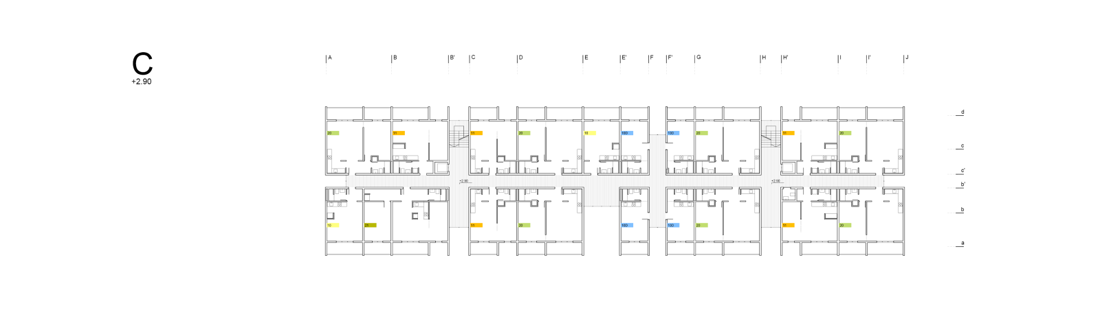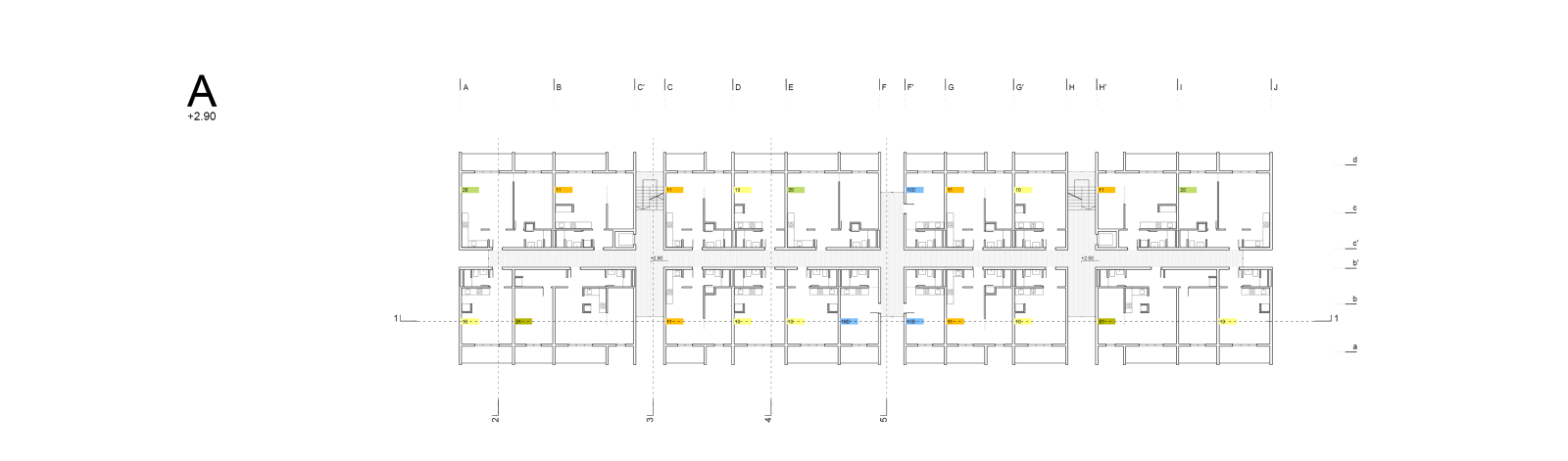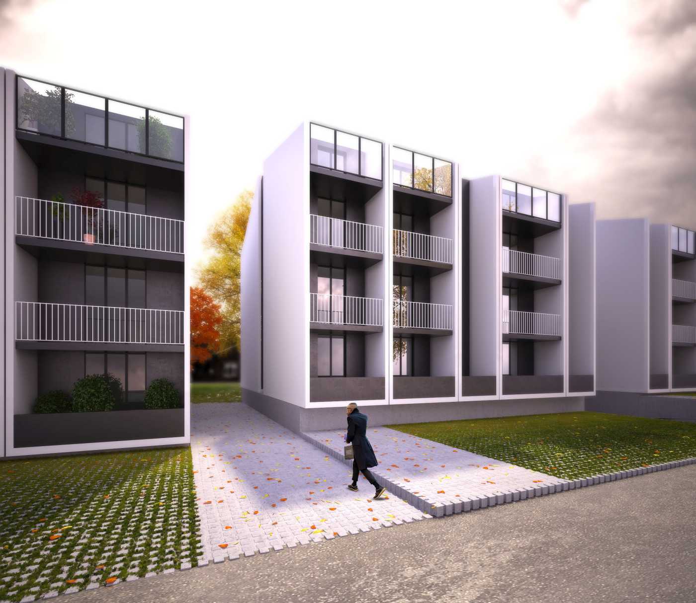 ORGANIZACIJA STAMBENIH JEDINICA | Svaka lamela podeljena je centralnim pristupnim hodnikom na dva niza stanova, tako da su uz hodnik u dubini objekta grupisane servisne prostorije, kupatila, toaleti i ulazni prostori, dok su dnevni prostori, prostori za obedovanje i spavanje orijentisani ka glavnim fasadama dubine do 4.85m, prirodno osvetljeni i provetreni. Osam tipova stanova (garsonjere, jednosobni, jednoiposobni, dvosobni, dvoiposobni, trosobni, troiposobni i četvoroiposobni) su po dužini organizovani na tri osnovna tipska rastera - 3.3m za minimalne dnevne sobe, spavaće sobe i garsonjere, 4.4m za dnevne sobe u stanovima sa više kvadrata, i 2.2m za takozvane „polu-sobe“ pripojene osnovnom prostoru stana. Na taj nacin stanovi svake lamele dobijeni su podelom na ova tri tipska rastera, ritmično, a prema potrebi specifičnih stanova (4.4 - 3.3 - 4.4 - 2.2 - 3.3 - 2.2 - ... itd.). Na isti način je rešena podzemna garaža, smenjivanjem tipskih rastera (7.7m su tri parking mesta, 5.5m su dva, a 9.9 su četiri parking mesta). Razmicanjem stambenih jedinica dobijeni su prolazi kroz zgradu, i ulazi u prizemlju, a na spratovima zajednički prostori za stanare - za ostavljanje bicikala i zajedničke staklene bašte. Ulazi u garaže su rešeni „umetanjem“ jednog ili dva stana po visini na mestu pristupne rampe, dok je prizemlje i potkrovlje uvek čisto, te je na potkrovlju velika zajednička terasa - sušionica i prostor za okupljanja stanara. Svaki stan ima mogućnost proširenja u vidu terase (a radi ekonomičnosti rešenja, moguće je graditi i potpuno bez terasa), sa varijacijama u tipu terase po spratovima. U prizemlju terase su ograđene punim zidom radi intimnosti, na spratovima metalnom ogradom, dok je u potkrovlju mala krovna lođa - izdvojena staklenom ogradom i sa otvorenim pogledom na nebo.