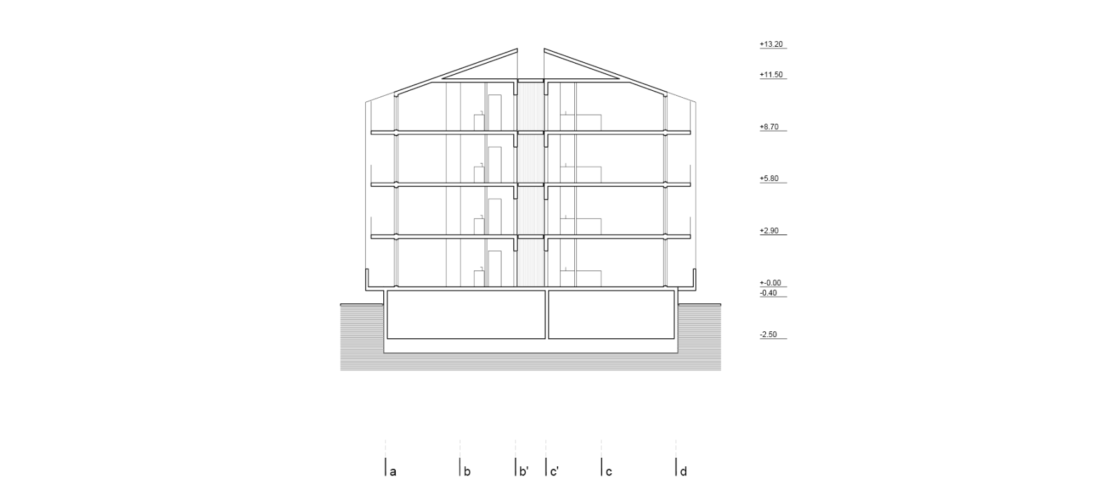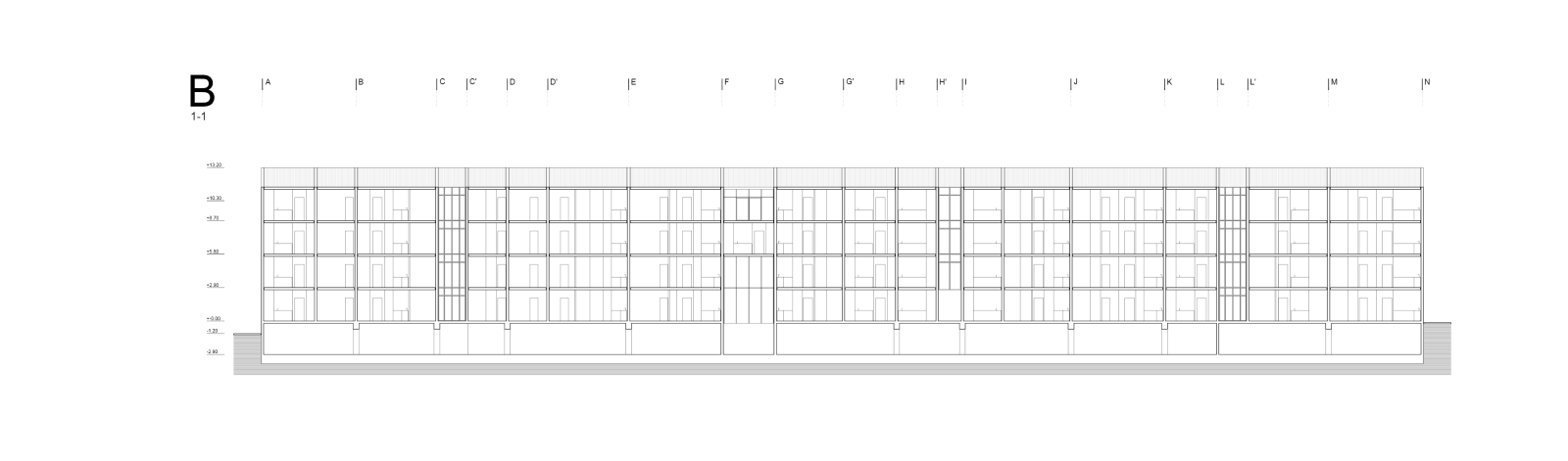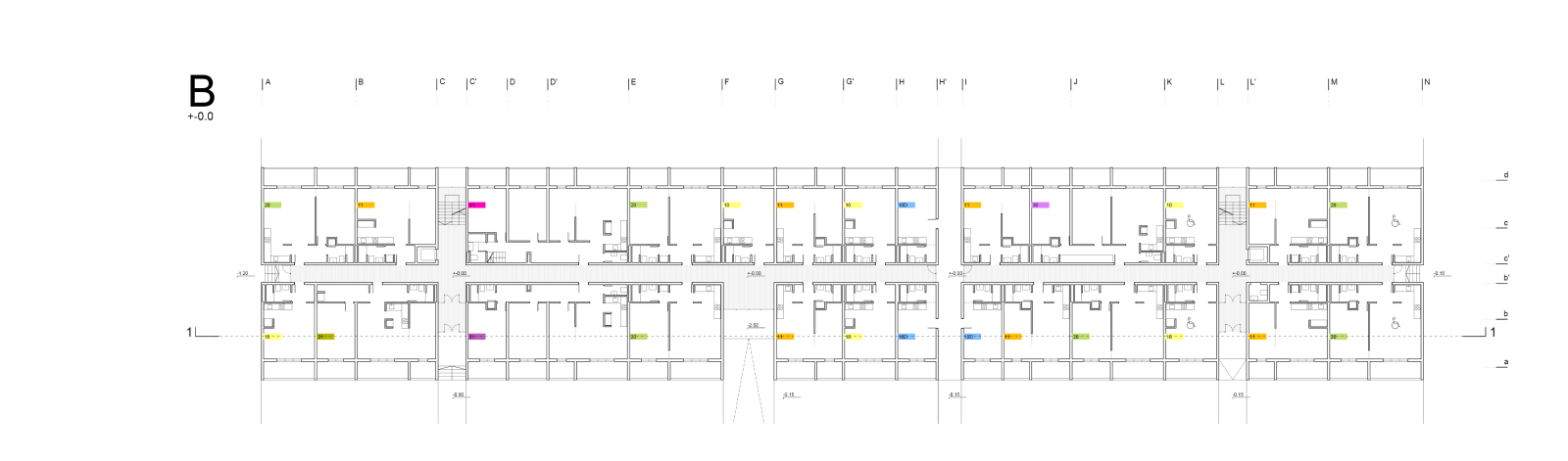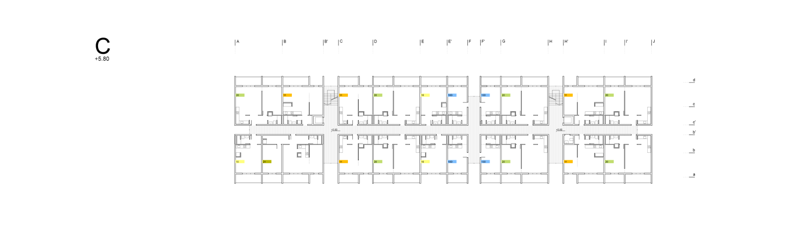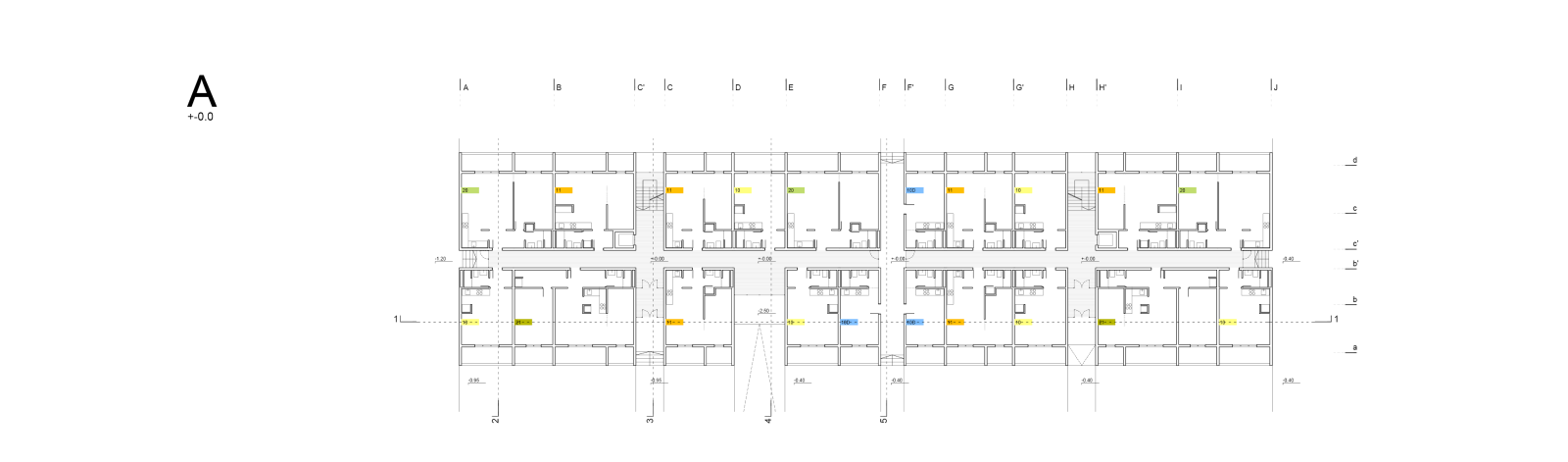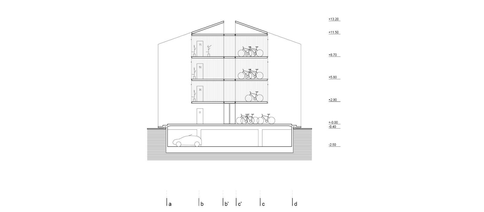 ORGANIZACIJA STAMBENIH JEDINICA | Svaka lamela podeljena je centralnim pristupnim hodnikom na dva niza stanova, tako da su uz hodnik u dubini objekta grupisane servisne prostorije, kupatila, toaleti i ulazni prostori, dok su dnevni prostori, prostori za obedovanje i spavanje orijentisani ka glavnim fasadama dubine do 4.85m, prirodno osvetljeni i provetreni. Osam tipova stanova (garsonjere, jednosobni, jednoiposobni, dvosobni, dvoiposobni, trosobni, troiposobni i četvoroiposobni) su po dužini organizovani na tri osnovna tipska rastera - 3.3m za minimalne dnevne sobe, spavaće sobe i garsonjere, 4.4m za dnevne sobe u stanovima sa više kvadrata, i 2.2m za takozvane „polu-sobe“ pripojene osnovnom prostoru stana. Na taj nacin stanovi svake lamele dobijeni su podelom na ova tri tipska rastera, ritmično, a prema potrebi specifičnih stanova (4.4 - 3.3 - 4.4 - 2.2 - 3.3 - 2.2 - ... itd.). Na isti način je rešena podzemna garaža, smenjivanjem tipskih rastera (7.7m su tri parking mesta, 5.5m su dva, a 9.9 su četiri parking mesta). Razmicanjem stambenih jedinica dobijeni su prolazi kroz zgradu, i ulazi u prizemlju, a na spratovima zajednički prostori za stanare - za ostavljanje bicikala i zajedničke staklene bašte. Ulazi u garaže su rešeni „umetanjem“ jednog ili dva stana po visini na mestu pristupne rampe, dok je prizemlje i potkrovlje uvek čisto, te je na potkrovlju velika zajednička terasa - sušionica i prostor za okupljanja stanara. Svaki stan ima mogućnost proširenja u vidu terase (a radi ekonomičnosti rešenja, moguće je graditi i potpuno bez terasa), sa varijacijama u tipu terase po spratovima. U prizemlju terase su ograđene punim zidom radi intimnosti, na spratovima metalnom ogradom, dok je u potkrovlju mala krovna lođa - izdvojena staklenom ogradom i sa otvorenim pogledom na nebo.