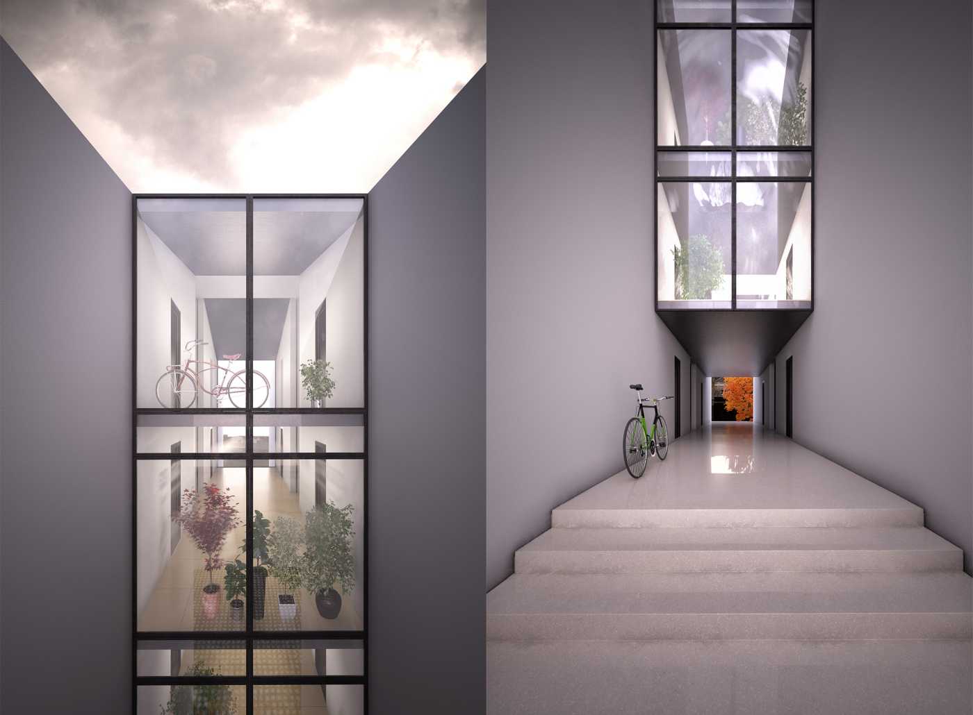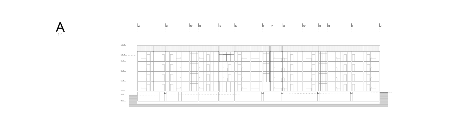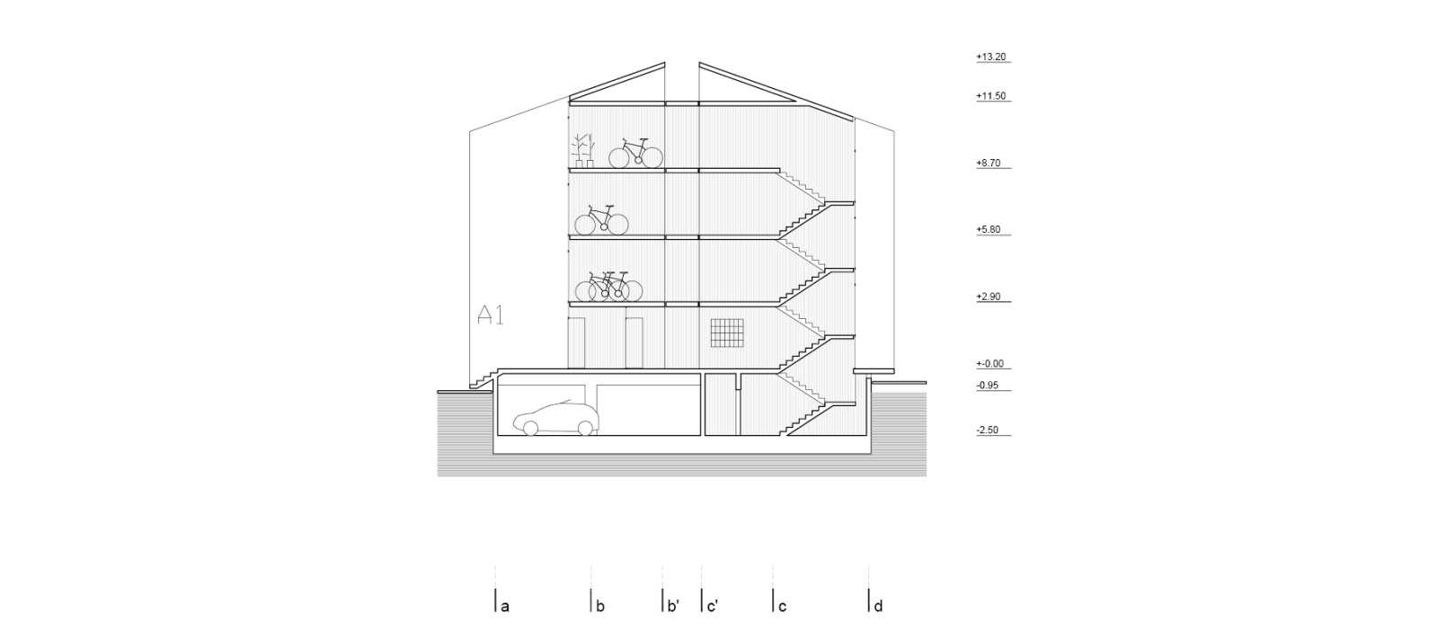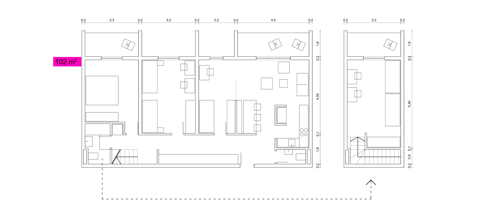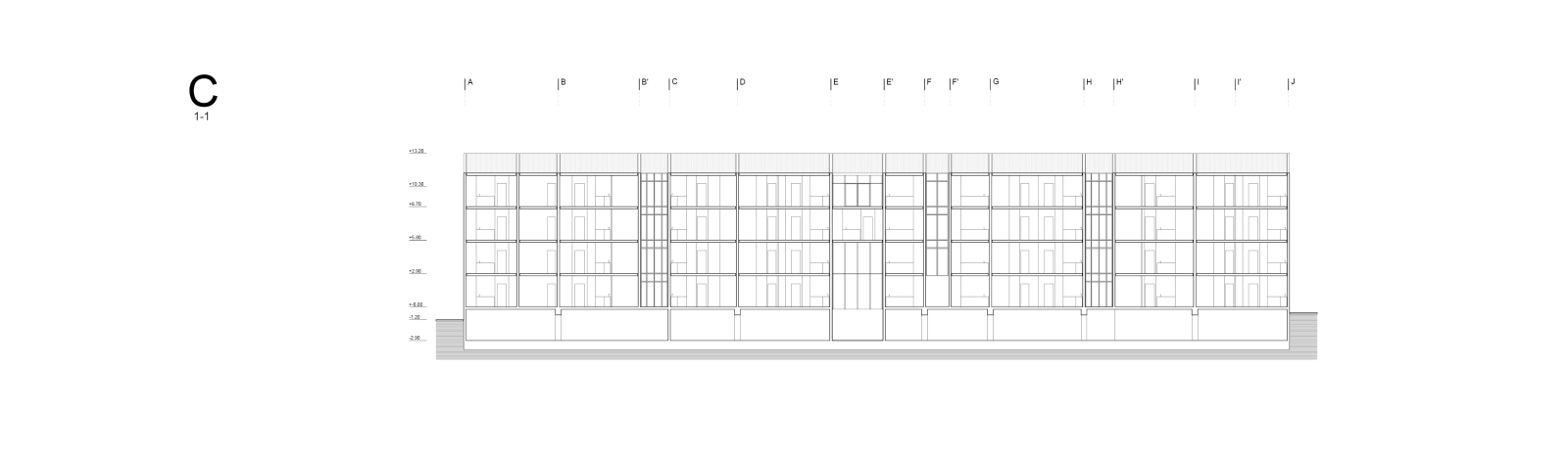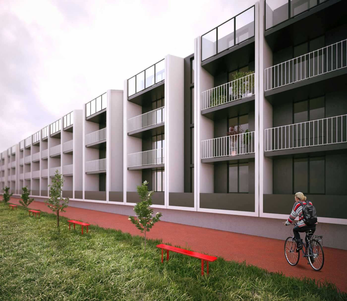ORGANIZACIJA STAMBENIH JEDINICA | Svaka lamela podeljena je centralnim pristupnim hodnikom na dva niza stanova, tako da su uz hodnik u dubini objekta grupisane servisne prostorije, kupatila, toaleti i ulazni prostori, dok su dnevni prostori, prostori za obedovanje i spavanje orijentisani ka glavnim fasadama dubine do 4.85m, prirodno osvetljeni i provetreni. Osam tipova stanova (garsonjere, jednosobni, jednoiposobni, dvosobni, dvoiposobni, trosobni, troiposobni i četvoroiposobni) su po dužini organizovani na tri osnovna tipska rastera - 3.3m za minimalne dnevne sobe, spavaće sobe i garsonjere, 4.4m za dnevne sobe u stanovima sa više kvadrata, i 2.2m za takozvane „polu-sobe“ pripojene osnovnom prostoru stana. Na taj nacin stanovi svake lamele dobijeni su podelom na ova tri tipska rastera, ritmično, a prema potrebi specifičnih stanova (4.4 - 3.3 - 4.4 - 2.2 - 3.3 - 2.2 - ... itd.). Na isti način je rešena podzemna garaža, smenjivanjem tipskih rastera (7.7m su tri parking mesta, 5.5m su dva, a 9.9 su četiri parking mesta). Razmicanjem stambenih jedinica dobijeni su prolazi kroz zgradu, i ulazi u prizemlju, a na spratovima zajednički prostori za stanare - za ostavljanje bicikala i zajedničke staklene bašte. Ulazi u garaže su rešeni „umetanjem“ jednog ili dva stana po visini na mestu pristupne rampe, dok je prizemlje i potkrovlje uvek čisto, te je na potkrovlju velika zajednička terasa - sušionica i prostor za okupljanja stanara. Svaki stan ima mogućnost proširenja u vidu terase (a radi ekonomičnosti rešenja, moguće je graditi i potpuno bez terasa), sa varijacijama u tipu terase po spratovima. U prizemlju terase su ograđene punim zidom radi intimnosti, na spratovima metalnom ogradom, dok je u potkrovlju mala krovna lođa - izdvojena staklenom ogradom i sa otvorenim pogledom na nebo.
