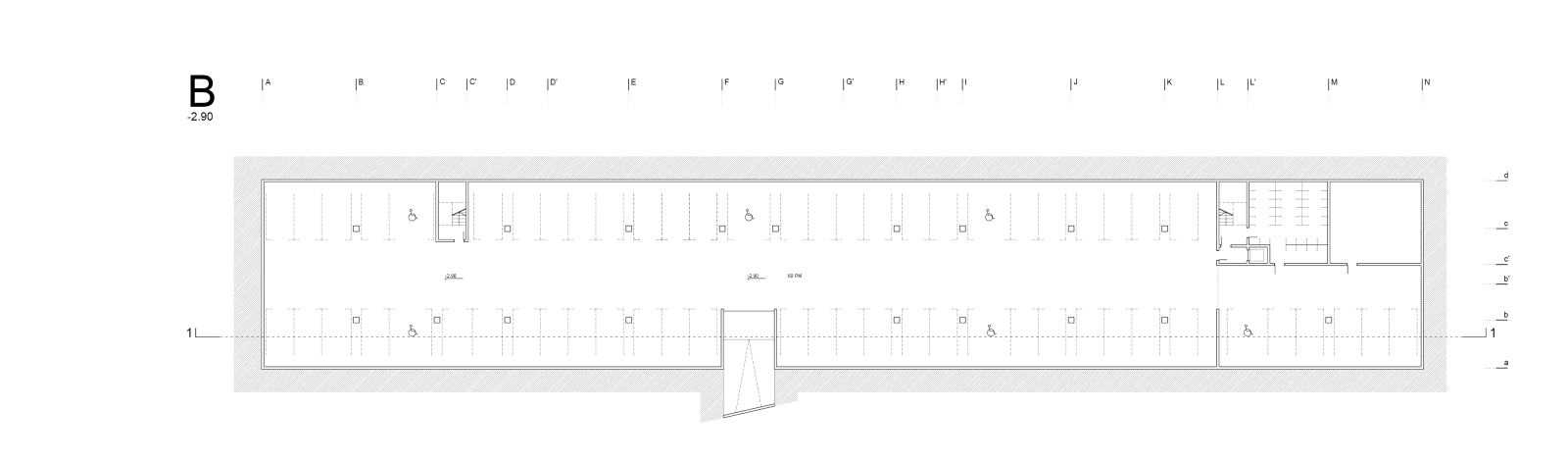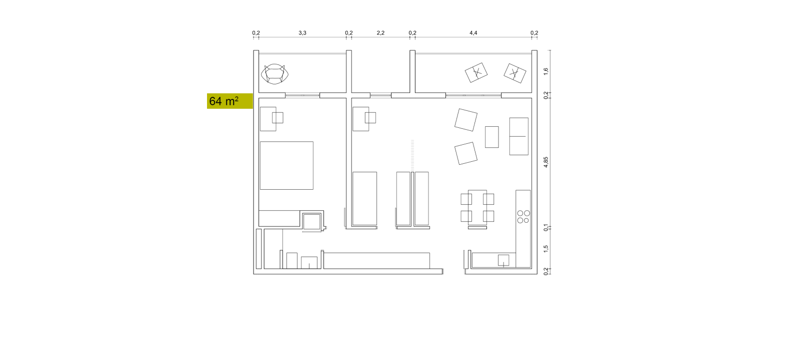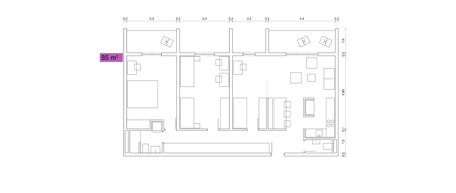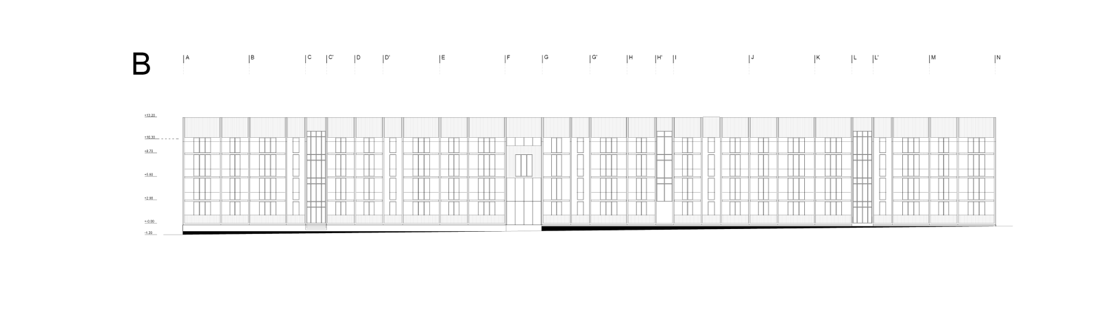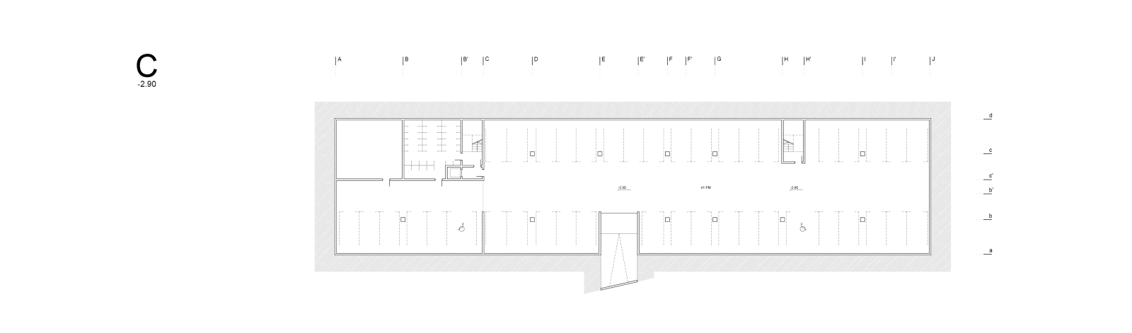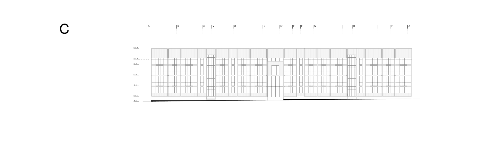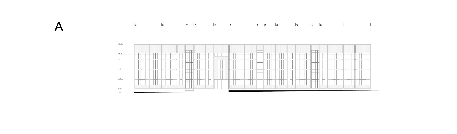 ORGANIZACIJA STAMBENIH JEDINICA | Svaka lamela podeljena je centralnim pristupnim hodnikom na dva niza stanova, tako da su uz hodnik u dubini objekta grupisane servisne prostorije, kupatila, toaleti i ulazni prostori, dok su dnevni prostori, prostori za obedovanje i spavanje orijentisani ka glavnim fasadama dubine do 4.85m, prirodno osvetljeni i provetreni. Osam tipova stanova (garsonjere, jednosobni, jednoiposobni, dvosobni, dvoiposobni, trosobni, troiposobni i četvoroiposobni) su po dužini organizovani na tri osnovna tipska rastera - 3.3m za minimalne dnevne sobe, spavaće sobe i garsonjere, 4.4m za dnevne sobe u stanovima sa više kvadrata, i 2.2m za takozvane „polu-sobe“ pripojene osnovnom prostoru stana. Na taj nacin stanovi svake lamele dobijeni su podelom na ova tri tipska rastera, ritmično, a prema potrebi specifičnih stanova (4.4 - 3.3 - 4.4 - 2.2 - 3.3 - 2.2 - ... itd.). Na isti način je rešena podzemna garaža, smenjivanjem tipskih rastera (7.7m su tri parking mesta, 5.5m su dva, a 9.9 su četiri parking mesta). Razmicanjem stambenih jedinica dobijeni su prolazi kroz zgradu, i ulazi u prizemlju, a na spratovima zajednički prostori za stanare - za ostavljanje bicikala i zajedničke staklene bašte. Ulazi u garaže su rešeni „umetanjem“ jednog ili dva stana po visini na mestu pristupne rampe, dok je prizemlje i potkrovlje uvek čisto, te je na potkrovlju velika zajednička terasa - sušionica i prostor za okupljanja stanara. Svaki stan ima mogućnost proširenja u vidu terase (a radi ekonomičnosti rešenja, moguće je graditi i potpuno bez terasa), sa varijacijama u tipu terase po spratovima. U prizemlju terase su ograđene punim zidom radi intimnosti, na spratovima metalnom ogradom, dok je u potkrovlju mala krovna lođa - izdvojena staklenom ogradom i sa otvorenim pogledom na nebo.