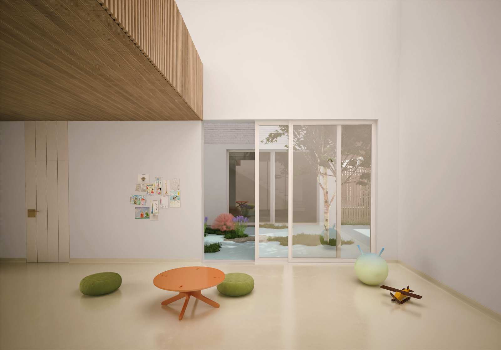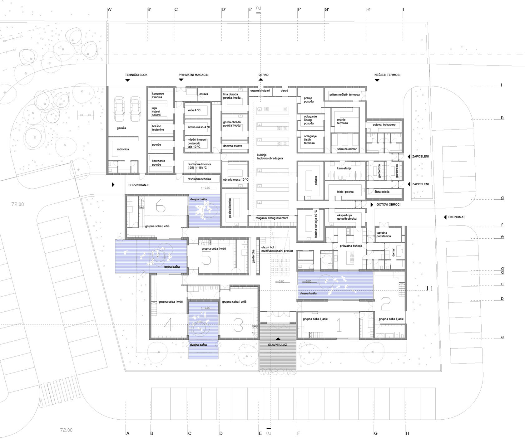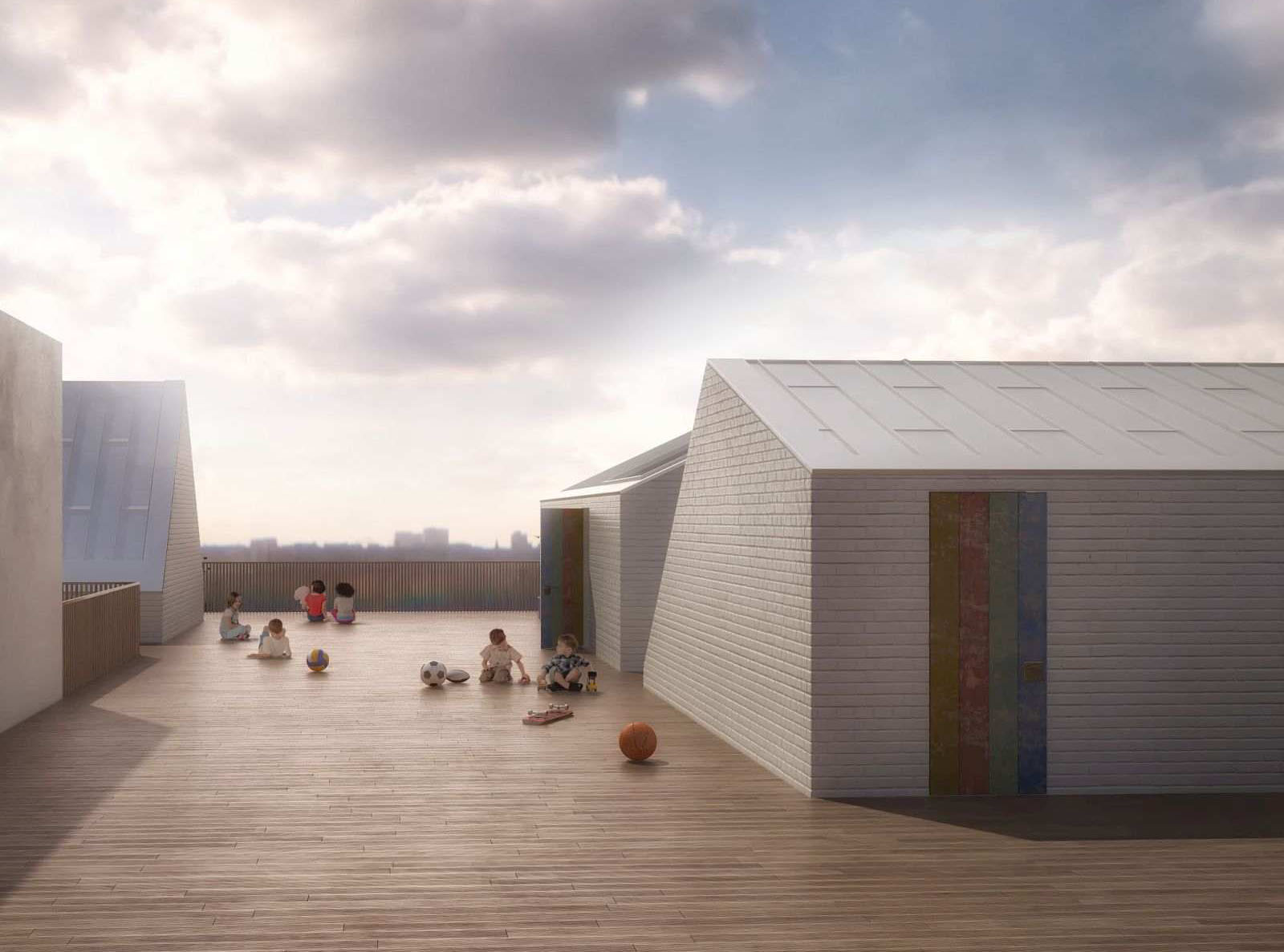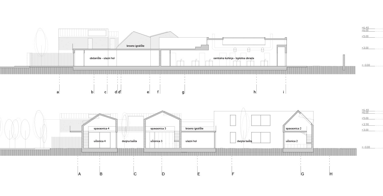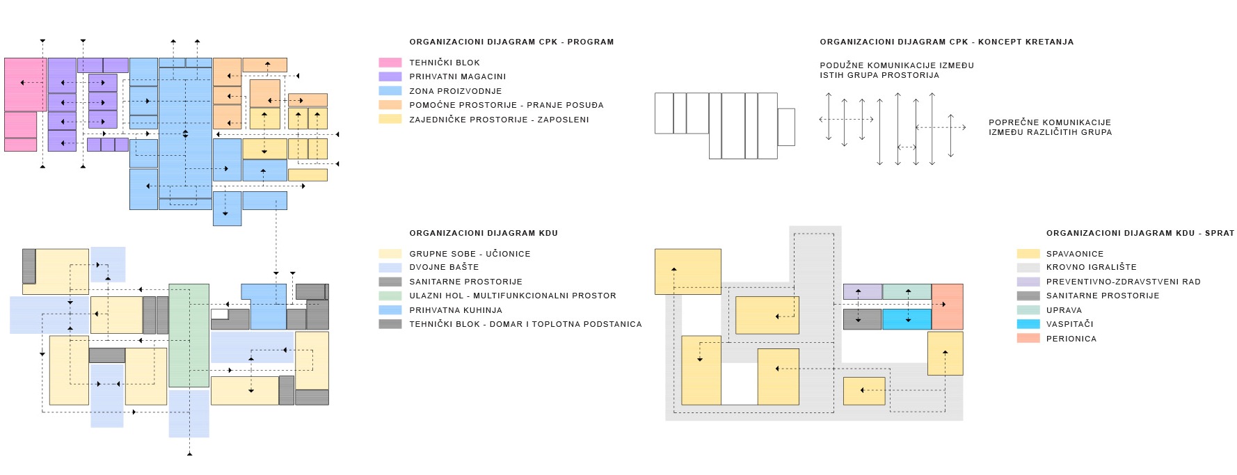 Dvojni objekat - kuhinja i obdanište - osmišljen je tako da i jedan i drugi deo proizilaze iz logike kretanja - u kuhinji hrane, a u obdaništu dece. Pripremi hrane je potreban čist i jasno organizovan sistem prostorija, od prihvatnog magacina, do ekspedicije gotovih obroka, dok je, detetu potreban prostor koji pruža mogućnosti - umesto jednoznačnog kretanja prostor obdaništa uvek otvara nove putanje, a umesto kontinualnog boravka u istoj učionici, uvek nudi mogućnost promene ambijenta, radi stalnog stimulisanja pažnje i održavanja koncentracije. Složenost prostora inicira razmišljanja i formiranje sopstvenih tumačenja i značenja, pa dete upoznajući i istražujući prostor oko sebe postepeno razvija stav prema okruženju i svetu. Iz ovih razloga zgrada obdaništa teži da postane sastavni deo procesa učenja. Šest grupnih soba - "kućica" - razmicanjem određuju zajednički prostor između - ulazni hol, komunikacije i bašte. One se šire iznutra ka spolja, čime dete postepeno „osvaja” prostor napredujući od sopstvene učionice ka velikom zajedničkom igralištu na krovu. Odizanjem igrališta od tla na krov zgrade deci se pruža novi, samo njima namenjen prirodni ambijent u nivou krošnji drveća, zaštićen od saobraćaja i drugih smetnji iz okoline i sa pogledom na okruženje odozgo, umesto odozdo, što je prirodna pozicija deteta u svetu odraslih. Krovno igralište miri potrebu roditelja za sigurnošću deteta, sa potrebom deteta da istražuje i otkriva sopstveno okruženje. Sa šireg aspekta, karakteristična arhitektura obdaništa kao „grupacije kućica na krovnom igralištu”, doprinosi fomiranju identiteta naselja koje tek nastaje na trećem kraju Beograda, a time i osećaju prepoznatljivosti mesta kod deteta, i formiranju asocijativnih veza sa prostorom u kojem svakodnevno boravi.