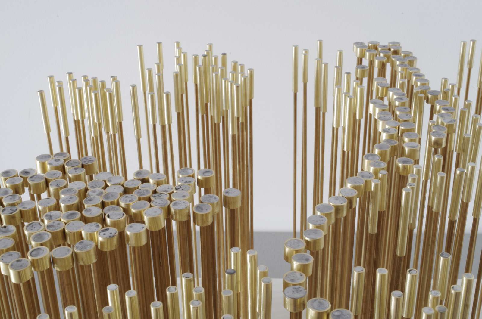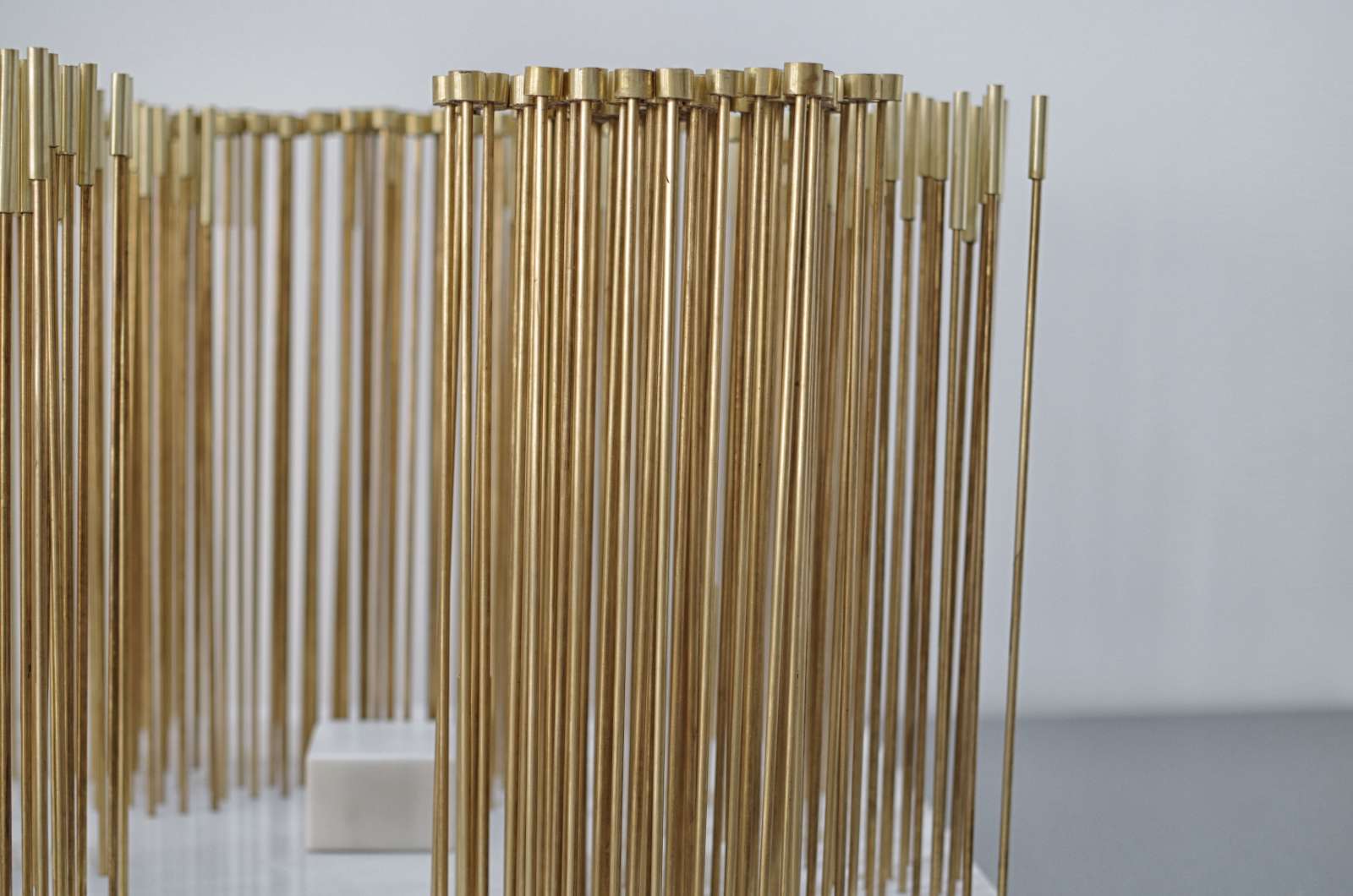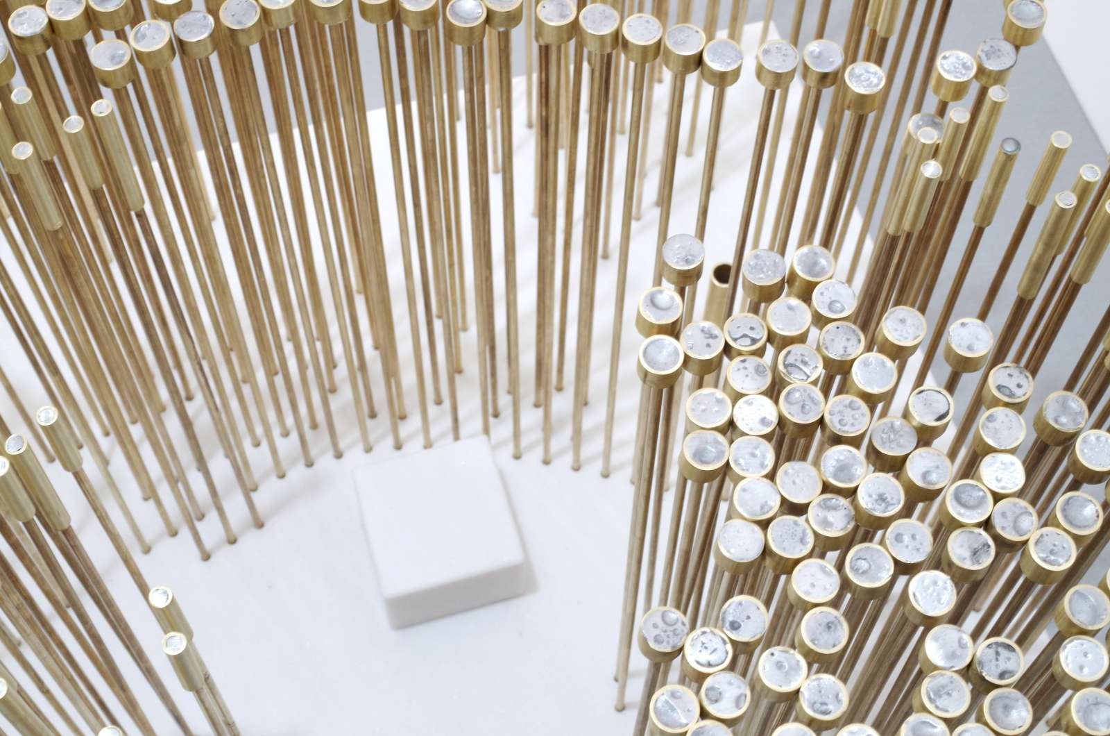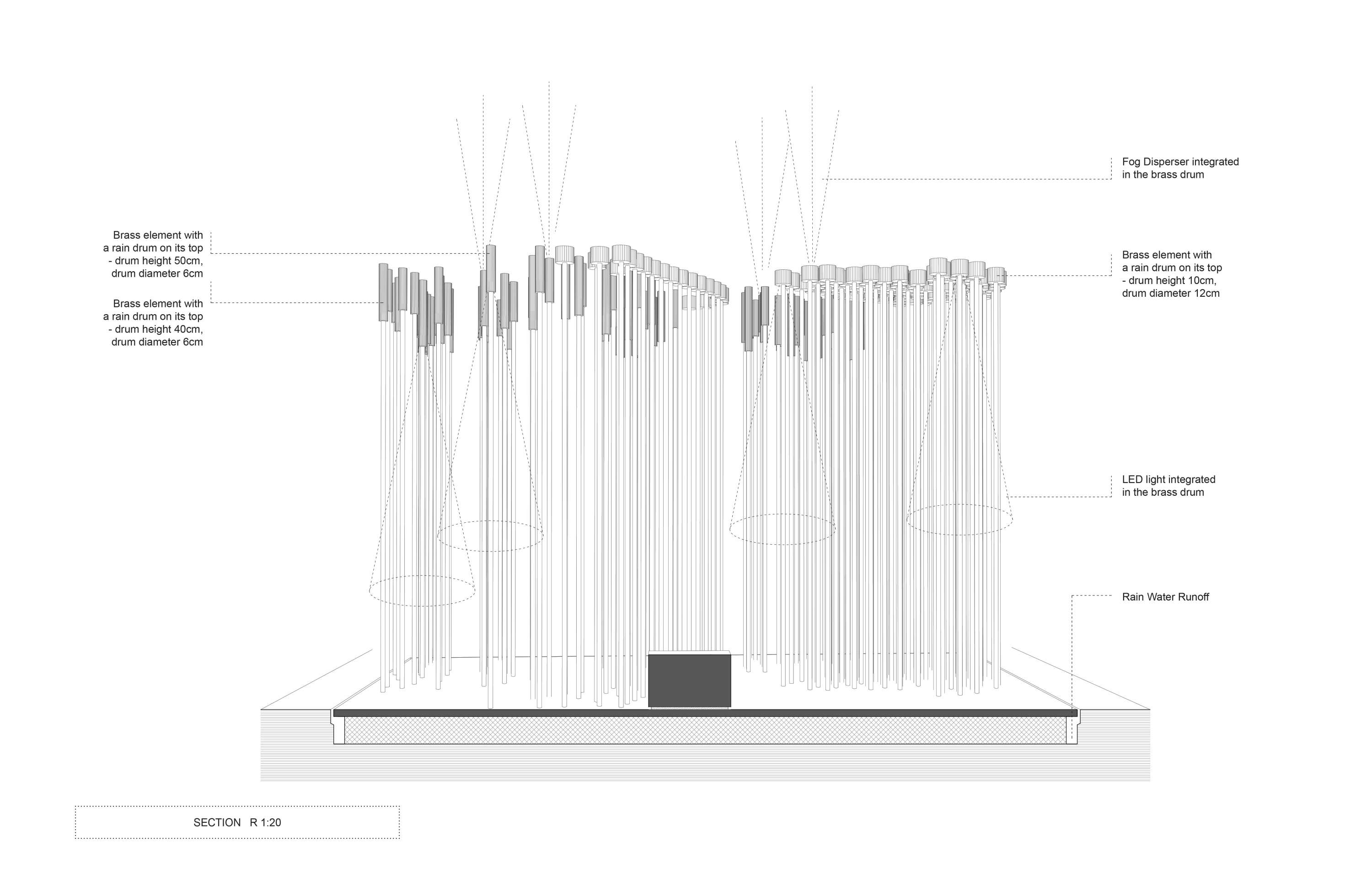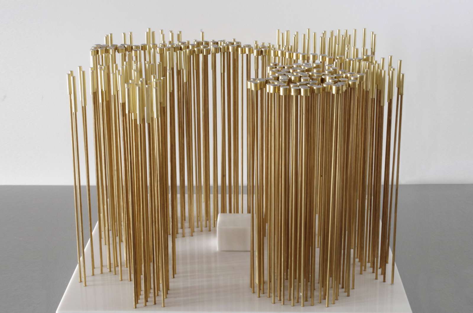 INDIVIDUAL - SOCIETY | 300 brass elements individually produce unique sounds in the rain due to differently proportioned and handcrafted rain drums facing the sky. Some elements have integrated LED lights to illuminate the marble base at night, and some are equipped with fog dispersers that cool the whole structure down in hot summer months. The structure intensifies the prevailing southwestern winds on Student Square and responds to air flows by subtle buzzing sounds of exposed metal elements. Multiple sensorial stimuli amount to a single atmospheric effect, standing for the importance of each individual in the society as a whole. MODEL | We made a physical model of the memorial in 1:10 scale, where each brass element is carefully made by hand and unique. This is a principle that should be repeated in the actual construction process - each element should be treated with utmost care and handcrafted in a unique way. Variations among elements are to be encouraged as a key quality of the structure - in this way promoting the idea that Zoran Djindjic had been tirelessly pursuing: the idea about the incredible strength of a society as a constructive unity of positive and self-accomplished individuals.