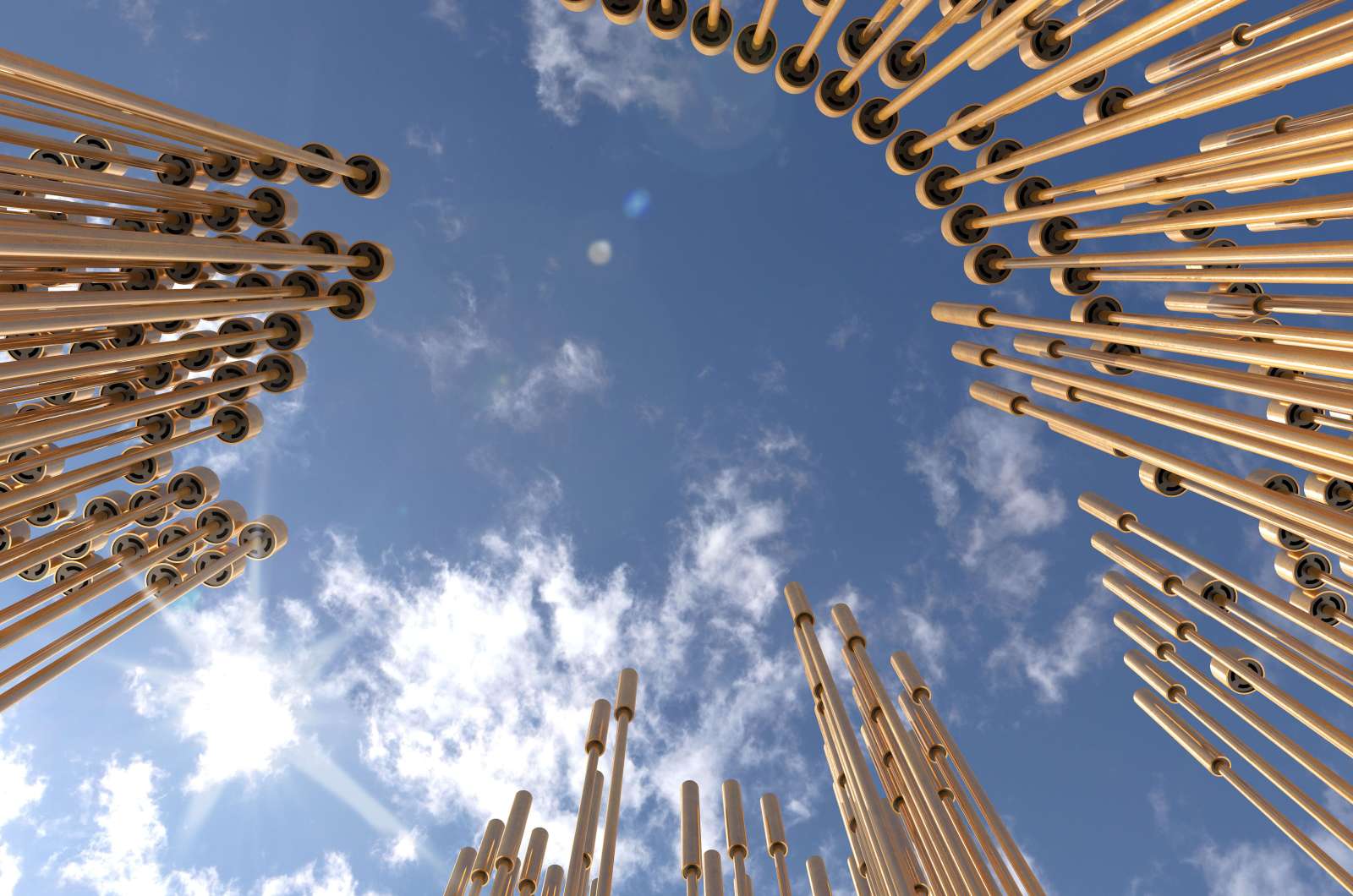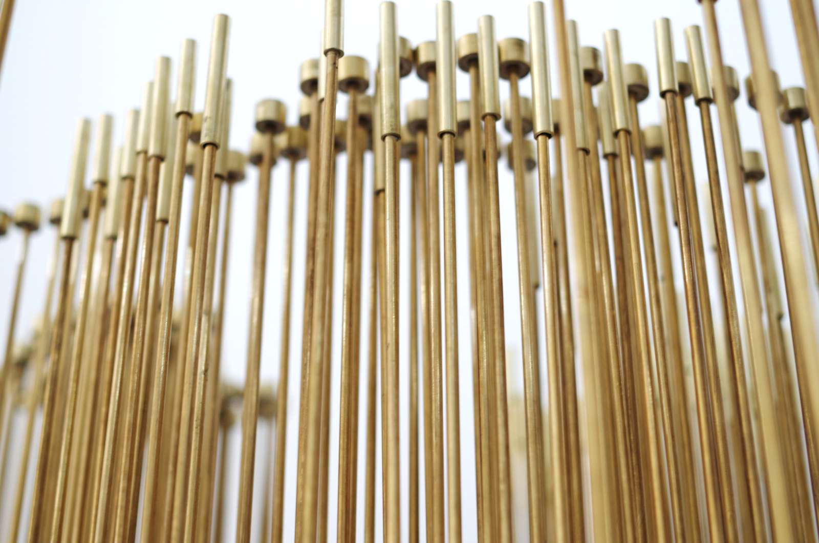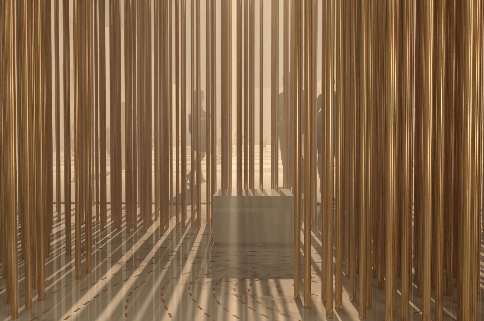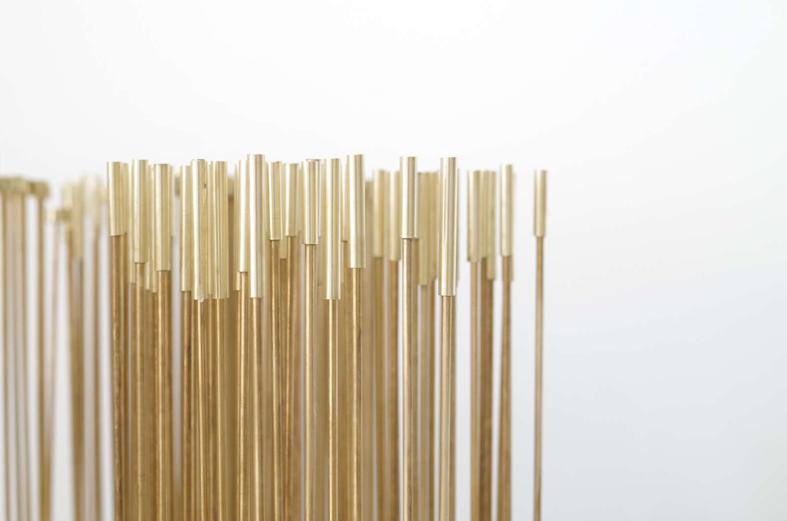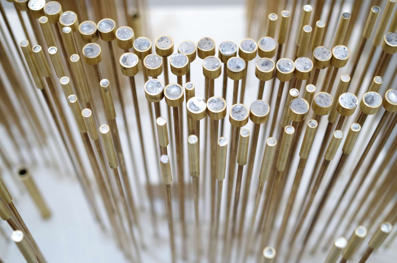INDIVIDUAL - SOCIETY | 300 brass elements individually produce unique sounds in the rain due to differently proportioned and handcrafted rain drums facing the sky. Some elements have integrated LED lights to illuminate the marble base at night, and some are equipped with fog dispersers that cool the whole structure down in hot summer months. The structure intensifies the prevailing southwestern winds on Student Square and responds to air flows by subtle buzzing sounds of exposed metal elements. Multiple sensorial stimuli amount to a single atmospheric effect, standing for the importance of each individual in the society as a whole. MODEL | We made a physical model of the memorial in 1:10 scale, where each brass element is carefully made by hand and unique. This is a principle that should be repeated in the actual construction process - each element should be treated with utmost care and handcrafted in a unique way. Variations among elements are to be encouraged as a key quality of the structure - in this way promoting the idea that Zoran Djindjic had been tirelessly pursuing: the idea about the incredible strength of a society as a constructive unity of positive and self-accomplished individuals.