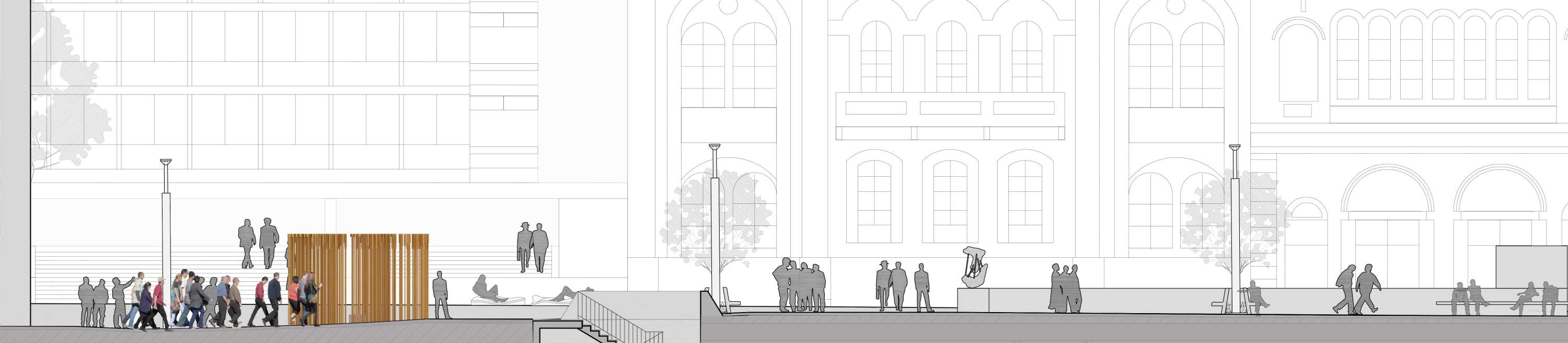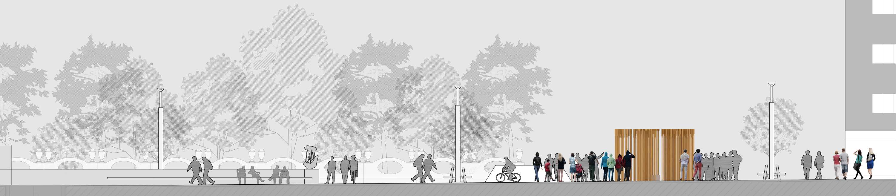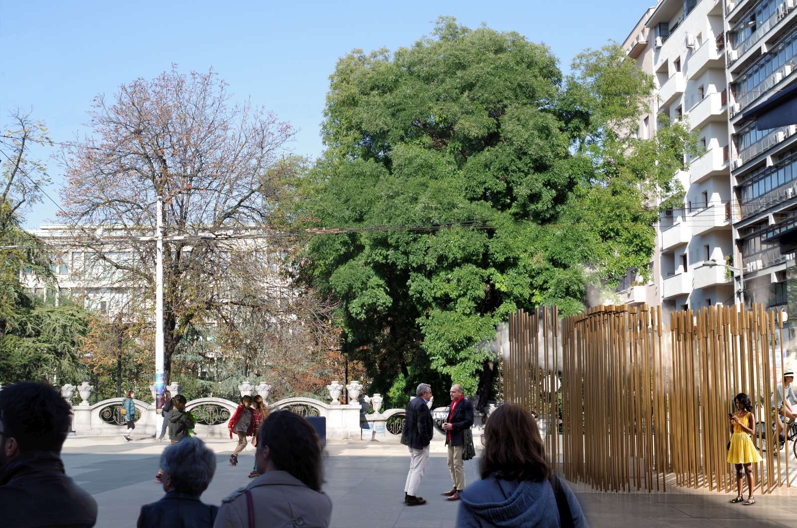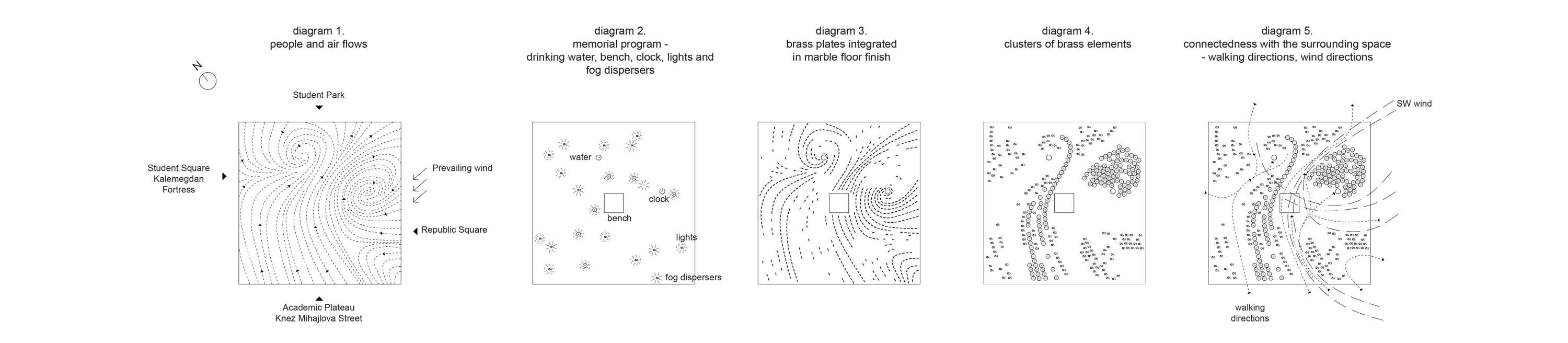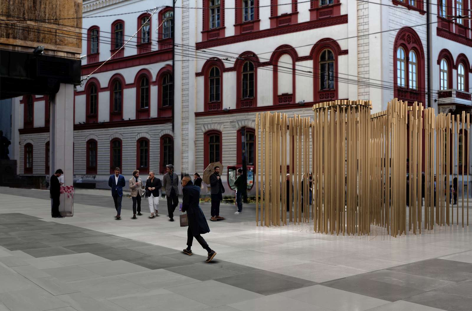 RESPONSIVE ATMOSPHERE | Zoran Đinđić Memorial aspires to create a micro space within the monument, and along with it to construct a vibrant atmosphere of rememberance that actively responds to the everyday life of the city surrounding it. Instead of proposing a single sculpture, an object that would project a certain political message, we chose to disperse one object into multiple bundles of vertical elements made of brass on a pristine white marble base, to create a space that one is able to walk into and engage with. The memorial becomes an integral part of the city life, as it continuously reacts to the weather conditions and urban atmosphere around it. Brass elements are triggered by the surrounding sounds of the city - the structure amplifies rain drumming, wind howling and cools heated summer air by dispersing fog. Reminiscent of a vibrant crowd, it works along with the city itself - each brass element produces a certain kind of sensorial stimuli and contributes to the overall effect of the memorial space. FLOW PATTERNS | The elements are positioned in predetermined patterns of local flows of air and people, to celebrate the present moment of our everyday lives, as well as to speak for the social movements emerging throughout the history. One marble bench within the structure symbolizes Zoran Djindjic, as an integral part of the movement and a carrier of its compelling energy. Furthermore, the memorial signifies precious moments of communication among people, of spreading motivation, knowledge and positive creative energy within the community.