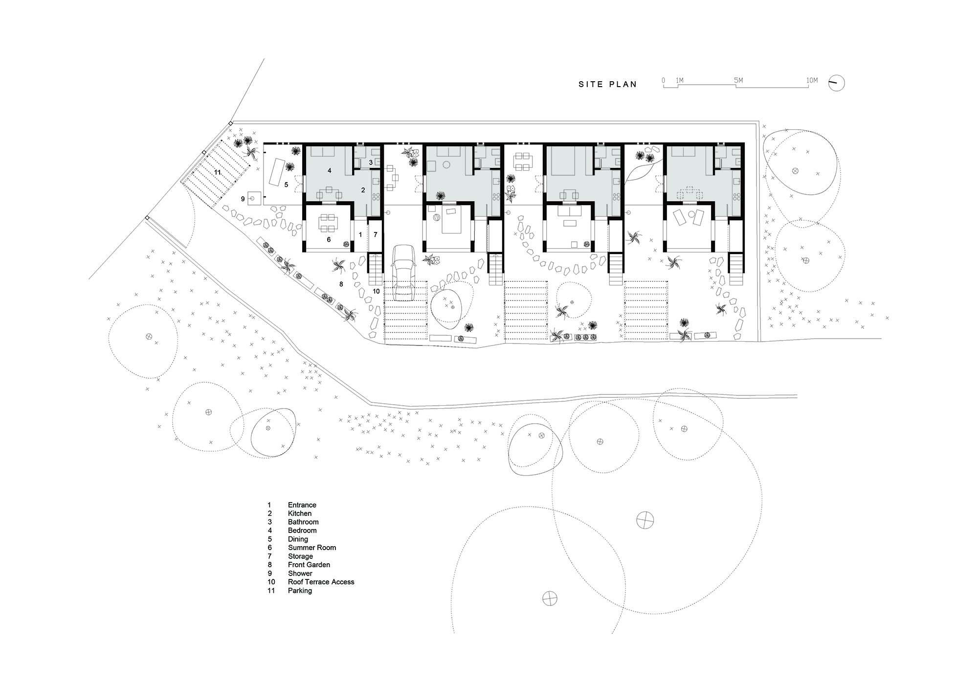 Blurred boundaries and intertwining spaces create gradients of privacy, from shaded and secluded interior areas to exposed panoramic roofs. The building can function as 4 individual vacation units, as well as one dwelling with a series of open spaces for socializing. The invisible spatial links achieved throughout the housing complex - visual, acoustic, olfactory and thermal - enable all the individual spatial atmospheres to mutually overlap and amplify each other. When living in such a house, one can hear people chatting on the roof, the outdoor shower running, barbeque in the front garden, plates rattling, all at the same time. Unlike a traditional vacation house where people tend to separate into small groups and occupy individual rooms, the intertwining spaces create scenarios for spontaneous socialization among neighbors, resulting in unforeseen everyday situations, experiences and friendships, which is what a summer vacation is really all about.