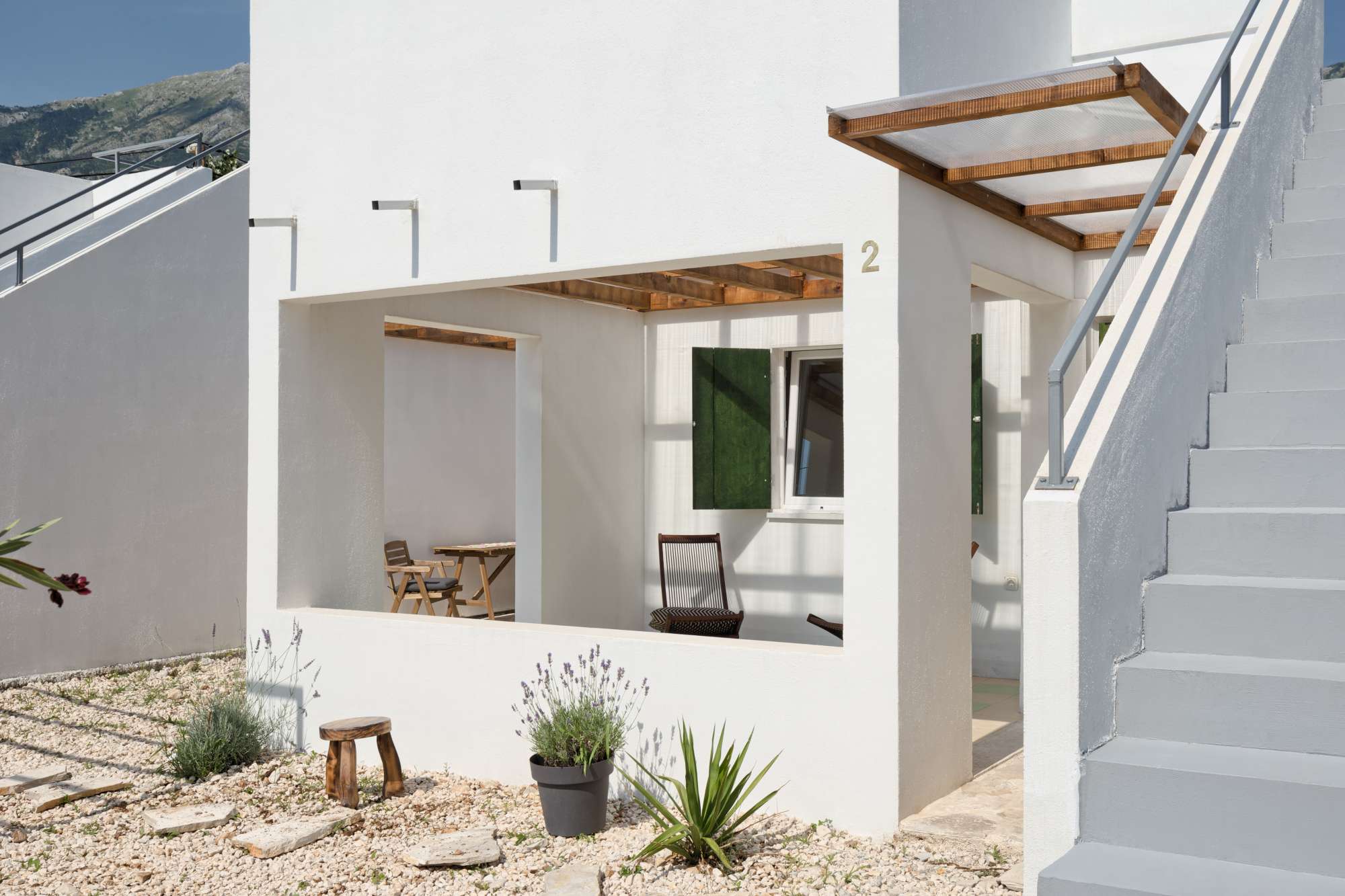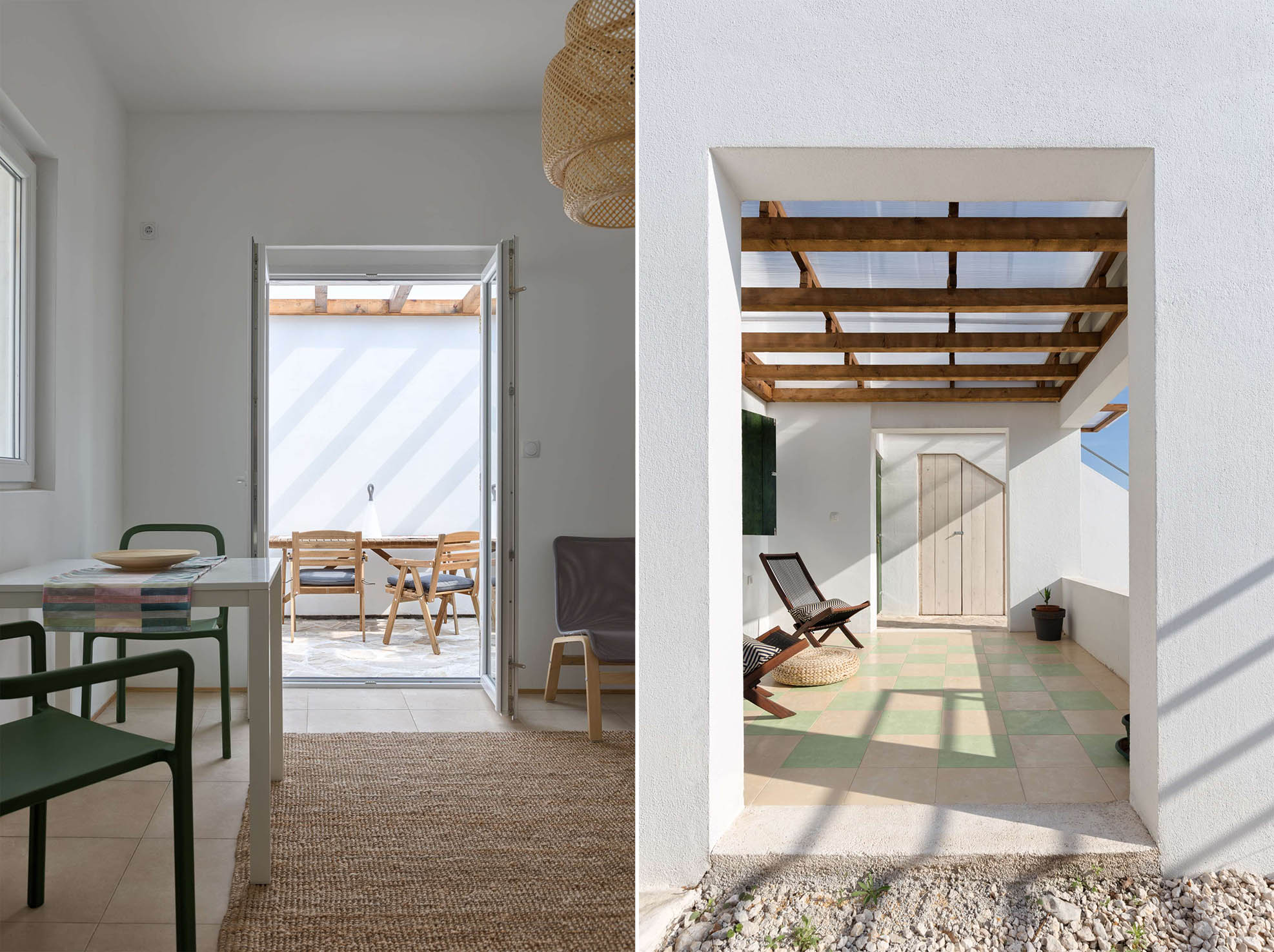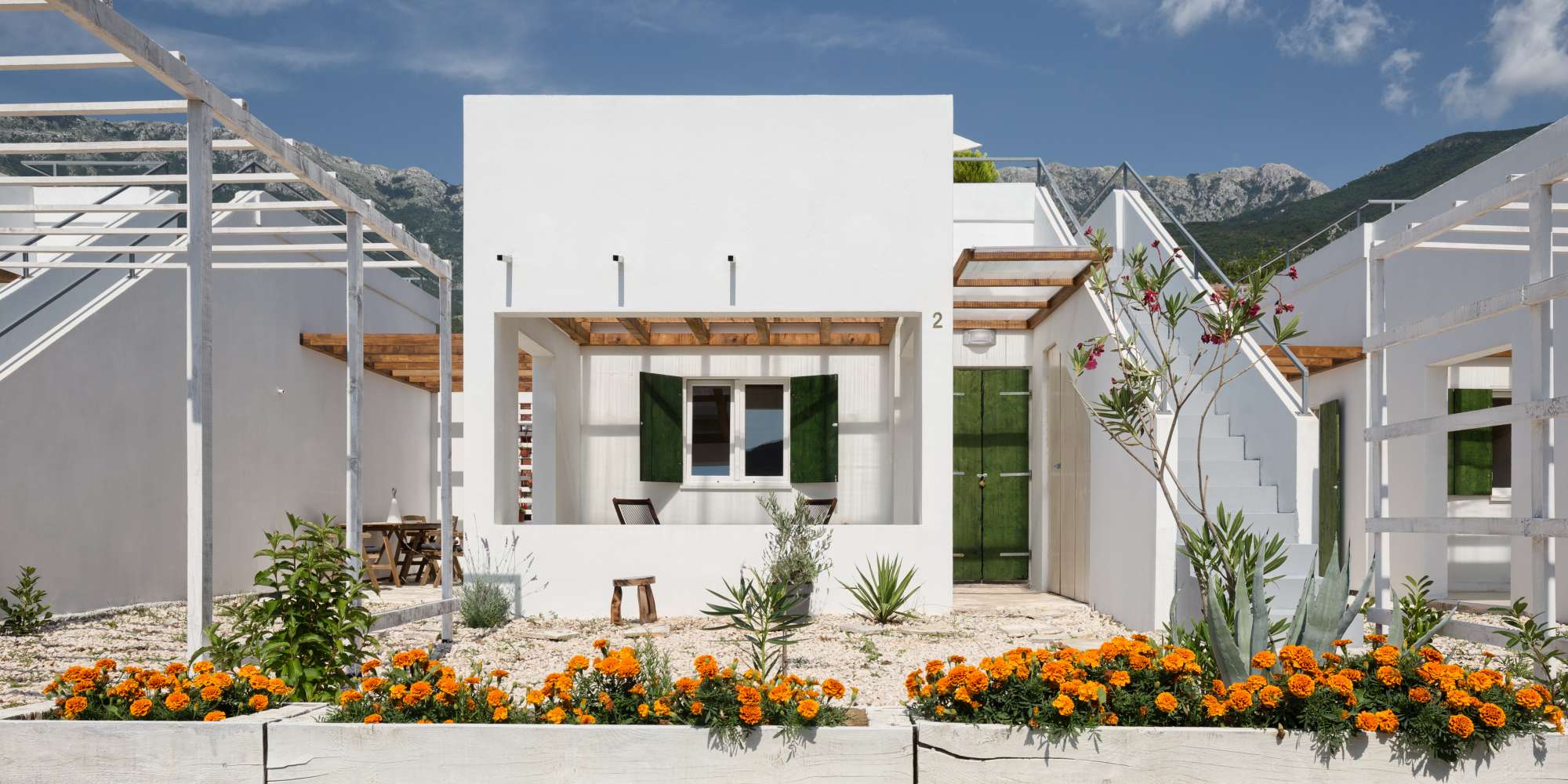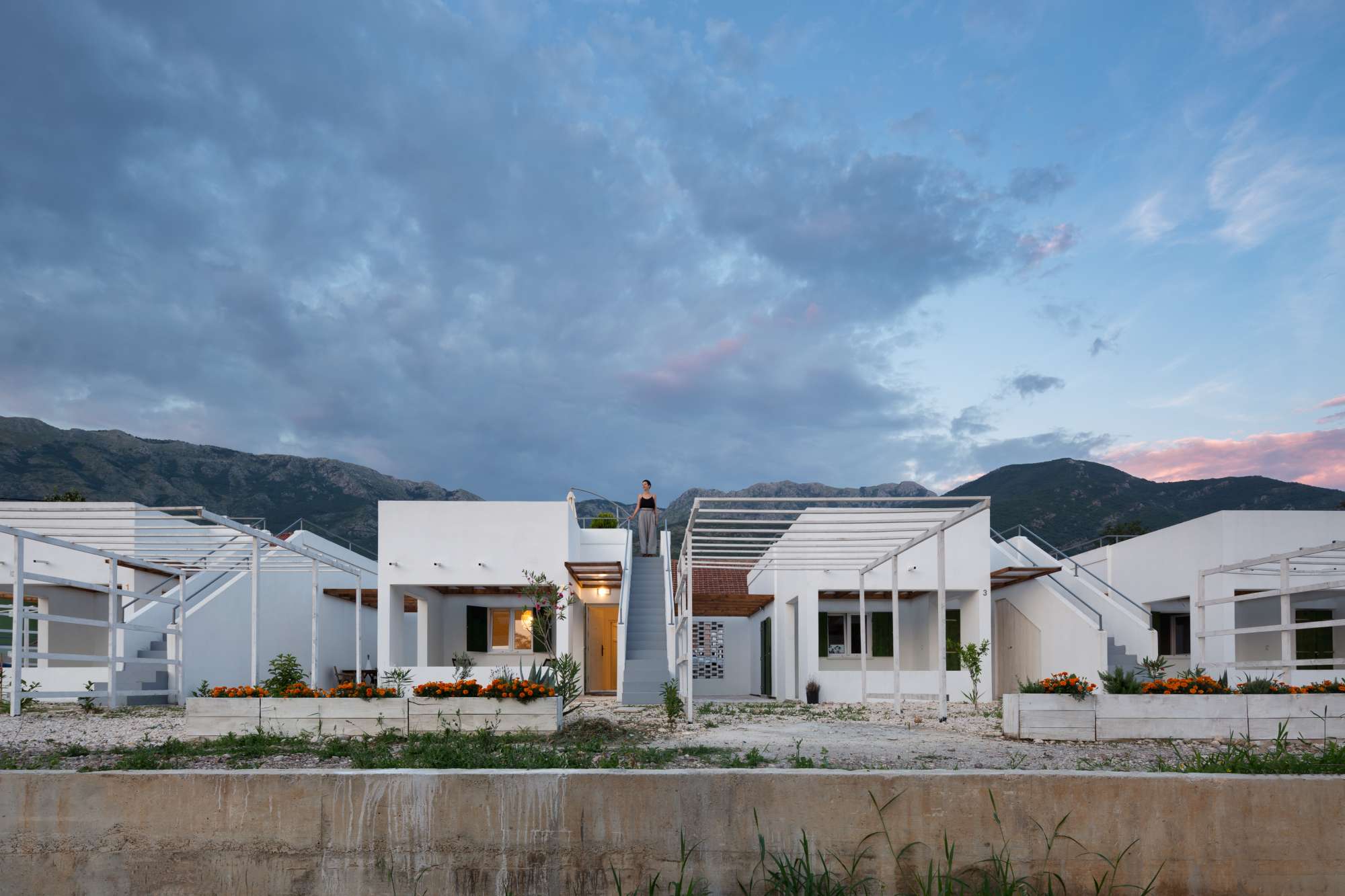 The applied materials are simple and locally available - white painted walls to catch sunlight and express spatial depth with strong contrasts of light and shade, solid wood for lightweight canopies and window shutters, and local stone and gravel for landscaping around the houses. Mediterranean planting such as olive, fig, cherry and pomegranate trees, oleander, lavander, aloe and rosemary have yet to grow and fully permeate the site.