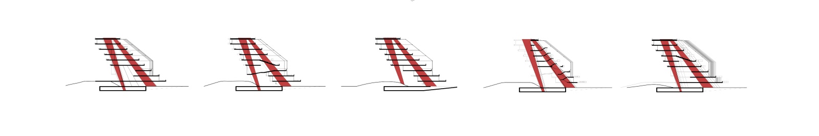 The structure of the building is in concrete and very simple, main radially positioned vertical walls hold the cascading slabs of 10m spans, while the entire building is counter-posed with the underground garage volume. Diversity throughout the building is explored by cascading teraces and by introducing slab openings, leaning slabs and an auditorium, so that every cross section is slightly different.