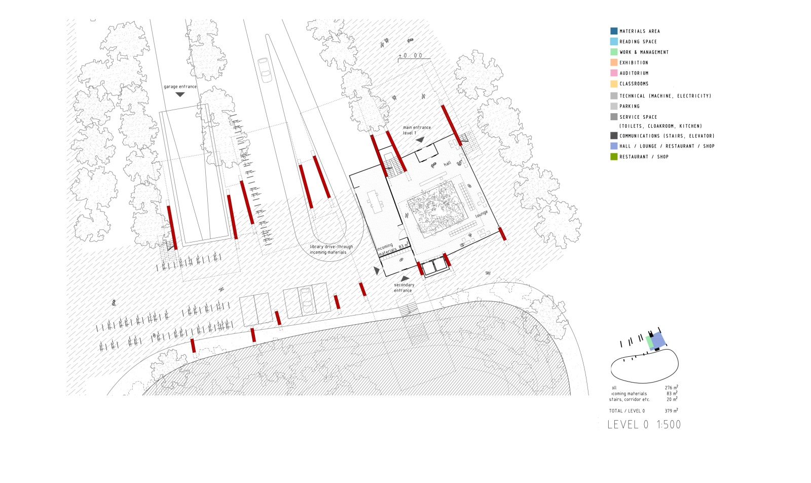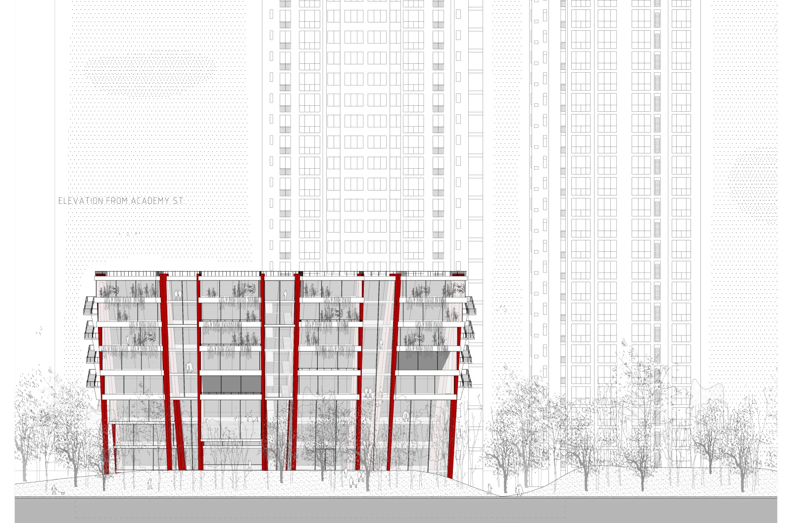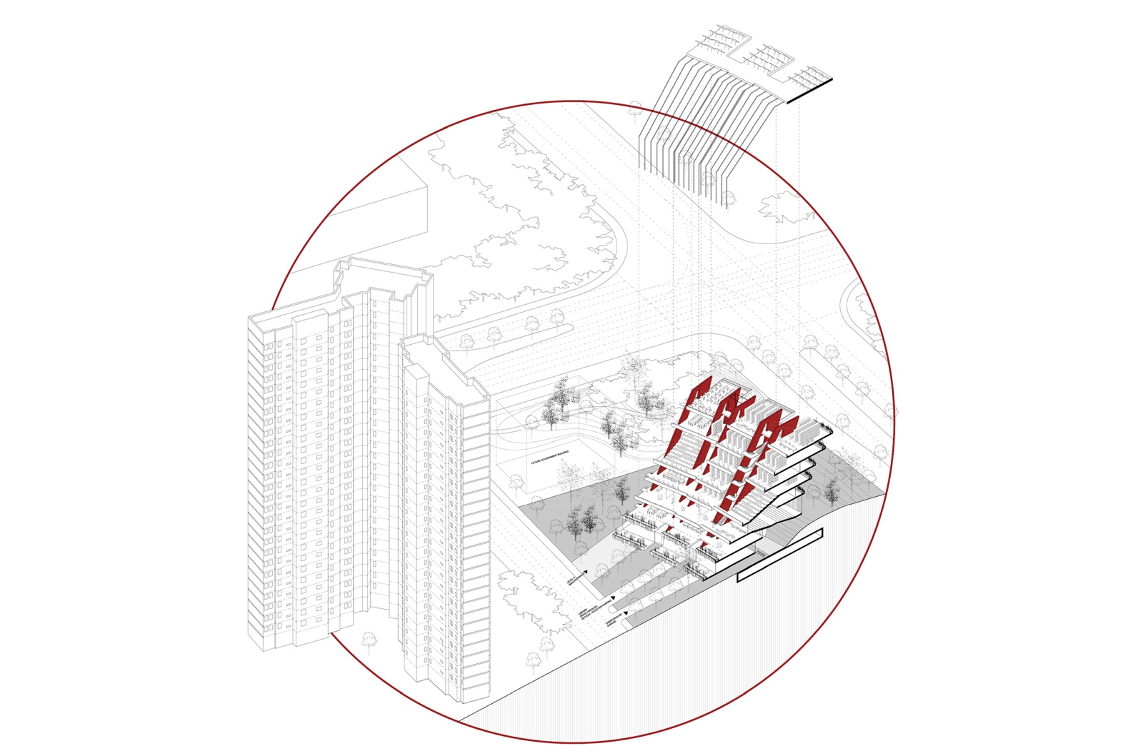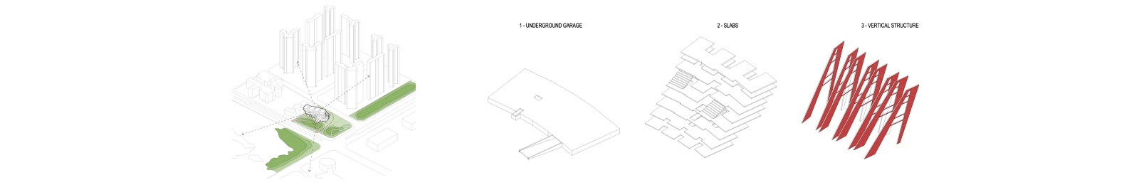 On the site plan, the library building is formed by radially multiplying one tower several times, so that the structure is getting narrow to the north, and forming a large amphitheatrelike reading space, while it is getting wider to the south, so that it lets direct sun deep into the building, while making sure that the multiple towers are distinctly visible from the Academy Road, and bravely stand aside the residential mega-structures behind them. In order to form a green buffer towards the busy road, we extend the lushly planted hill on the neighboring plot, so that the entire structure of the library is anchored to the hill and the towers emerge from the forest. On the northern, calmer side of the plot, we form an entrance plateau, with radial tree lines that direct towards the main entrance, garage entry and the library drivethrough. The entire green landscape of the site literally runs through the building on ground level, connecting both streets bordering the site, with the library structure leaning above.