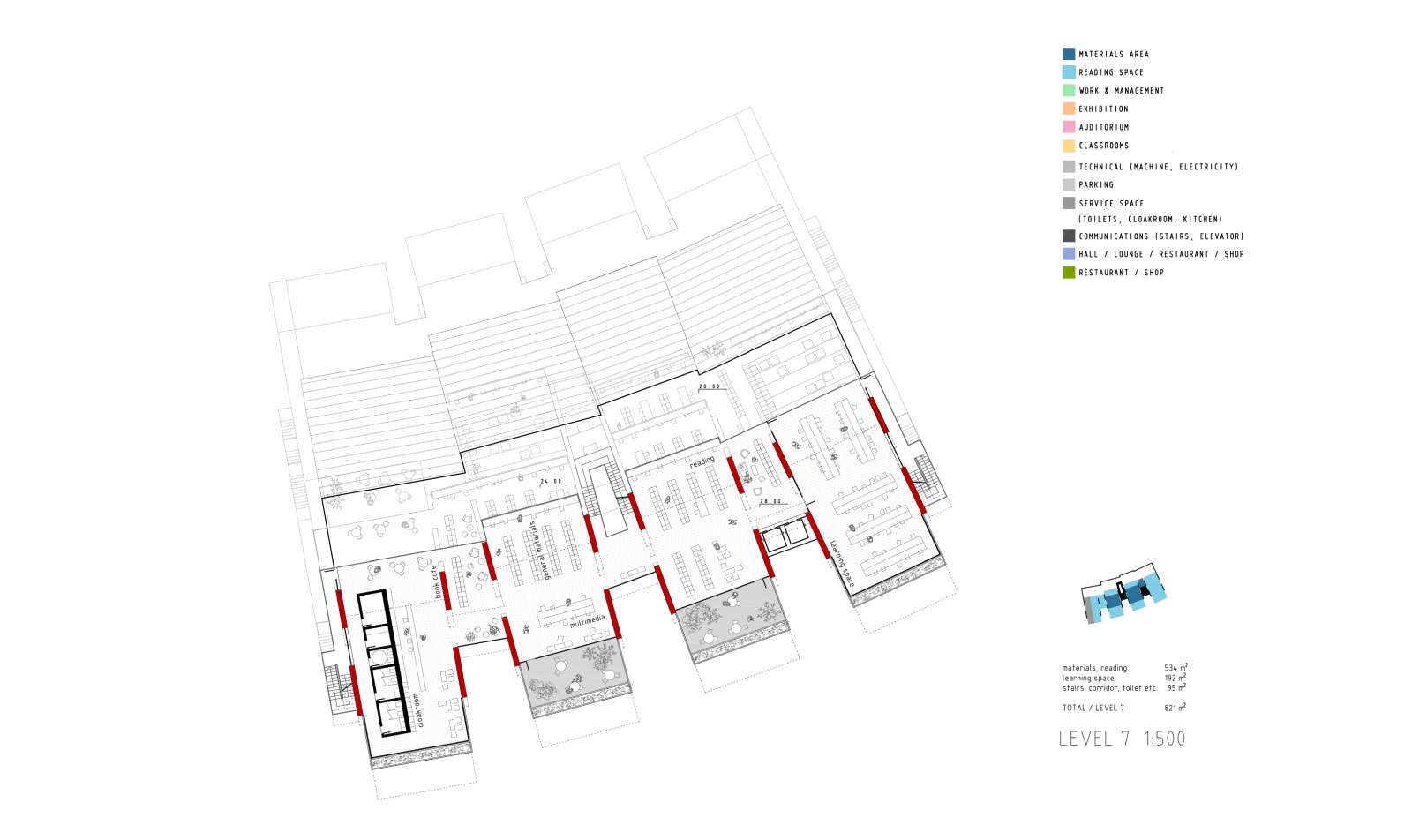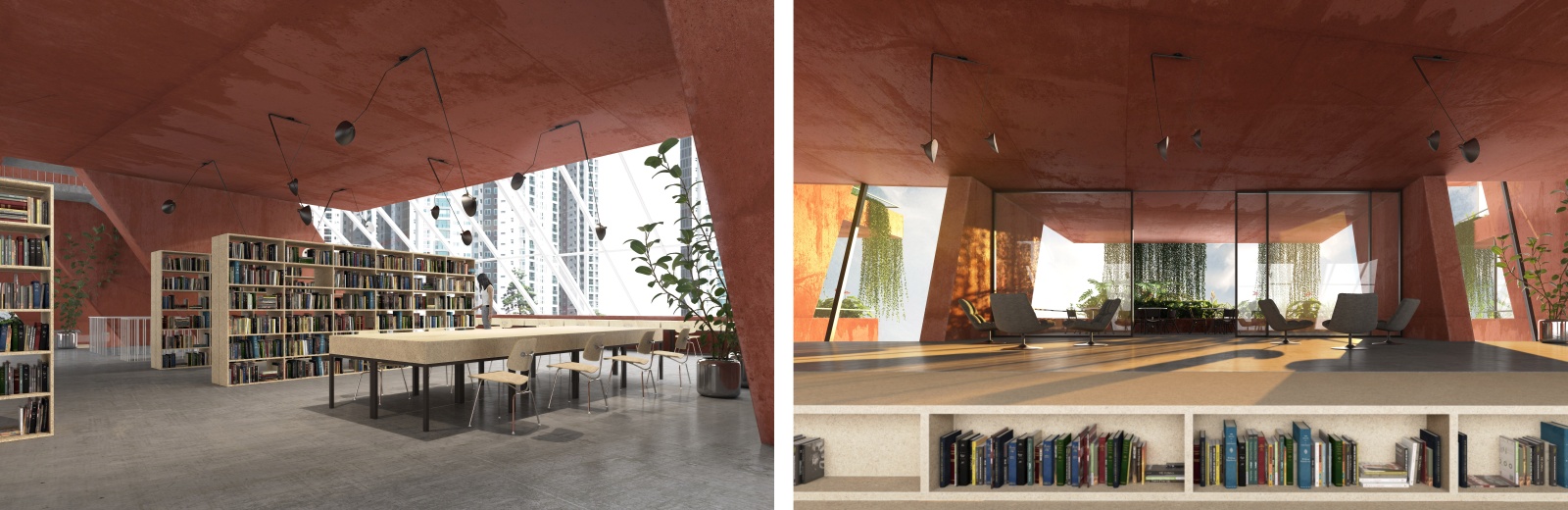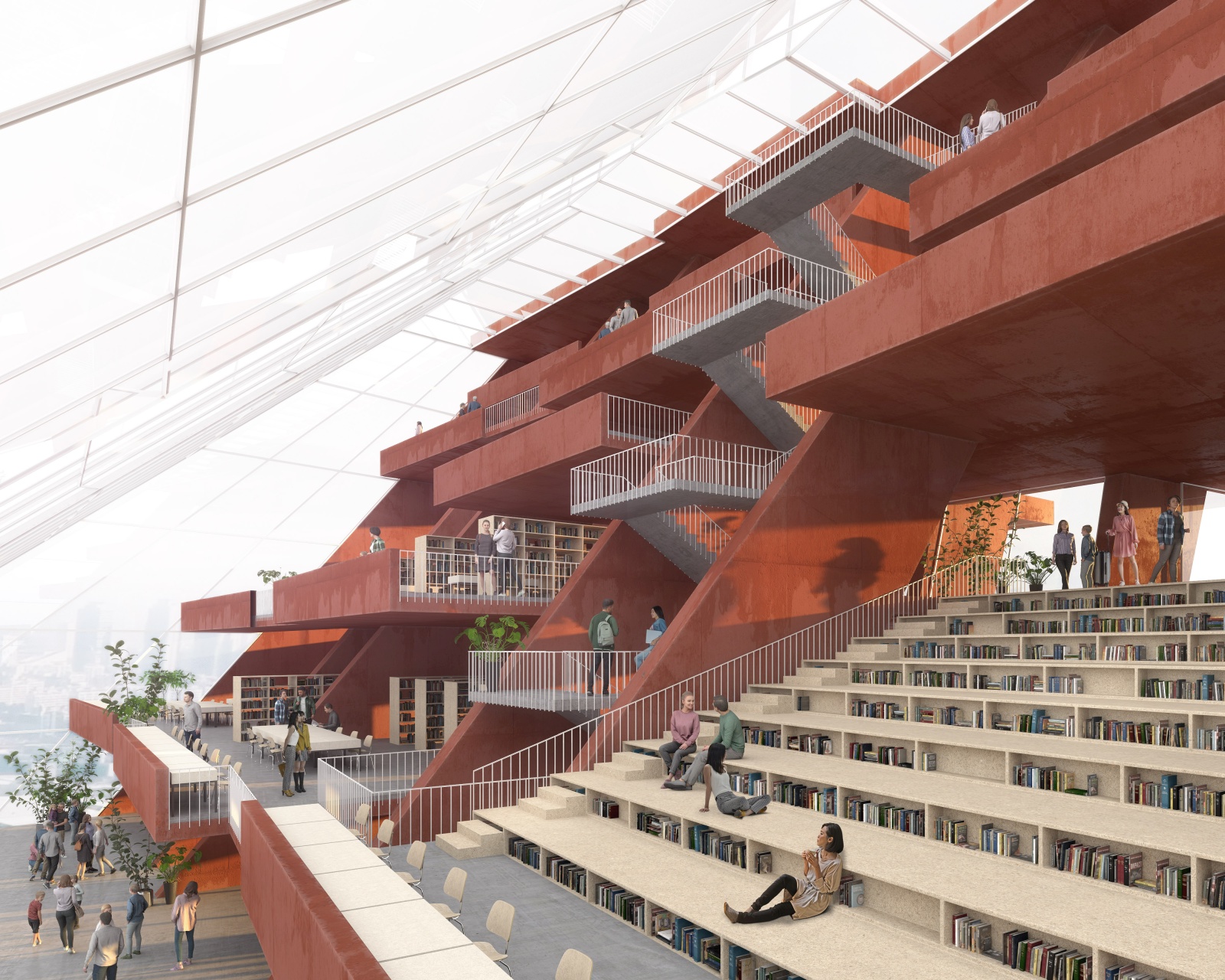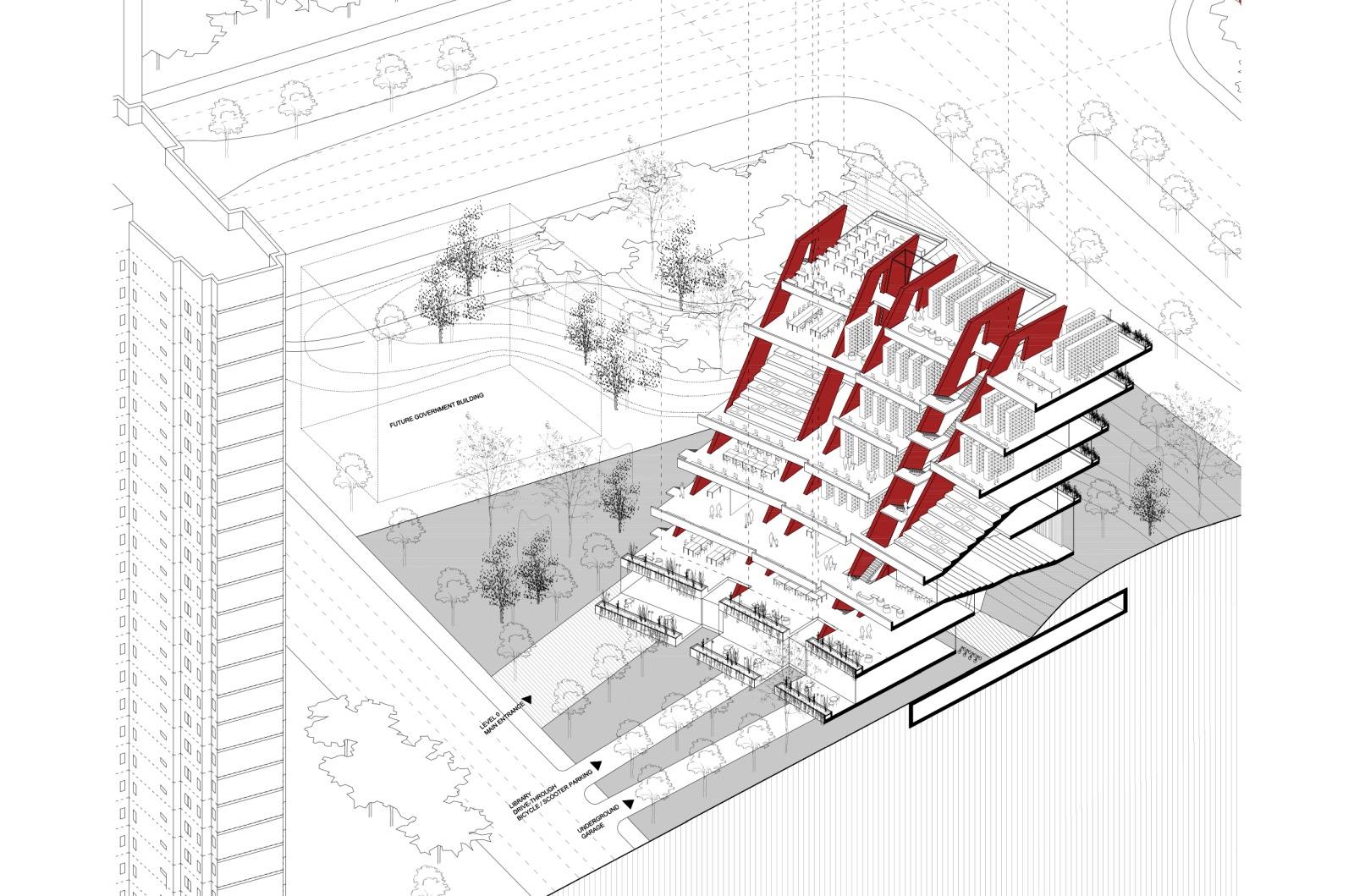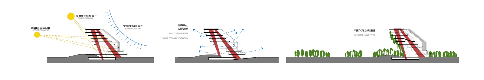 The main structure is materialized in red pigmented concrete cast on site to symbolize energy, the sun and life force of culture and creation. It dramatically contrasts the grey residential towers, and complements the lush greenery beneath. Series of red protruding terraces are heavily planted so that the lush greenery from the surrounding public spaces and the Golf Club literally climbs the Library building, turning it into a calming vertical garden of cultural prosperity. The green south façade purifies the air, and protects the interior of the library from city noise and pollution. The entire structure is designed to be naturally ventilated, so that when strategically positioned windows on the large glazed roof on the north are mechanically opened, the air flows freely between the planted southern terraces and the glazed northern roof, through the open reading spaces in between, thus creating a pleasant atmosphere of being outside. When the windows are closed, the building can be mechanically air-conditioned.