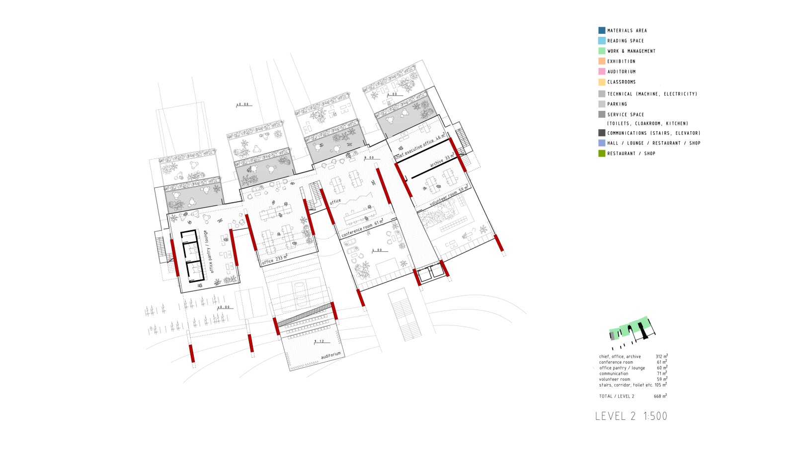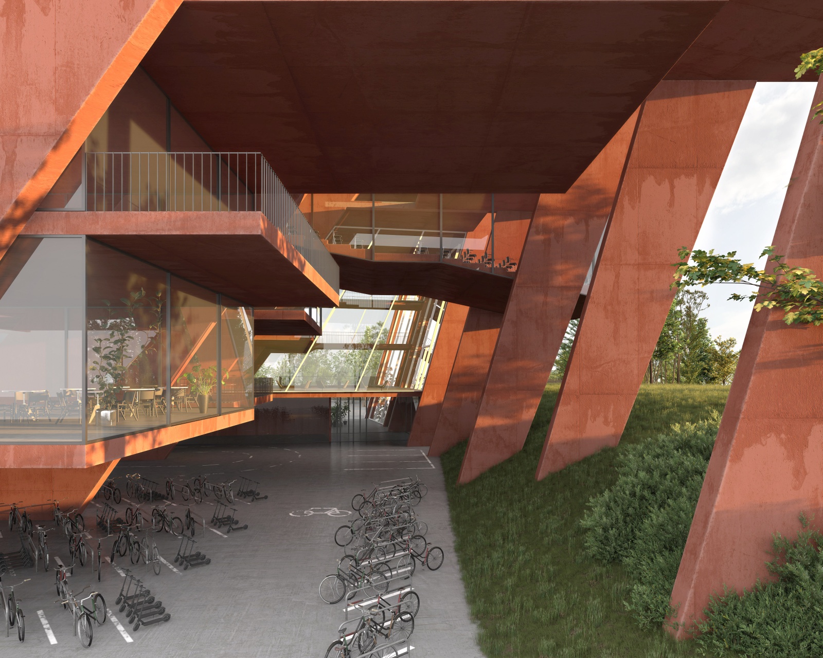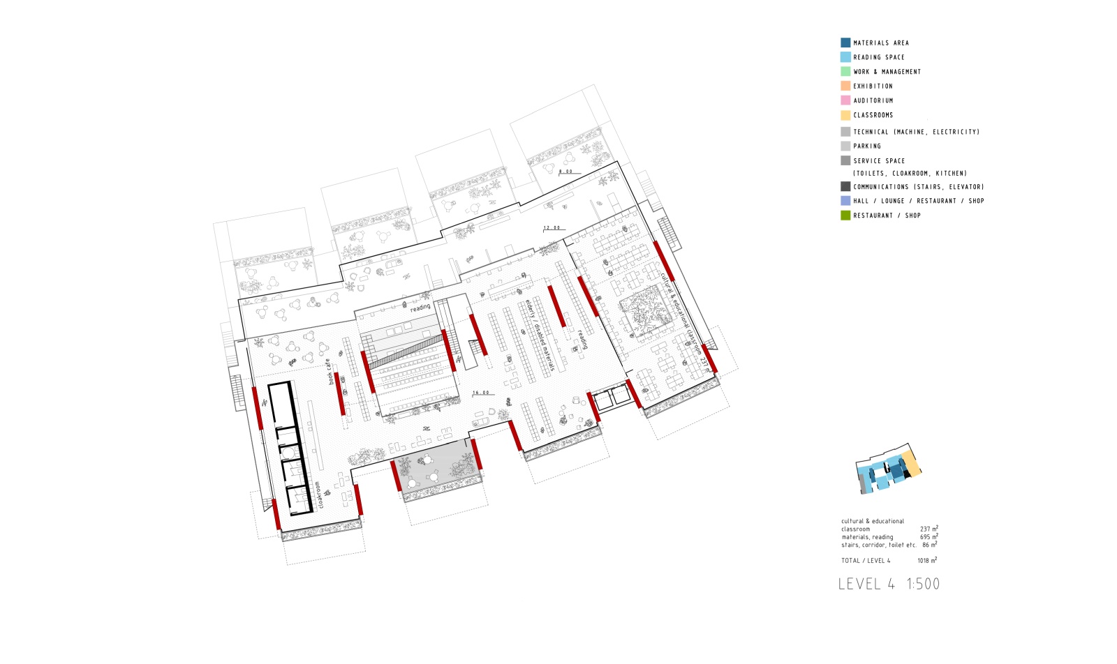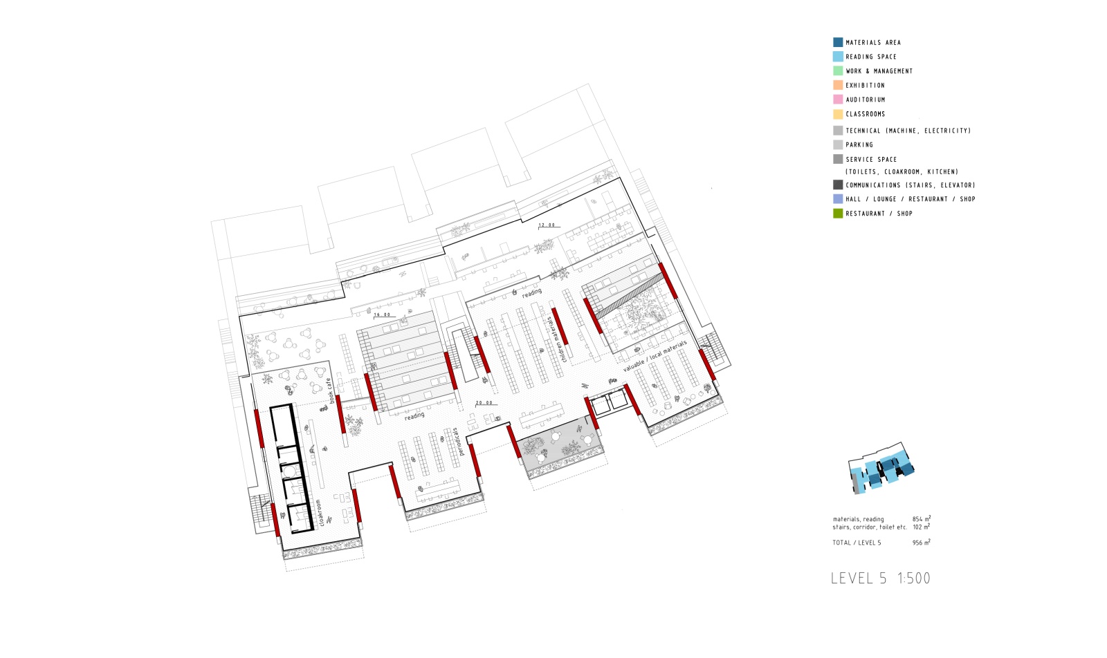 The main structure is materialized in red pigmented concrete cast on site to symbolize energy, the sun and life force of culture and creation. It dramatically contrasts the grey residential towers, and complements the lush greenery beneath. Series of red protruding terraces are heavily planted so that the lush greenery from the surrounding public spaces and the Golf Club literally climbs the Library building, turning it into a calming vertical garden of cultural prosperity. The green south façade purifies the air, and protects the interior of the library from city noise and pollution. The entire structure is designed to be naturally ventilated, so that when strategically positioned windows on the large glazed roof on the north are mechanically opened, the air flows freely between the planted southern terraces and the glazed northern roof, through the open reading spaces in between, thus creating a pleasant atmosphere of being outside. When the windows are closed, the building can be mechanically air-conditioned.