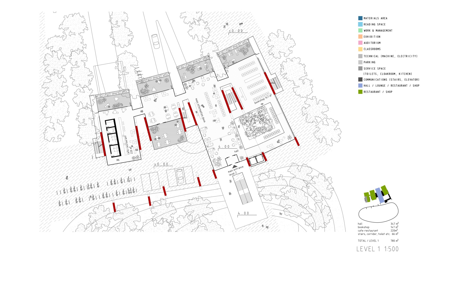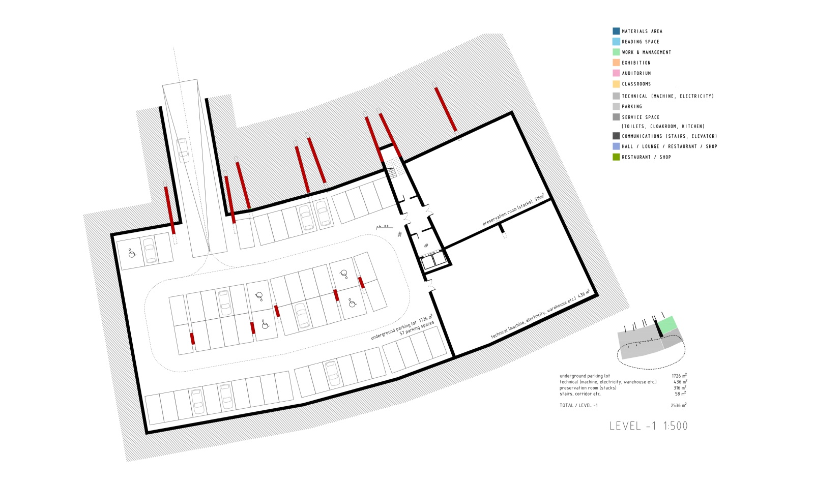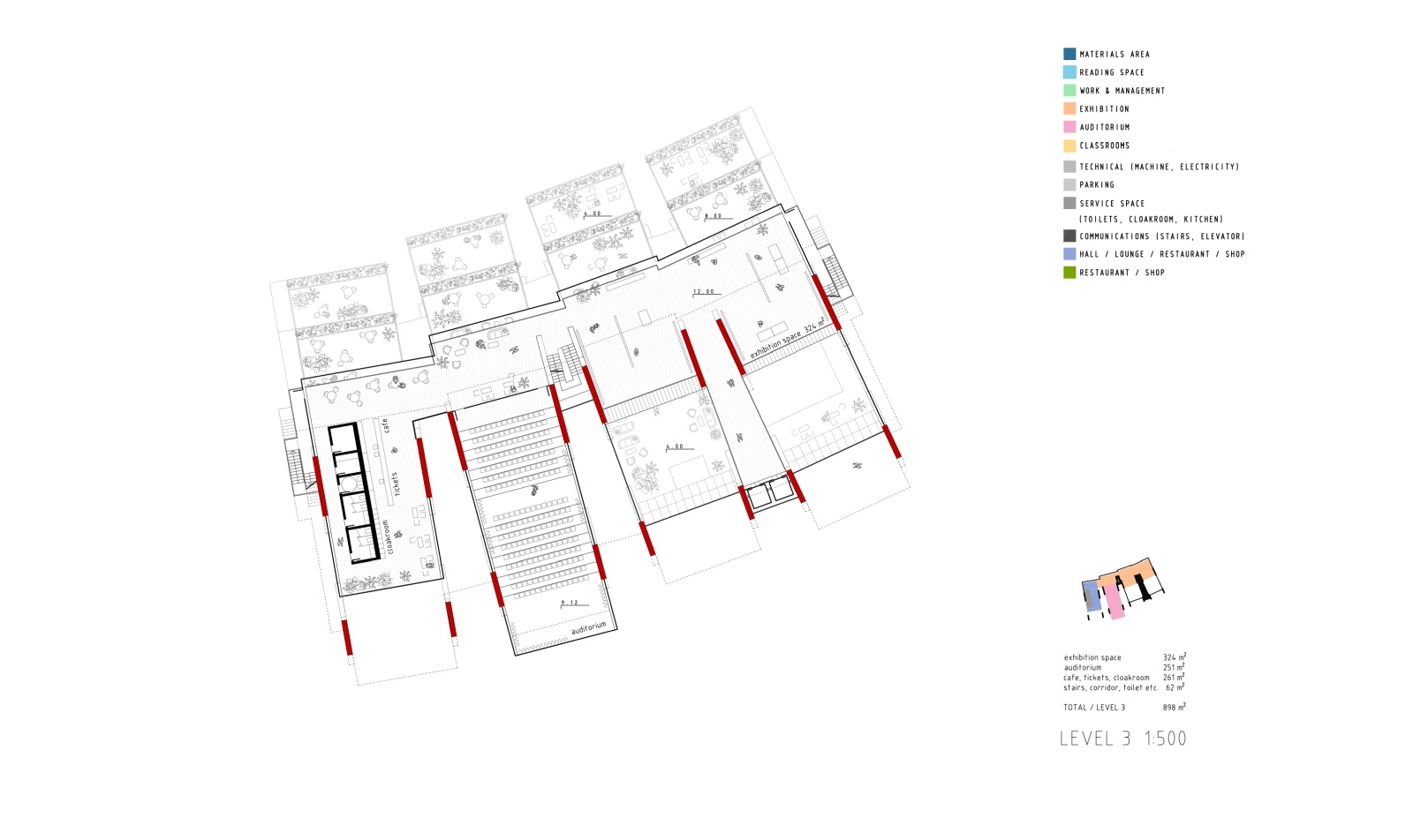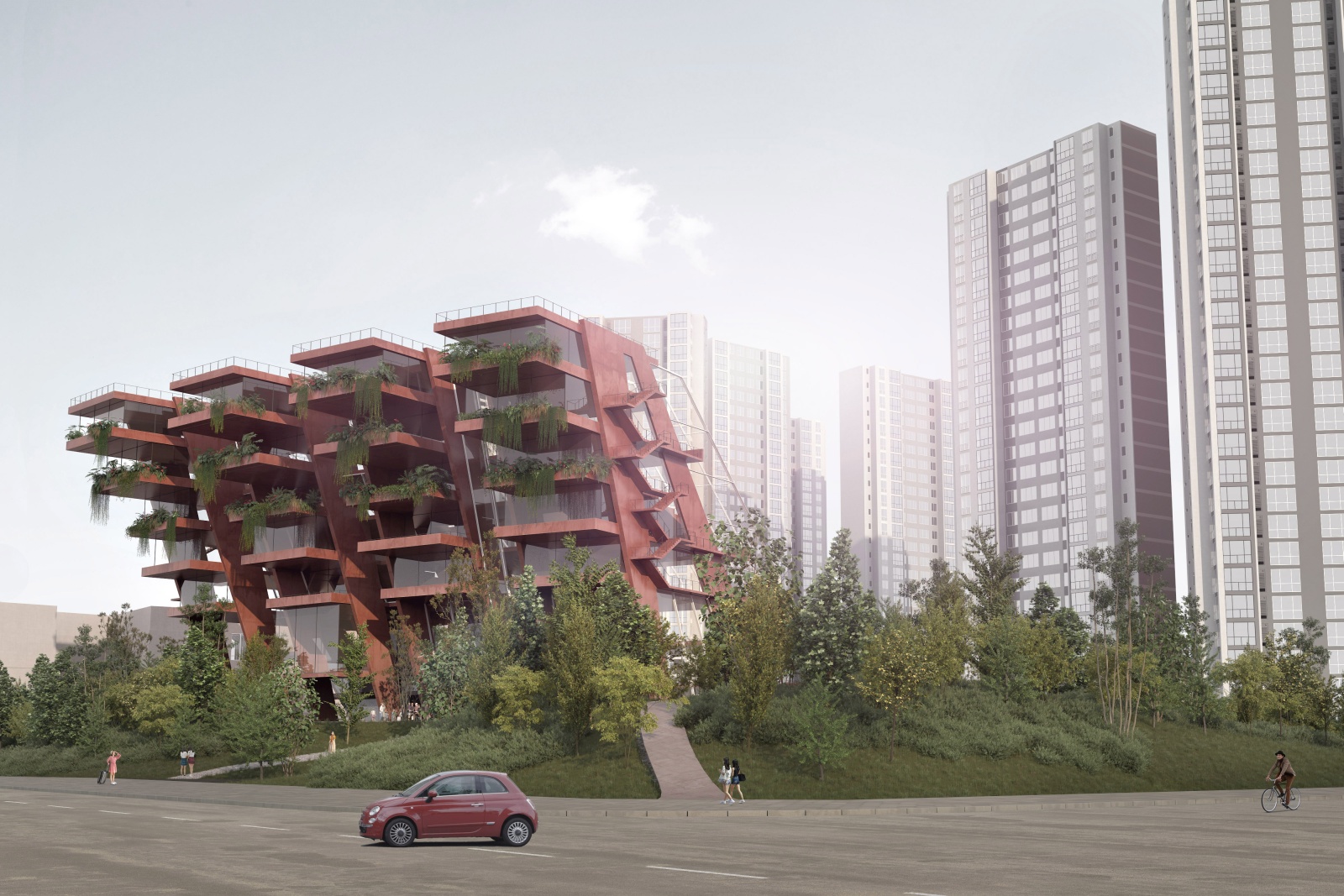 The main structure is materialized in red pigmented concrete cast on site to symbolize energy, the sun and life force of culture and creation. It dramatically contrasts the grey residential towers, and complements the lush greenery beneath. Series of red protruding terraces are heavily planted so that the lush greenery from the surrounding public spaces and the Golf Club literally climbs the Library building, turning it into a calming vertical garden of cultural prosperity. The green south façade purifies the air, and protects the interior of the library from city noise and pollution. The entire structure is designed to be naturally ventilated, so that when strategically positioned windows on the large glazed roof on the north are mechanically opened, the air flows freely between the planted southern terraces and the glazed northern roof, through the open reading spaces in between, thus creating a pleasant atmosphere of being outside. When the windows are closed, the building can be mechanically air-conditioned.