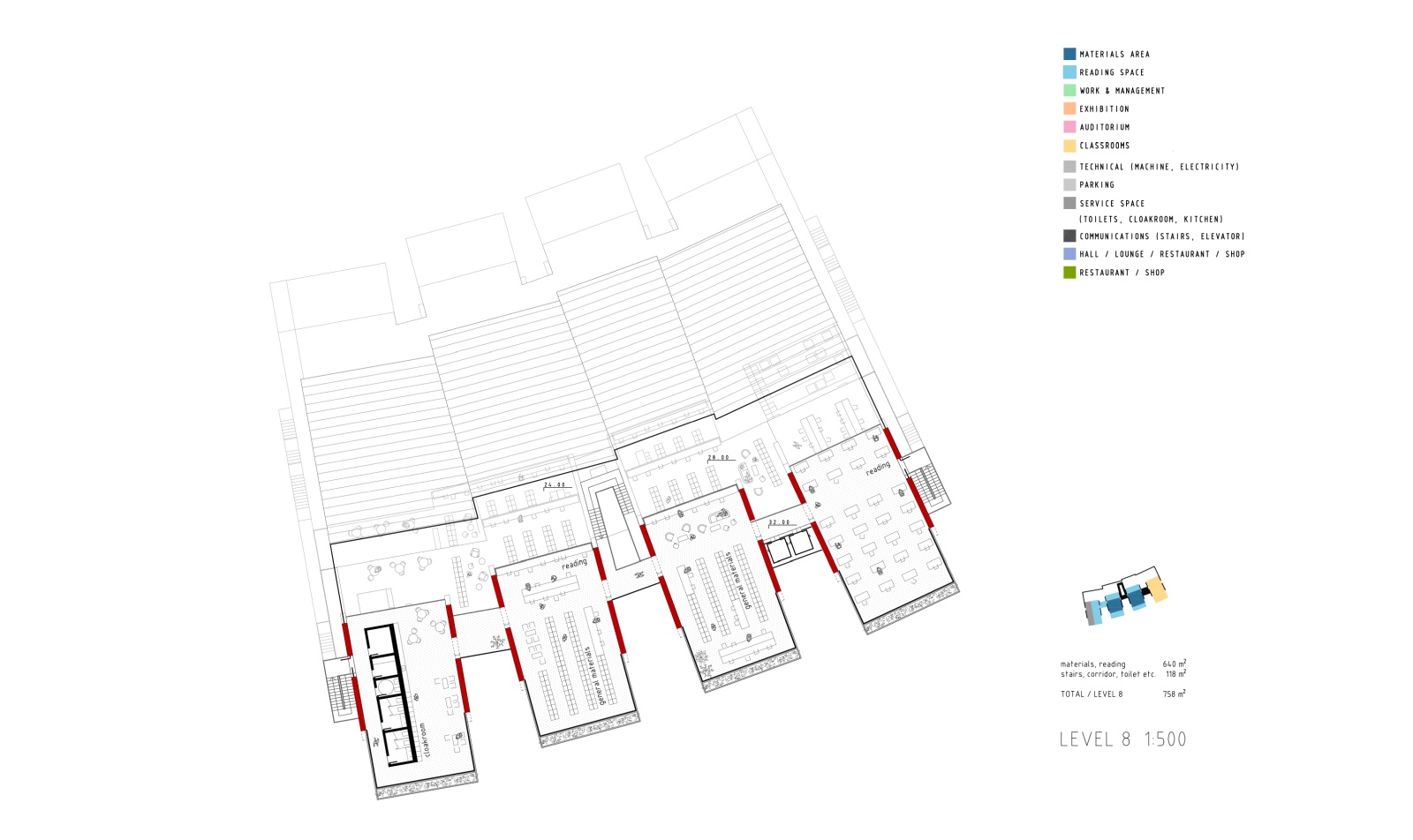 This system opens vast opportunities for an open user-oriented space plan on the inside. The main reading space is located on the cascading amphitheatre-like space on the north, under a large glazed roof. Multiple layers of radially spreading reading terraces overlook the northern sky and plans of residential towers overlaping in the distance, while mutually interconnecting visually, creating opportunities for spontaneous encounters, exchange of ideas, and collaborative working. This space forms a vertical culturescape, a manmade reading landscape under one large roof, and ultimately under the sky.