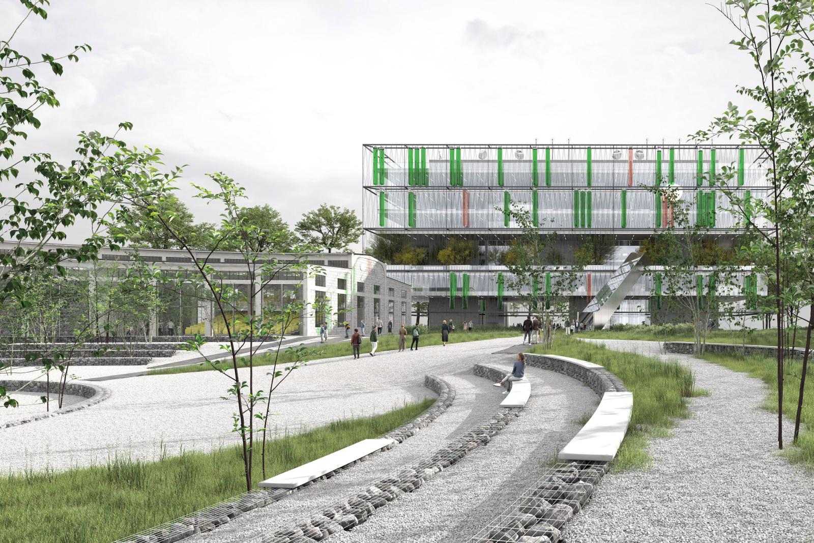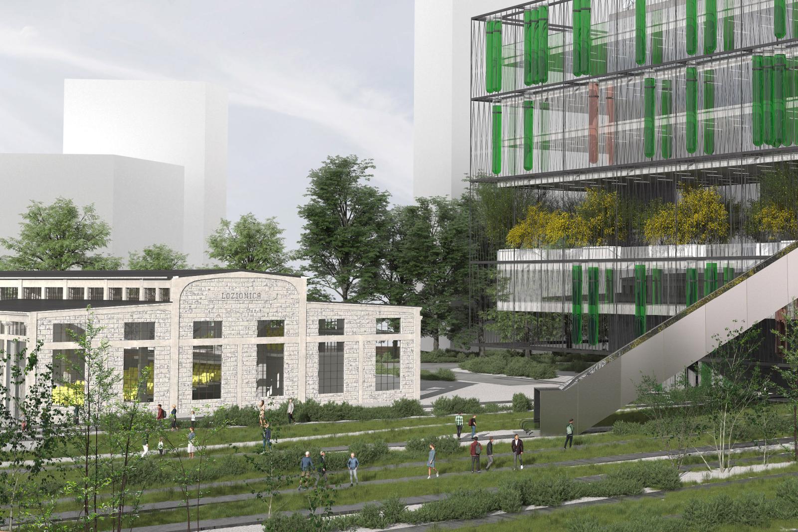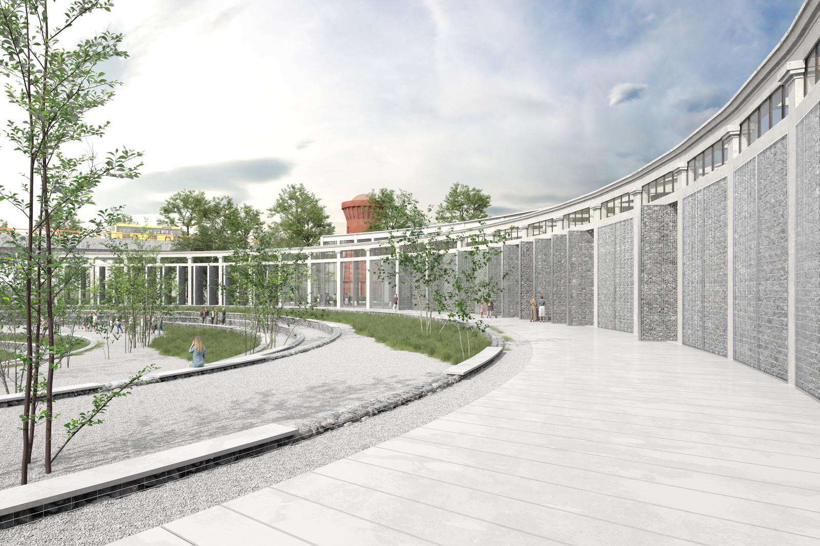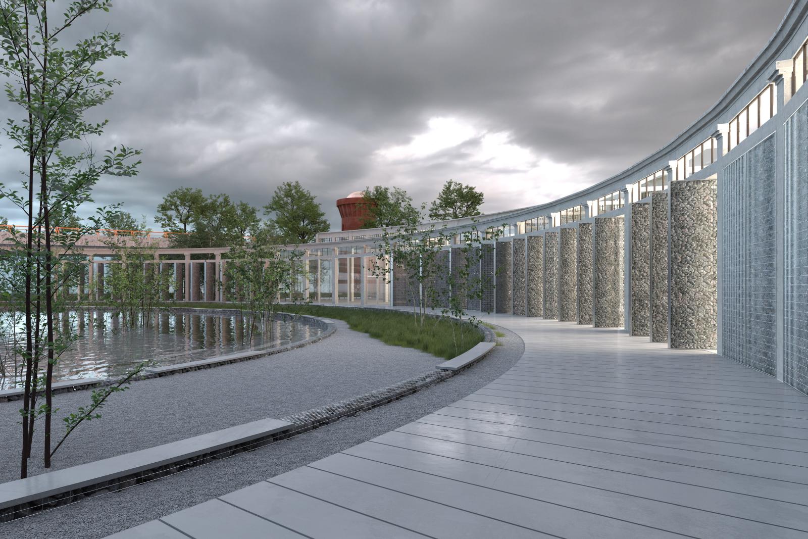 Materijalizacijom novoizgrađenih struktura na lokaciji projekat teži ponovnom ozdravljenju jedinstvene celine koju sada čine Ložionica, Vodotoranj, Aneks i Okretnica sa prirodnim pejzažom u okruženju. Materijalizacija gabionima ispunjenim lokalnim kamenom - kako velikih rotirajućih vrata na mestu ulazaka lokomotiva u Ložionicu, tako i svih kaskada koji čine letnji amfiteatar oko Okretnice, i dalje, kombinacijom sljunkovitih površina sa skoro divlje ozelenjenim zonama evocira se atmosfera stare železnice i vozova. Vodotoranj je u potpunosti rekonstruisan, ali završnom obradom obojen u terakota crvenu nijansu, i služi kao reper u prostoru i znak koji usmerava pogled i kretanje ka Ložionici iz pravca Gazele. Aneks čine savremeni materijali, u duhu progresa kreativne industrije koji predstavlja. Mostarska petlja je mesto ušća Mokroluške reke u Savu. Mokroluška reka teče kroz veštački napravljen podzemni kolektor ispod Autoputa Beograd-Niš, kojim je zatvorena njena prirodna dolina. Lokacija je stoga bogata podzemnim vodama, pa je izrazito sklopa plavljenju tokom jakih olujnih kiša. Novoformirani amfiteatar na mestu Okretnice ujedno služi i kao privremeni kolektor viška olujnih voda, gde podzemne cisterne, šljunkovita podloga i sam volumen amfiteatra privremeno zadržavaju višak vode, i kasnije ga postepeno otpuštaju u okolno zemljano tlo, navodnjavajući ozelenjeni pejzaž. U povremenim, vrednim situacijama mira nakon oluje, ceo otvoreni prostor Okretnice i letnje scene se privremeno transformiše u plitko jezero u kojem se reflektuju obrisi ritmično lučne strukture Ložionice, terakota crveni Vodotoranj, i živopisni koloriti biotehnološke kiseonične opne Aneksa...