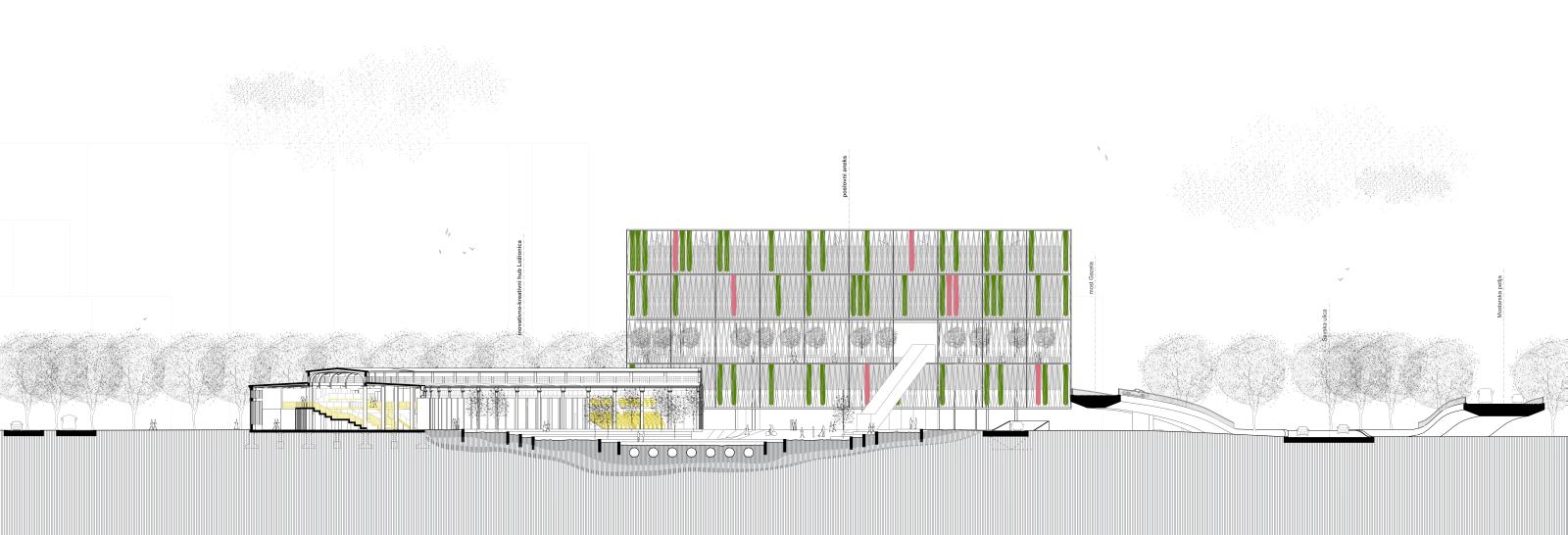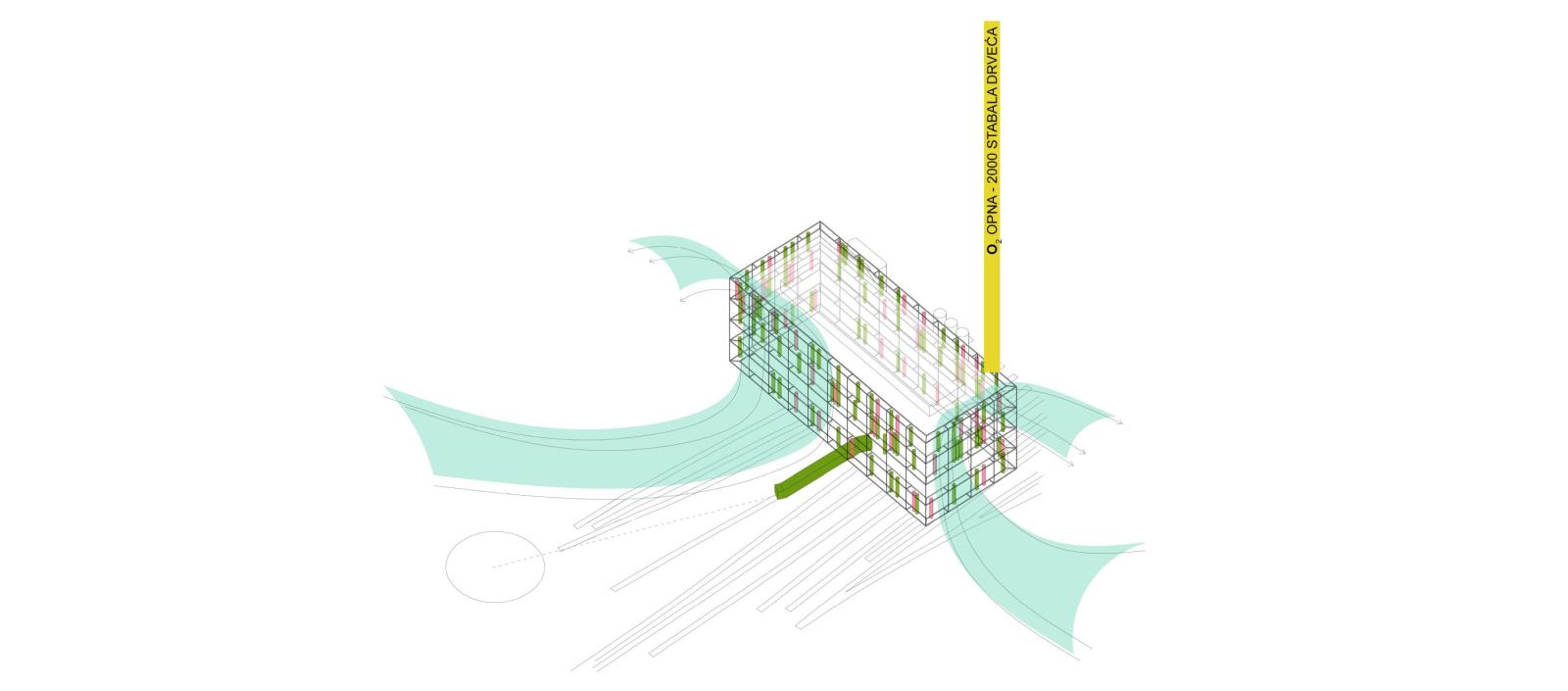 Kao jedna od najprometnijih saobraćajnih petlji, Mostarska petlja je među najkritičnijim tačkama po zagađenju vazduha u Beogradu (prema podacima prikupljanih iz automatske merne stanice koja se nalazi u blizini predmetne lokacije, izvor Zbornik radova 12. Regionalne konferencije „Životna sredina ka Evropi‟ beograd, Srbija 2016). Sa premeštanjem železničke stanice i dodatnim saobraćajnim opterećenjem ove zone, situacija teži da se pogorša u bliskoj budućnosti. Poslovni aneks, u duhu ideje o tehnološkom progresu, dobija kiseoničnu - O2 - opnu koja po sistemu foto-bioreaktora na bazi mikroalgi prečišćava vazduh u neposrednom okruženju, pre svega čineći sredinu za rad ljudi zdravijom, i istovremeno dajući celom kreativno-inovativnom centru novi specifičan identitet kao simbol borbe za zdrav život i okruženje u budućnosti.