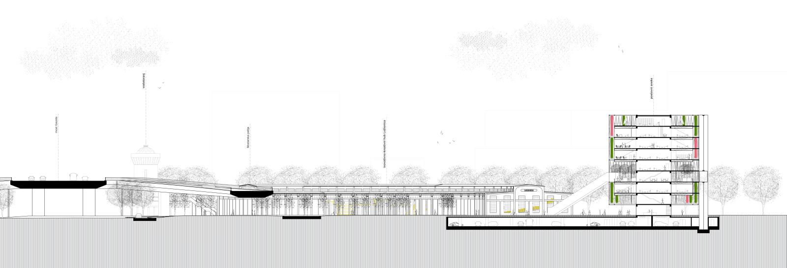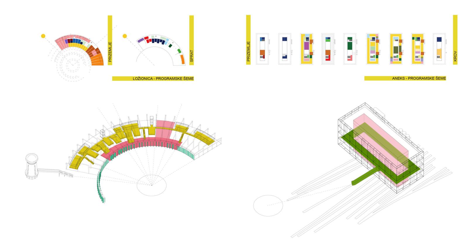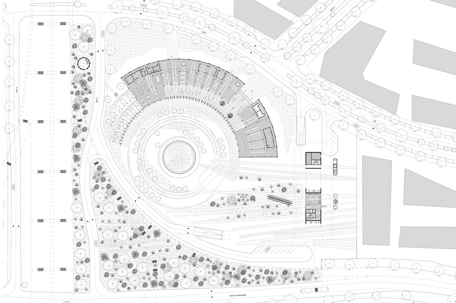 Velika javna ozelenjena terasa se pruža čitavim obimom objekta na visini od 10.5 metara, i do nje direktno vodi zastakljeni eskalator iz pravca pejzaža letnje scene u žiži lokacije. Sa terase se sagledavaju Ložionica, Vodotoranj i Okretnica, kao i celina pejzaža koji ih objedinjuje. Radni prostori aneksa su pozicionirani u krug oko centralnog jezgra, dok su u samom jezgru smeštene komunikacije, servisi i dodatne radne prostorije za sastanke, predavanja, veliki amfitetar… Jezgro je koncipirano tako da se mestimično buši na različitim mestima po spratovima, u odnosu na specifične programe iznutra, ali da celom visinom aneksa pa sve do podzemne javne garaže statički radi kao jedna celina.