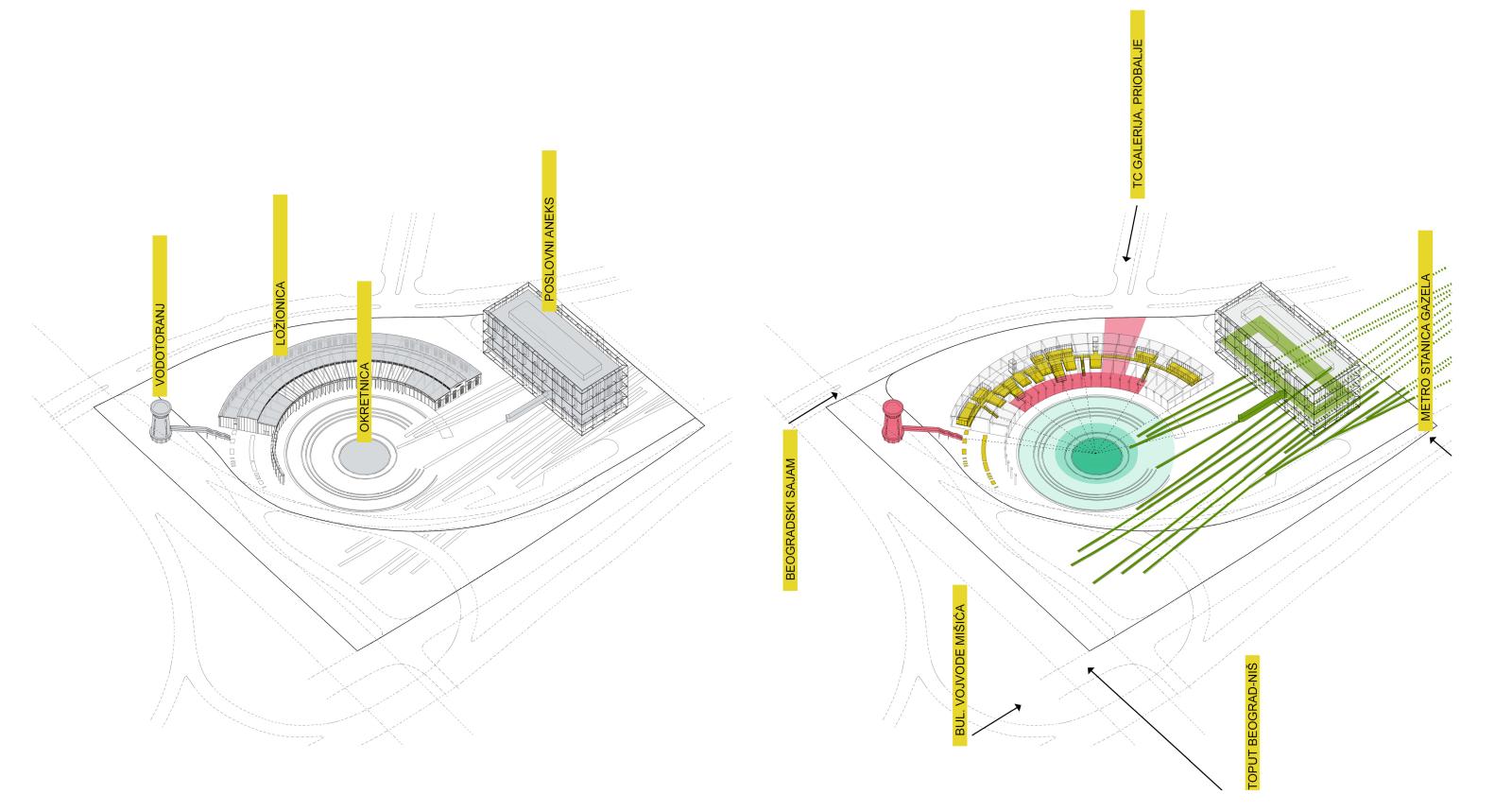 Poslovni aneks je pozicionisan na lokaciji tako da omogući sagledavanje Ložionice, Vodotornja i Okretnice sa svih strana, i da svojom pojavom bude najava nove prekretnice u tehnološkom, kreativnom i naučnom razvoju društva u savremenom trenutku, kao što je to pre tačno jednog veka bila sama Železnica, i pre skoro pola veka Autoput Beograd-Niš i Mostarska petlja na istom mestu. Svojom strukturalnom pojavnošču nalik velikom mehanizmu odiše duhom tehnološkog napretka. Objekat je statički koncipiran tako da su sve etaže okačene na veliko centralno armirano betonsko jezgro, bez stubova, tako da se u zoni prizemlja postigne efekat lebdeće i moćne strukture, i potpuno protočnog prostora ka zoni prolaska od buduće metro stanice Gazela na ulasku u lokaciju.