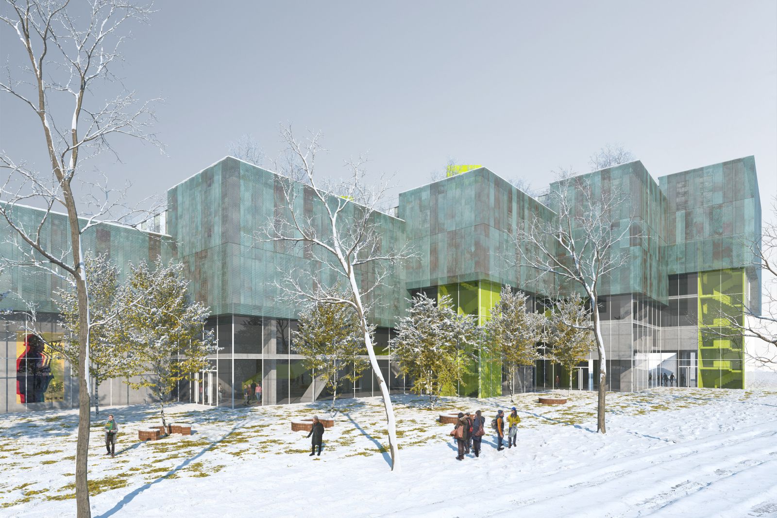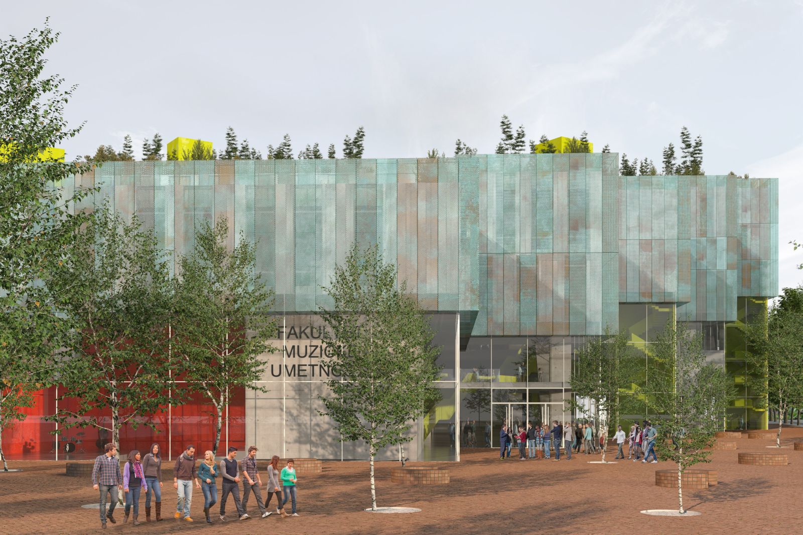 U duhu vredne industrijske prošlosti neposrednog okruženja sa jedne strane i energije mladosti kojom će intenzivno zaživeti ceo prostor, osnovni identitet novoj zgradi Fakulteta muzičke umetnosti daje plavičasta perforirana opna od patiniranog bakra koja obavija prostore za nastavu odignute od nivoa tla, i crveno opekarsko popločanje glavnog platoa, sa zrakastim drvoredima mladih breza ka Dunavskoj ulici i Linijskom parku. Između ova dva sloja je prozračni ulazni hol velikih visina u staklu visoke providnosti, kroz koje se naziru sale i konstruktivni elementi u natur betonu u enterijeru. Cela struktura je suptilno prošarana elementima u jarkim bojama - limeta žute vertikalne komunikacije, koso stepenište u holu i vežbaonice na krovovima, i mak crveni enterijer džez sale koja proviruje ka glavnom platou. Fasade ka krovnim terasama odlikuje belina, i ritmično ređanje prozora sa staklom suptilno zelenkaste nijanse providnosti. Ravni krovovi odiđu prirodnošću i neformalnom, zen atmoferom, prevashodno su u belom šljunku ozelenjeni neformalnim grupama bambusa, niskim žbunastim zelenilom i mestimičnim travnatim površinama.
