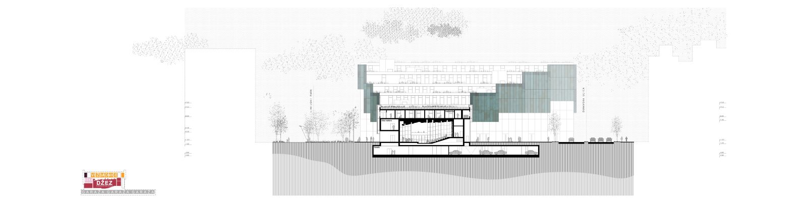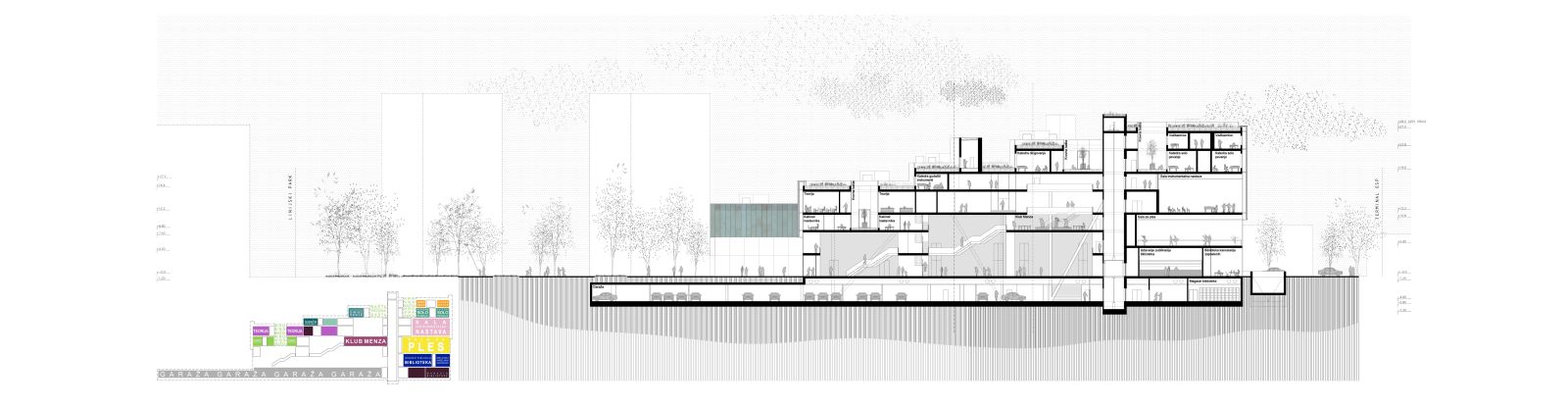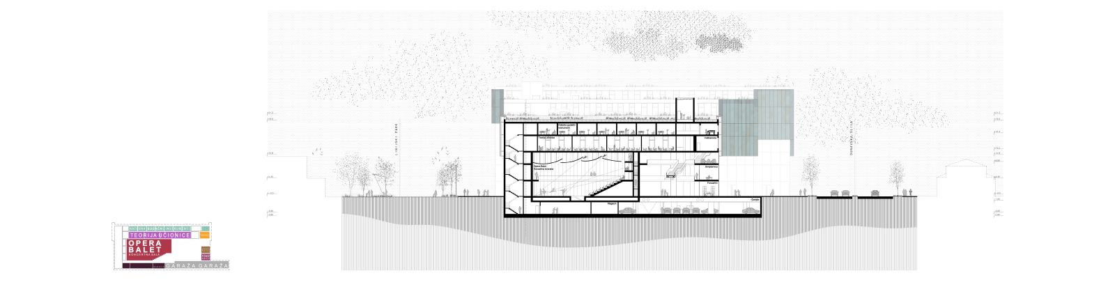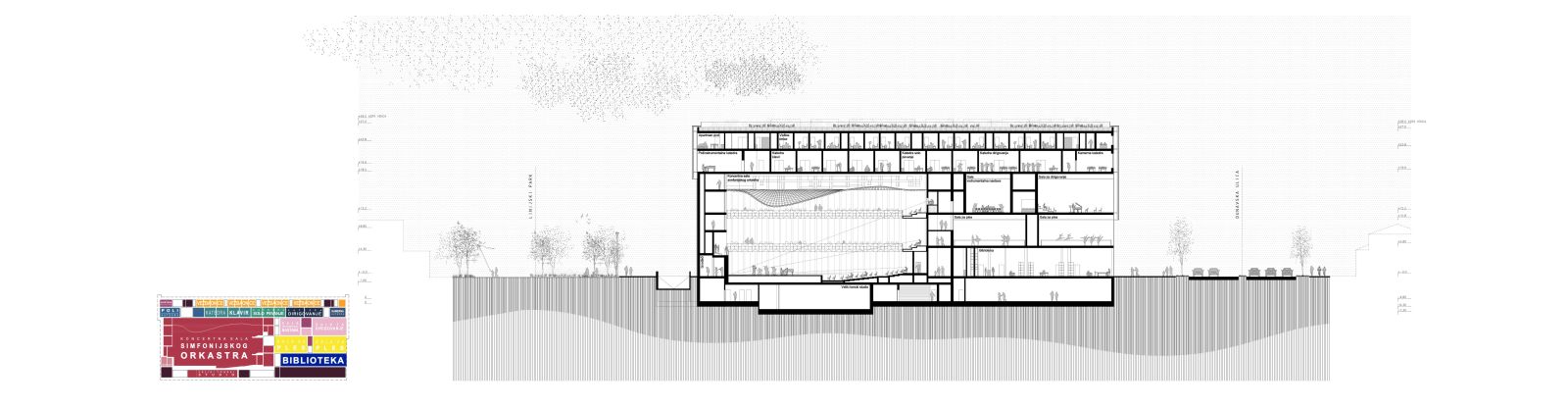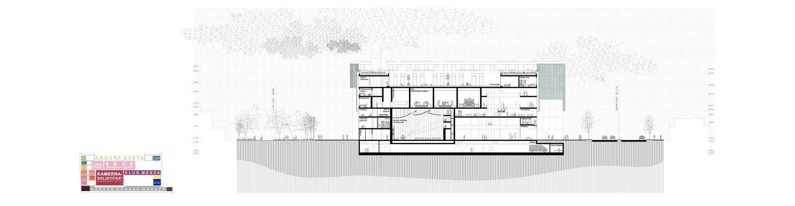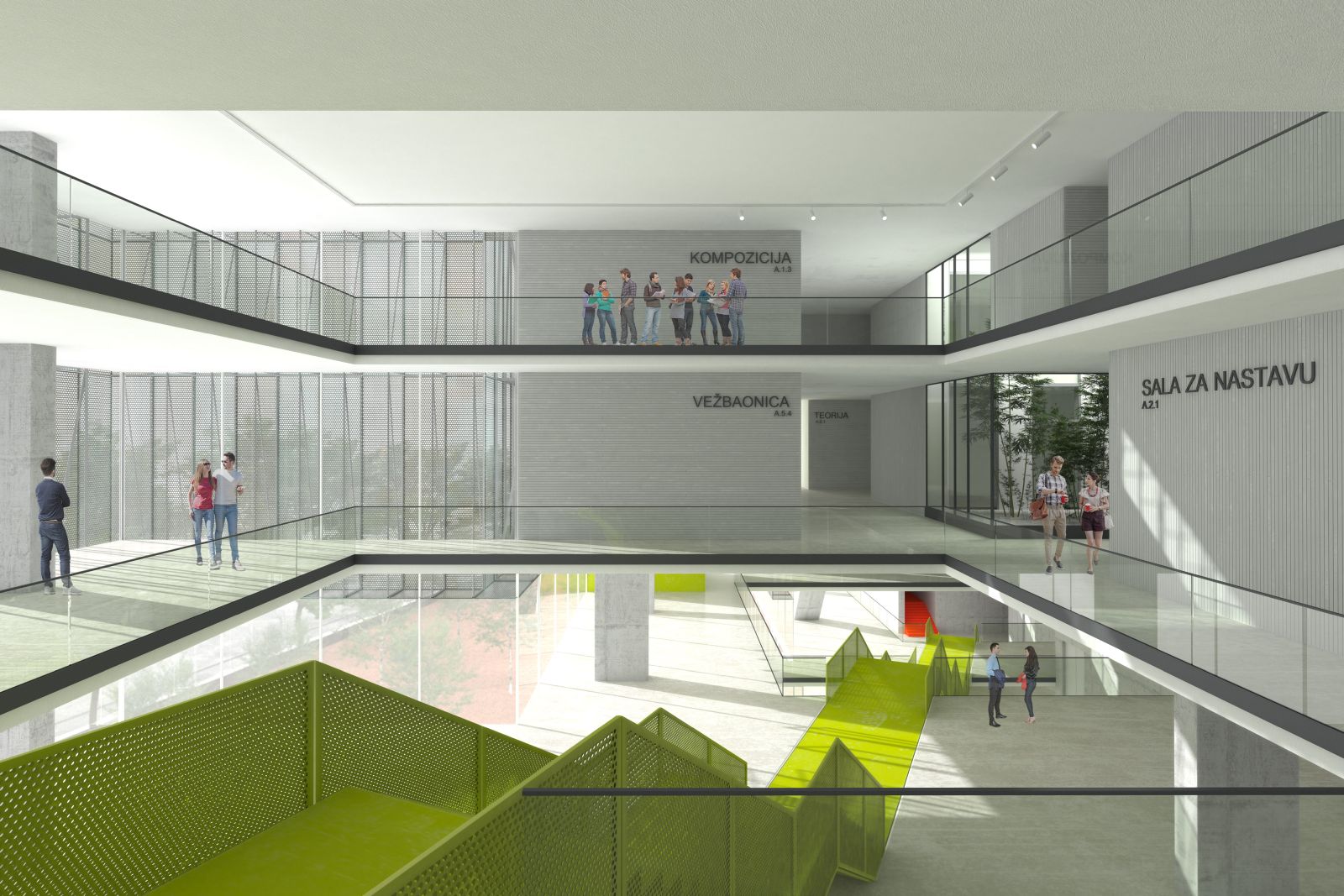 Projekat za novu zgradu Fakulteta muzičke umetnosti u Beogradu nastaje kao rezultat spoja dve vrste energije – energije učenja o muzici i stvaranja muzike, sa energijom velikih okupljanja, kako studentskih, tako i javnih, prilikom izvođenja i kontemplacije muzike. Prostori nastave se terasasto odižu od tla iznad 4 koncertne sale i amfiteatra, formirajući pritom veliki stepenasti ulazni hol uz sale ispod, i niz kaskadnih krovnih bašti uz učionice iznad. Prostori mira i koncentracije, mnoštvo različitih individualnih zvukova koji se paralelno odvijaju u pojedinačnim učionicama orijentisani su ka tišini neba, ka krovnim baštama, ka gradu i niz Dunav u daljini, a zaštićeni su i direktno povezani sa grandioznim događanjima u holu i salama ispod njih. Terase se odižu u visinu u naizmeničnom ritmu od 3 i 4m spratne visine, i to od nivoa prizemlja - 4, 4, 3, 4, 3, 4, 3.