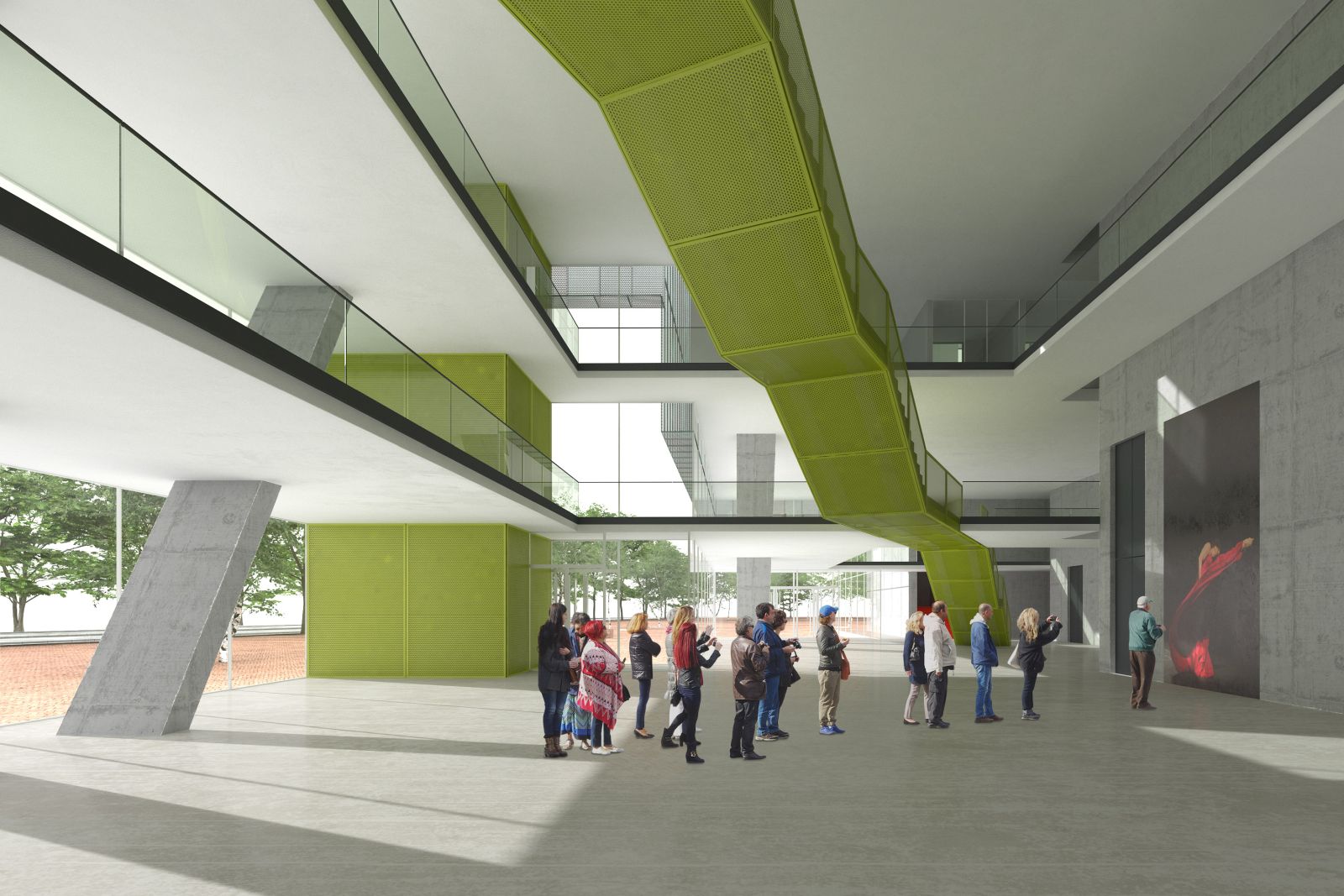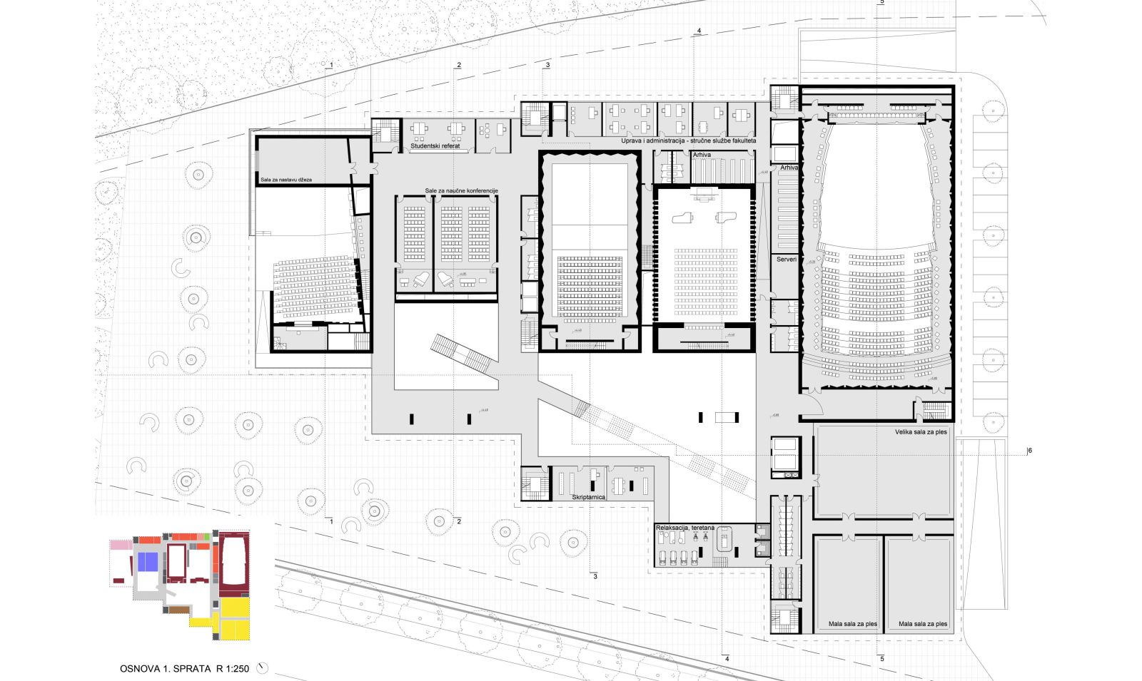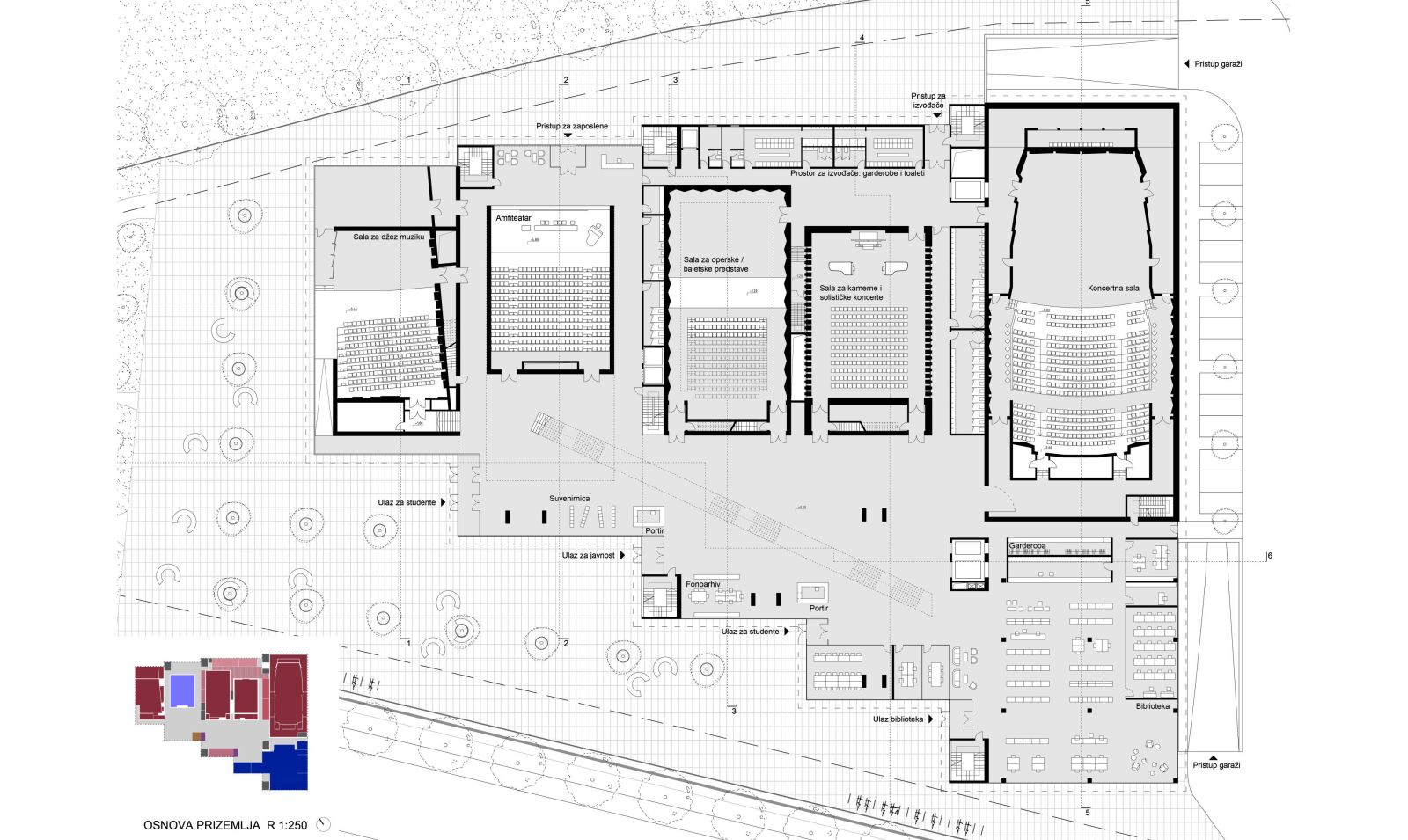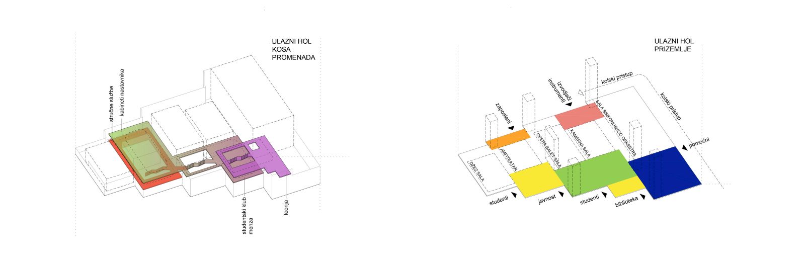 Stepenastim smicanjem u horizontalnom planu formira se više ulaza u zgradu – za studente, za javnost, za biblioteku, za izvođače i unos instrumenata i za zaposlene, što je za instituciju fakulteta i za velika javna okupljanja izuzetno važno. Takođe, time je ulazni hol u nivou prizemlja zoniran u logične pristupne celine, tako da svaki tip korisnika može nesmetano da funkcioniše nezavisno od drugih. Koncertne sale i amfietatar su pozicionirani uz Linijski park, sa pristupom za zaposlene i za izvođače iza njih, dok je veliki ulazni hol za studente i javnost orijentisan ka Dunavskoj ulici na jugozapadu. Javnost ima pristup koncertnim salama direktno iz prizemlja. Najveća koncertna sala za simfonijski orkestar je na krajnjem jugoistoku, uz servisnu saobraćajnicu unutar parcele, dok je sala za džez otvorena ka platou Fakulteta i ka Linijskom parku, uz mogućnost potpunog odvajanja i organizacije pristupa događajima direktno sa platoa. Na delu prizemlja najisturenijem ka Dunavskoj ulici nalazi se biblioteka, koja takođe po potrebi može nezavisno da radi u odnosu na ostatak zgrade fakulteta.