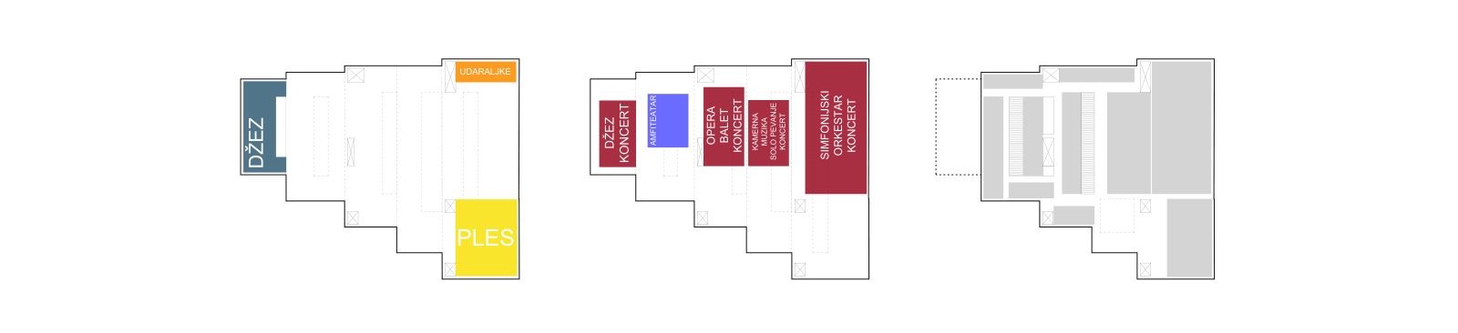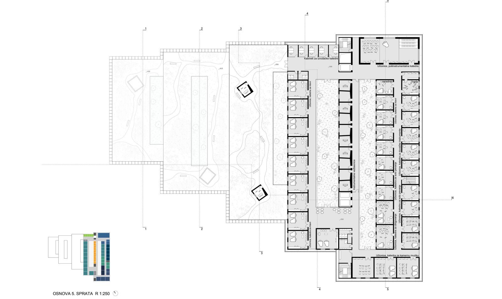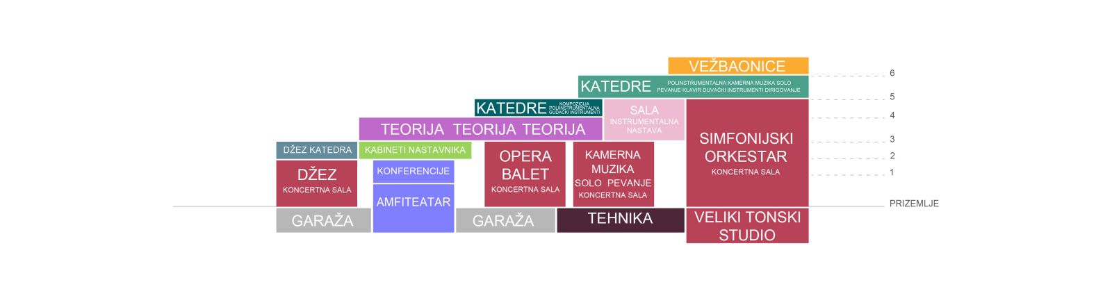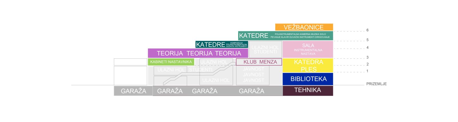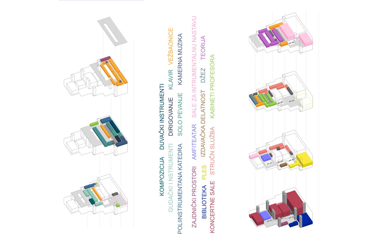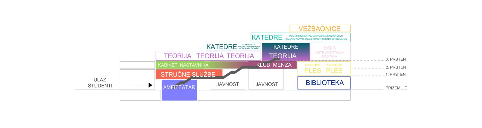 U odnosu na ulazni hol, svi prostori za nastavu se terasasto nižu na gore, prateći stepenasti rast koncertnih sala ispod njih. Na najnižem delu (nivo 2), odmah iznad koncertne sale za džez je katedra za džez, isturena ka Linijskom parku i platou Fakulteta, izdvojena i time izolovana od ostatka zgrade. Na ovom nivou su svi kabineti nastavnika (vezani za teoriju na nivou iznad), kao i studentski klub i menza u prostoru ulaznog hola, na drugom prstenu. Nivo 3 je glavni sabirni nivo za sve prostore nastave, i na njemu su organizovane učionice za teorijsku nastavu koju sve katedre pohađaju zajedno. Na ovom nivou su i velike sale za instrumentalnu nastavu i ispite. Nivoi 4 i 5 pripadaju pojedinačnim katedrama sa učionicama za instrumentalnu nastavu, i to prema potrebnim visinama prostorija - na nivou 4 (visina 3m) su katadra za gudačke instrumente, za kompoziciju i deo poliinstrumentalne katedre, dok su na nivou 5 (visina 4m) katedre za kamernu muziku, solo pevanje, klavir, duvačke instrumente, dirigovanje i drugi deo poliinstrumentalne katedre (harfa i udaraljke). Nivo 6 je najviši i pripada najvećem broju vežbaonica, koje su time odvojene od ostatka zgrade, i zvučno i po pitanju privatnosti, i imaju direktan pristup liftovima iz ulaznog hola u prizemlju. Ostatak vežbaonica je disperzno raspoređen po zgradi na drugim nivoima, dok je 6 vežbaonica u otvorenom prostoru na zelenim krovovima, gde se formira poseban prirodni ambijent za susret studenta i muzike 1 na 1. Tri zvučno najintenzivnija prostora - katedra za džez, poliinstrumentalna katedra za udaraljke, i katedra za ples - su pozicionirane u tri krajnje tačke horizontalnog plana Fakulteta, i to džez ka parku i glavnom platou, ples ka Dunavskoj ulici (kao specifična vizura iz ulice ka školi), a udaraljke ka Dunavu i Linijskom parku na severoistoku. Uprava i administracija fakulteta su smeštene u nivoima iza koncertnih sala, u privatnijoj zoni ka Linijskom parku, zaštićene su od glasnog ulaznog hola, sa pogledom ka Dunavu i Termoelektrani „Snaga i svetlost‟ - stručne službe su na nivou 1, uprava i kabineti nastavnika na nivou 2, apartmani za gostujuće predavače na najvišem nivou 6, radi privatnosti i tišine, a pomoćne službe u podzemnom nivou. Amfiteatar, sale za konferencije, kabineti nastavnika za teorijsku nastavu, i sale za teorijsku nastavu su grupisane na istoj vertikali, povezani direktnim liftovima i stepenicama, sa ulaskom u amfitetar iz najvećeg rpostora na nivou prizemlja.