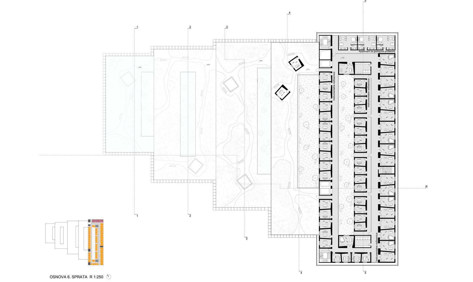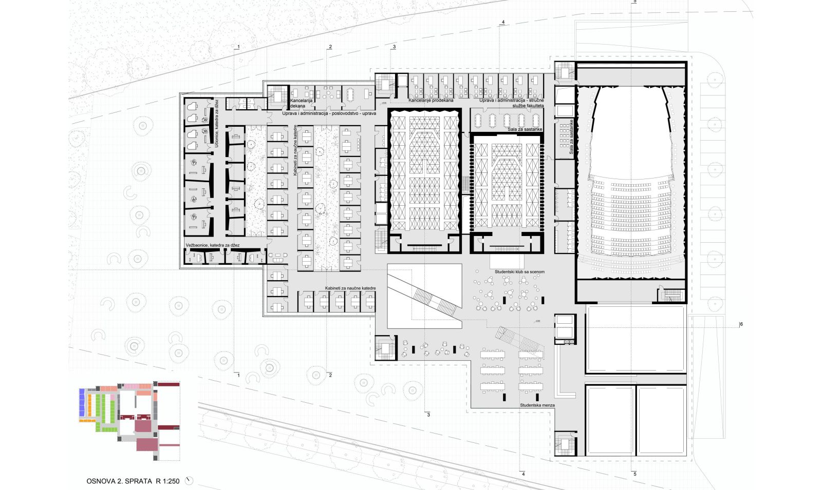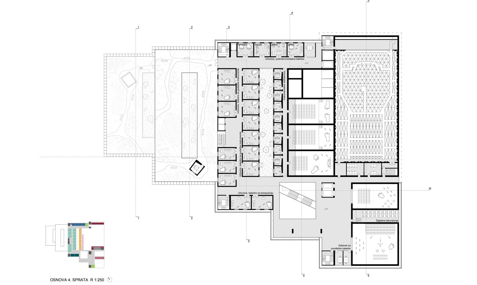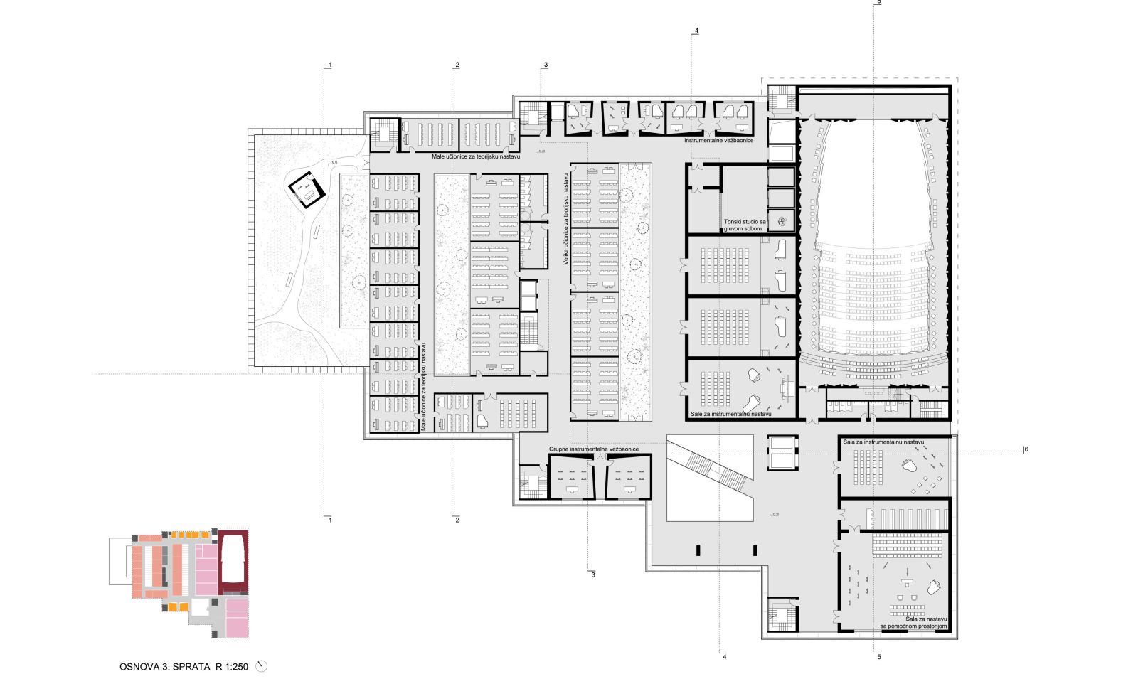 U odnosu na ulazni hol, svi prostori za nastavu se terasasto nižu na gore, prateći stepenasti rast koncertnih sala ispod njih. Na najnižem delu (nivo 2), odmah iznad koncertne sale za džez je katedra za džez, isturena ka Linijskom parku i platou Fakulteta, izdvojena i time izolovana od ostatka zgrade. Na ovom nivou su svi kabineti nastavnika (vezani za teoriju na nivou iznad), kao i studentski klub i menza u prostoru ulaznog hola, na drugom prstenu. Nivo 3 je glavni sabirni nivo za sve prostore nastave, i na njemu su organizovane učionice za teorijsku nastavu koju sve katedre pohađaju zajedno. Na ovom nivou su i velike sale za instrumentalnu nastavu i ispite. Nivoi 4 i 5 pripadaju pojedinačnim katedrama sa učionicama za instrumentalnu nastavu, i to prema potrebnim visinama prostorija - na nivou 4 (visina 3m) su katadra za gudačke instrumente, za kompoziciju i deo poliinstrumentalne katedre, dok su na nivou 5 (visina 4m) katedre za kamernu muziku, solo pevanje, klavir, duvačke instrumente, dirigovanje i drugi deo poliinstrumentalne katedre (harfa i udaraljke). Nivo 6 je najviši i pripada najvećem broju vežbaonica, koje su time odvojene od ostatka zgrade, i zvučno i po pitanju privatnosti, i imaju direktan pristup liftovima iz ulaznog hola u prizemlju. Ostatak vežbaonica je disperzno raspoređen po zgradi na drugim nivoima, dok je 6 vežbaonica u otvorenom prostoru na zelenim krovovima, gde se formira poseban prirodni ambijent za susret studenta i muzike 1 na 1. Tri zvučno najintenzivnija prostora - katedra za džez, poliinstrumentalna katedra za udaraljke, i katedra za ples - su pozicionirane u tri krajnje tačke horizontalnog plana Fakulteta, i to džez ka parku i glavnom platou, ples ka Dunavskoj ulici (kao specifična vizura iz ulice ka školi), a udaraljke ka Dunavu i Linijskom parku na severoistoku. Uprava i administracija fakulteta su smeštene u nivoima iza koncertnih sala, u privatnijoj zoni ka Linijskom parku, zaštićene su od glasnog ulaznog hola, sa pogledom ka Dunavu i Termoelektrani „Snaga i svetlost‟ - stručne službe su na nivou 1, uprava i kabineti nastavnika na nivou 2, apartmani za gostujuće predavače na najvišem nivou 6, radi privatnosti i tišine, a pomoćne službe u podzemnom nivou. Amfiteatar, sale za konferencije, kabineti nastavnika za teorijsku nastavu, i sale za teorijsku nastavu su grupisane na istoj vertikali, povezani direktnim liftovima i stepenicama, sa ulaskom u amfitetar iz najvećeg rpostora na nivou prizemlja.