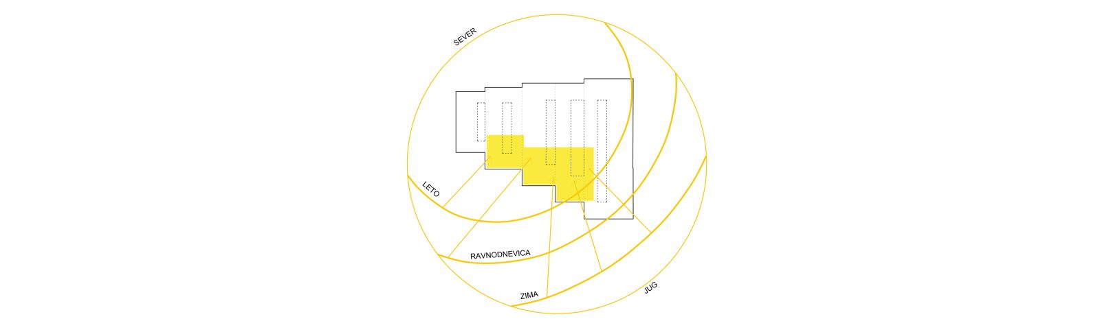 Stepenovanje volumena zgrade u vertikalnom i horizontalnom planu ka jugu i zapadu doprinosi da su glavni ulazni hol i zajednički prostori studenata ka Dunavskoj ulici na jugu direktno osunčani tokom većeg dela dana, pa postaju energetski najvibrantnije mesto Fakulteta - generator kreativnosti i koncentracije studenata i nastavnika. Istovremeno velike visine hola na nivou svakog prstena doprinose upadu dnevnog svetla duboko u unutrašnjost prostora. Sa druge strane, učionice kaskadno padaju ka zapadu, tako da su u večernjim časovima obasjane zalazećim suncem nad terasastim krovnim baštama. Radni prostori nastavnika su orijentisani ka severu, pa tokom dana dobijaju difuzno dnevno svetlo prijatno za rad. Uvođenjem linijskih unutrašnjih dvorišta na poslednjim nivoima, svi prostori za učenje dobijaju svoje prirodno osunčanje i svež vazduh, dok zgrada istovremeno ostaje kompaktna u osnovnom volumenu, pa time jednostavna za grejanje i klimatizaciju bez velikih toplotnih gubitaka. Ujedno, svi prostori nastave na višim nivoima su uvođenjem unutrašnjih dvorišta i kaskadiranjem uvek unakrsno provetreni.